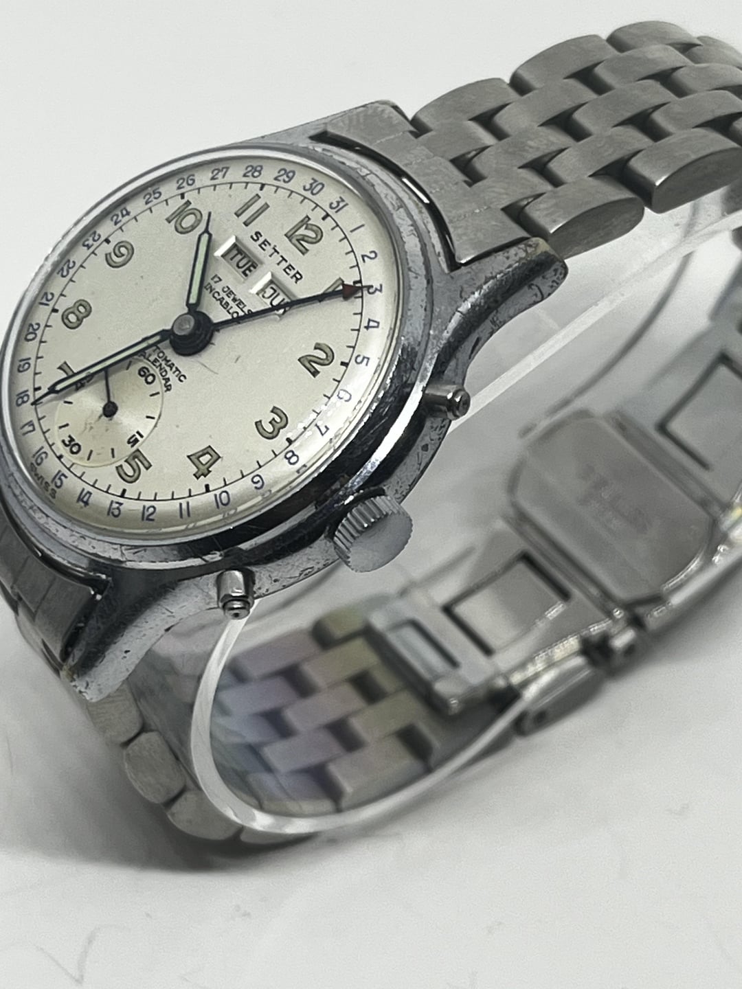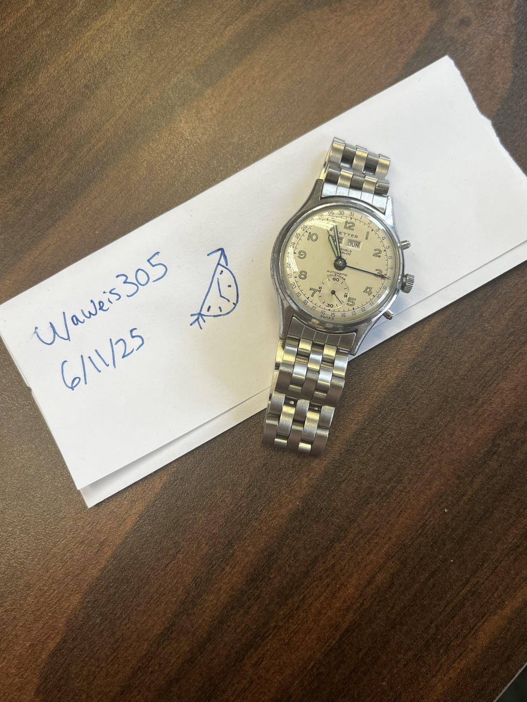 Hi, selling this 1950s(?) triple date watch. The watch is automatic and keeps good time. The dial is super clean, I did some research because I thought it could have been refinished, and I've only seen one other online and my guess would be that its original, but do your own research on this. Watch has these really funky skinny pushers that work perfectly. The watch measures 33mm and comes on a aftermarket bracelet, if you do not want the bracelet I can take $20 off. Case has some dings which is to be expected of a 70 year old watch. Here is the link to the other example I found online in case you wanted to look into it: https://www.watchuseek.com/threads/a-mystery-watch-brand.861977/. Please reach out if you want to see this or any other watch over FaceTime. See all pictures for details and timestamp. Feel free to message, comment, or PM me any questions you may have. Shipping is included in the United States. I accept most forms of major payment. For more vintage watches and first dibs on affordable pieces follow my Instagram at: [Ar.ro.ws](http://ar.ro.ws/)