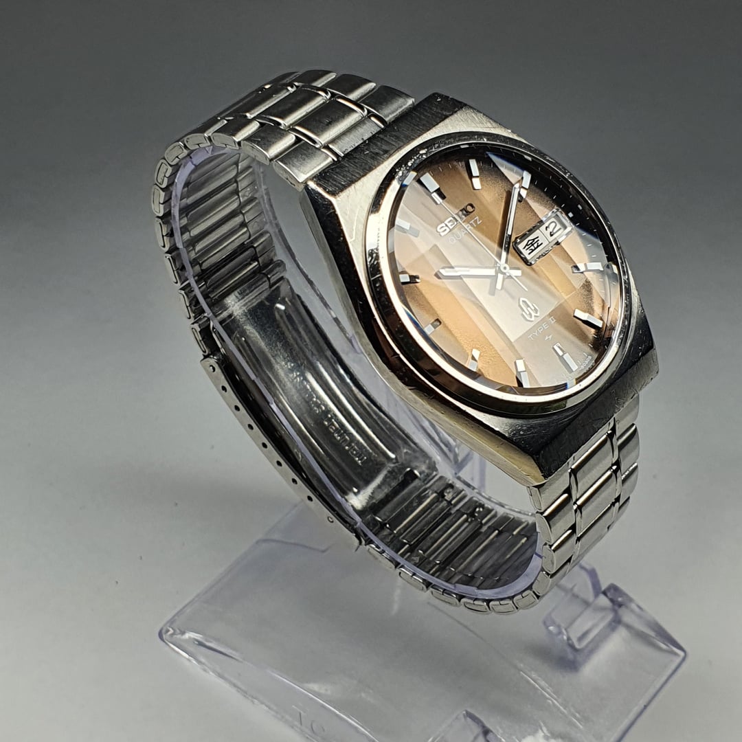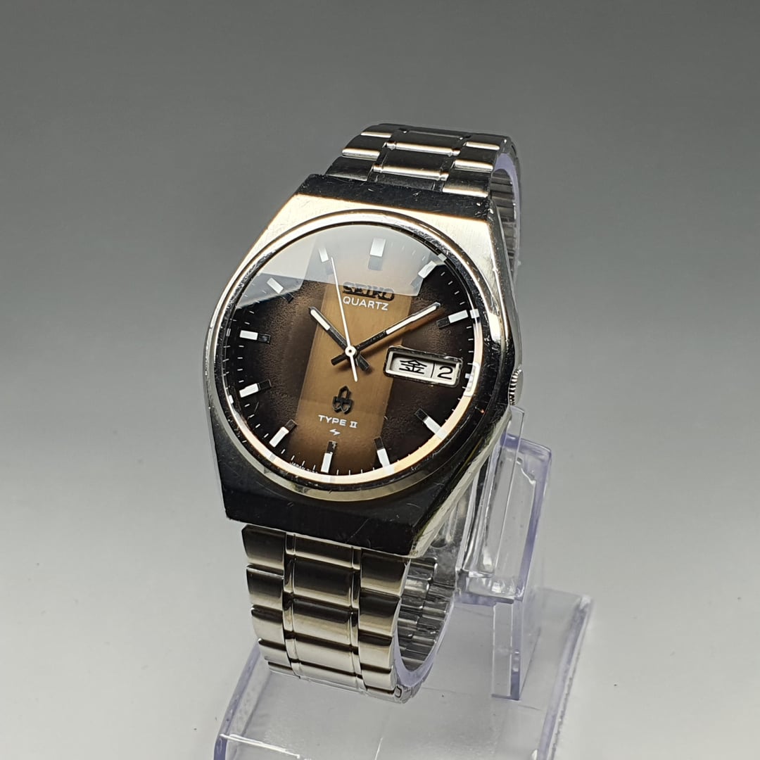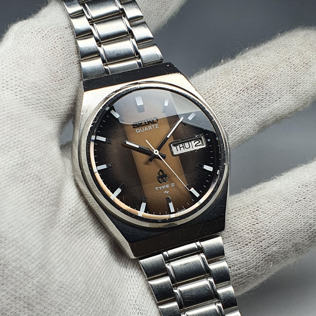 For sale is this vintage Seiko "Type-II" (7123-8020), made in Japan in August of 1978. The Type-II series by Seiko was aimed at making a quartz series of quality that was more affordable than the QT/QR/QZ cal.38 and cal.48 series that preceded it despite most of the line being more expensive than the automatic offerings at the time. They were slimmer and more playful, often with exclusive colorways and dials. This model is a shining example of Seiko's experimentation, exhibiting a brown sunburst fumé dial with a lighter linen stripe down the centre, that I haven't seen done before or since. The markers have two levels with the higher of which is in white. Paired with the white seconds hand and white filled hands, they contrast nicely with the dial for legibility. The Seiko logo and single crystal quartz symbol are applied. The case profile is slim at 9mm and is in its original finish, wearing its age with pride. The side of the case has a mixture of polished and brushed facets. The jewel-like cut crystal further adds to the visual interest of the dial and creates some spectacular distortions. The original worn crystal has been replaced with the same but dead stock genuine Seiko crystal to show off the beautiful dial. The calibre 7123 movement runs great and is a wonder to look at from when quartz was all the rage, being the new technology that would transform the watch industry. The days of the week is bilingual and can be in either Japanese Kanji or English (all in black except Saturday in blue and Sunday in red). Designed and manufactured in the Daini factory during their fierce rivalry with the Suwa factory, as indicated by the lightning bolt symbol at the bottom of the dial and on the case back. Bracelet is an aftermarket "Maruman" (JDM) branded adjustable bracelet. Fits a maximum wrist size of 19cm. Dimensions are: 36mm x 41mm x 9.2mm Lug Width 19mm Bought in Japan. Looking for $165 net (buyer pays Paypal fees) International Tracked Shipping $10 More pics: [https://flic.kr/s/aHBqjChvXL](https://flic.kr/s/aHBqjChvXL) \*Returns accepted but all return postage costs are the buyer's responsibility in all circumstances.