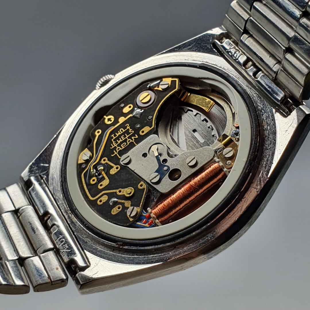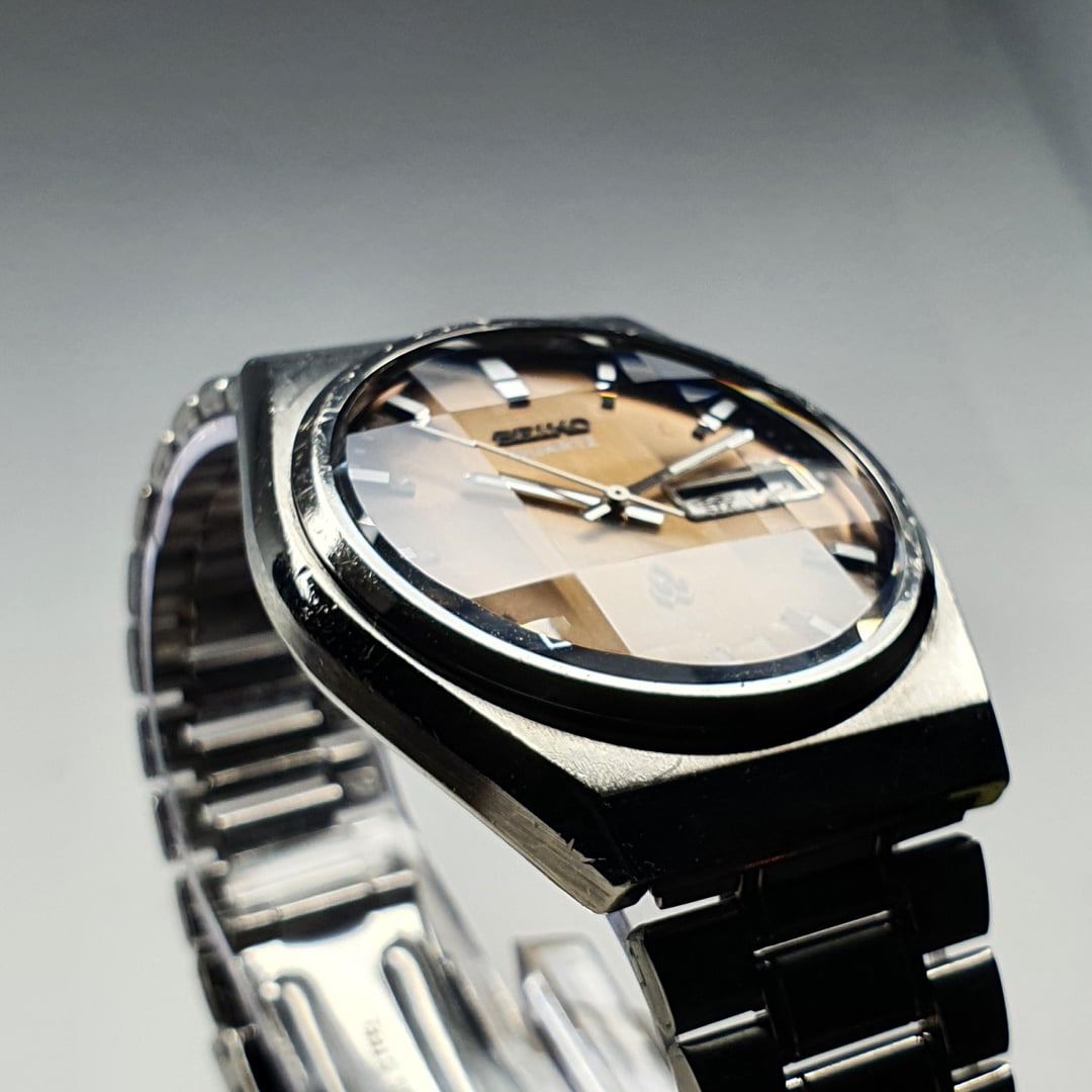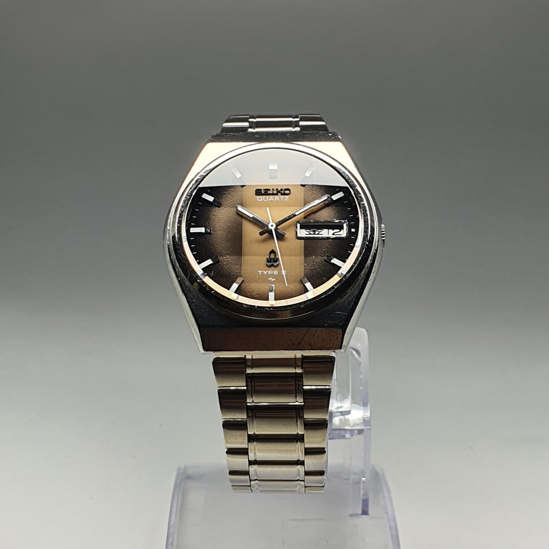 For sale is this vintage Seiko "Type-II" (7123-8020), made in Japan in August of 1978. The Type-II series by Seiko was aimed at making a quartz series of quality that was more affordable than the QT/QR/QZ cal.38 and cal.48 series that preceded it despite most of the line being more expensive than the automatic offerings at the time. They were slimmer and more playful, often with exclusive colorways and dials. This model is a shining example of Seiko's experimentation, exhibiting a brown sunburst fumé dial with a lighter linen stripe down the centre, that I haven't seen done before or since. The markers have two levels with the higher of which is in white. Paired with the white seconds hand and white filled hands, they contrast nicely with the dial for legibility. The Seiko logo and single crystal quartz symbol are applied. The case profile is slim at 9mm and is in its original finish, wearing its age with pride. The side of the case has a mixture of polished and brushed facets. The jewel-like cut crystal further adds to the visual interest of the dial and creates some spectacular distortions. The original worn crystal has been replaced with the same but dead stock genuine Seiko crystal to show off the beautiful dial. The calibre 7123 movement runs great and is a wonder to look at from when quartz was all the rage, being the new technology that would transform the watch industry. The days of the week is bilingual and can be in either Japanese Kanji or English (all in black except Saturday in blue and Sunday in red). Designed and manufactured in the Daini factory during their fierce rivalry with the Suwa factory, as indicated by the lightning bolt symbol at the bottom of the dial and on the case back. Bracelet is an aftermarket "Maruman" (JDM) branded adjustable bracelet. Fits a maximum wrist size of 19cm. Dimensions are: 36mm x 41mm x 9.2mm Lug Width 19mm Bought in Japan. Looking for $165 net (buyer pays Paypal fees) International Tracked Shipping $10 More pics: [https://flic.kr/s/aHBqjChvXL](https://flic.kr/s/aHBqjChvXL) \*Returns accepted but all return postage costs are the buyer's responsibility in all circumstances.