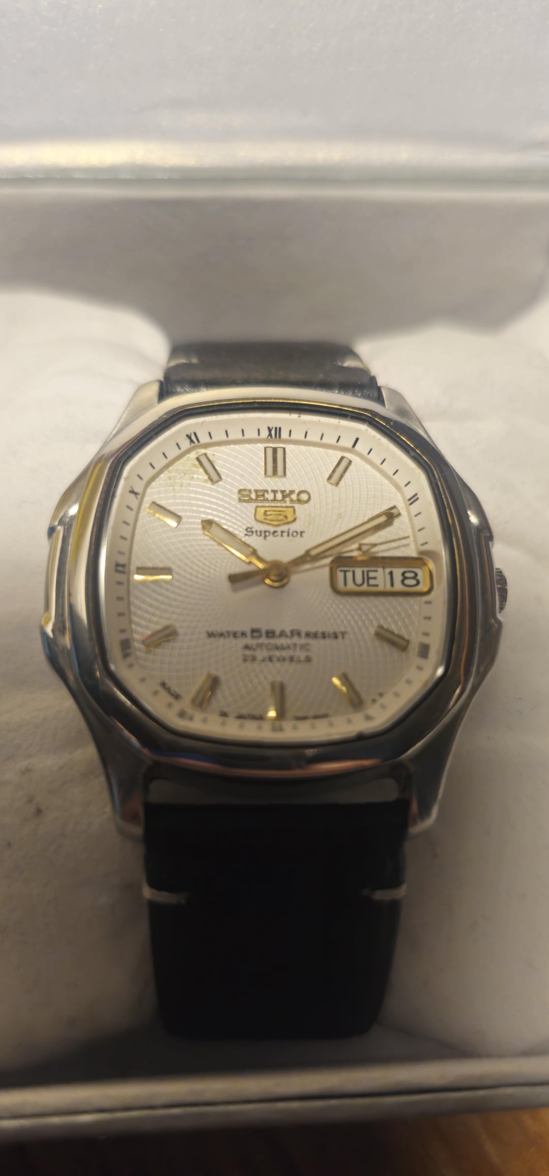 Hello watch exchange; Up for sale is a Seiko 5 Superior, with a rare TV box shape and white coloured whirlpool dial. It is far more beautiful when seen up close, with the whirlpool dial inviting you to stare at the watch for hours. Case measure 36mm across, with a genuine leather strap. 23 Jewels, and 50m Water resistance, this watch is sought after and is a collectors item. Price: $475 with free shipping. I have a preference for PayPal/TransferWise (either PayPal type is fine). Feel free to ask questions, cheers!