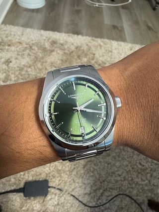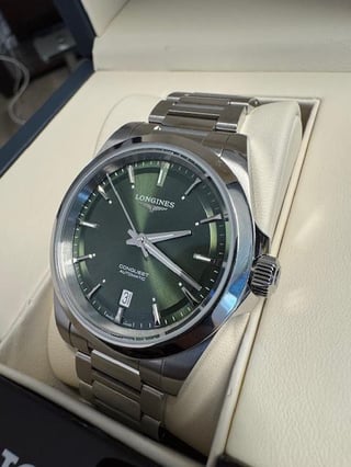 Up for sale is a **Longines Conquest 38mm with the stunning green dial** – a sleek and versatile watch that works great as a daily go-to or weekend standout. **Details:** * Size: 38mm * Dial: Green sunburst * Condition: Excellent overall with minor desk wear on the case/bracelet. Sapphire crystal is flawless. * Movement: Automatic * Full Set: Includes outer box, inner watch box, papers, and all end links This piece punches above its weight for a sporty, elegant automatic – slim profile, solid finishing, and a dial that pops in the light. Only selling to slim down the collection. **Price: $1,250 (net to me)** Payment via PayPal F&F, Zelle, or Venmo. Add fees for G&S if required. Shipping via insured USPS Priority or UPS within CONUS. **No trades at this time.**