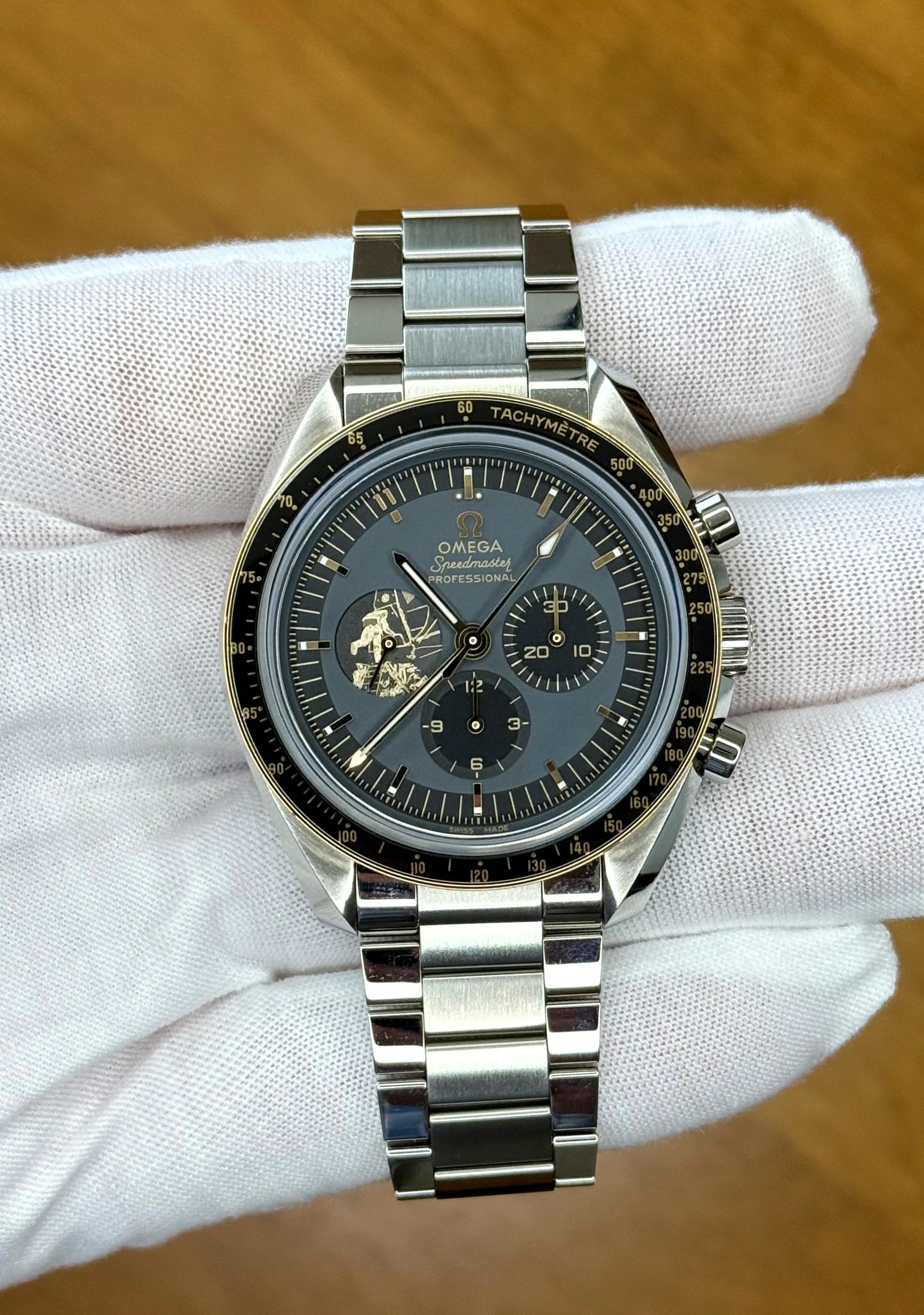 Hello fellow Redditors! I’m offering my Omega Speedmaster Apollo 11 50th Anniversary Limited Edition 41xx/6969 for sale within the United States. The watch is in excellent condition having only been worn a handful of times. The bracelet has been sized to my 6 ¾” wrist. It is possible that there are some imperceptible scratches from bracelet sizing, but I can’t see any. It includes the complete presentation box package (case, lunar lander watch stand, bracelet/strap change tool, loupe, patches, unworn cork/Velcro strap), outer box, shipping box, manual, tags, plastic tag/watch holder, unused cleaning cloth, cards, card holder, bracelet/strap swap instructions, limited edition certificate and bracelet links. Please see pictures – I tried to capture it in various lighting so that you could see its excellent condition. Please note that the serial number and limited edition have been digitally changed for security purposes. Description from Omega’s website: “The Speedmaster is one of OMEGA’s most iconic timepieces, having been a part of all six moon landings. Celebrating the 50th anniversary of Apollo 11 in 1969, OMEGA presents this Limited Edition model of 6,969 pieces. The watch includes a 42 mm case in stainless steel with a polished 18K Moonshine™ Gold bezel. The bezel ring is polished black ceramic \[ZrO2\] with an OMEGA Ceragold™ tachymeter scale. There is a varnished grey and black dial with all indexes and hands in 18K Moonshine™ Gold - except the central chronograph seconds hand, which is PVD-coated in Moonshine Gold. A unique hour marker is positioned at 11 o'clock, and there is a distinctive 9 o'clock subdial in 18K Moonshine™ Gold with a laser-engraved image of Buzz Aldrin climbing down onto the lunar surface. The NAIAD LOCK caseback reveals numerous engravings, while a laser-engraved image of Buzz Aldrin’s footprint is positioned on a medallion under the sapphire crystal. 18K Moonshine™ Gold-plated lettering includes the quote: "THAT’S ONE SMALL STEP FOR A MAN" and "ONE GIANT LEAP FOR MANKIND". The watch is presented on a polished-brushed metallic bracelet and comes with an additional Velcro strap with black-coated cork. Inside, it is powered by the OMEGA Master Chronometer Calibre 3861. Features: Anti-magnetic; Chronograph; Chronometer; Limited edition (6969); Small seconds; Tachymeter Technical Data: Reference: 310.20.42.50.01.001; Between lugs Open Case Measurement Modal: 20 mm; Lug‑to‑lug Open Case Measurement Modal: 47.5 mm; Thickness Open Case Measurement Modal: 13.1 mm; Case diameter Open Case Measurement Modal: 42 mm; Case Material: Steel; Dial color: Black; Crystal: Domed scratch‑resistant sapphire crystal with anti‑reflective treatment on both sides; Water resistance: 5 bar (50 metres / 165 feet); Total product weight (approx.): 138 g; Caliber: Omega 3861; Movement Type: Manual‑winding; Power reserve: 50 hours; Bracelet Material: Steel; Type of Clasp: Foldover clasp” Photos: [https://imgur.com/a/kokbxyc](https://imgur.com/a/kokbxyc) Timestamp: [https://imgur.com/a/dP4L4jw](https://imgur.com/a/dP4L4jw) Price: $12,900 Payment: Bank wire only (which can usually be done easily via bank log on, depending on your bank). Before exchanging banking info, I would like to vett you with Watch Exchange feedback or some other form we can agree on. Feedback: I have 3 logged transactions and 1 unlogged transaction with positive feedback on Watch Exchange. Additionally, I have over 600 100% positive reviews on eBay under the same username – we can exchange messages there for verification. Shipping: Everything will be carefully packaged and shipped via FedEx 2 Day shipping within the continental United States only. Watch will be insured via Secursus while in transit. Direct signature will be required at time of delivery. Shipping is no cost to buyer. At this time, not interested in trades. Thanks for looking! Let me know if you have any questions!