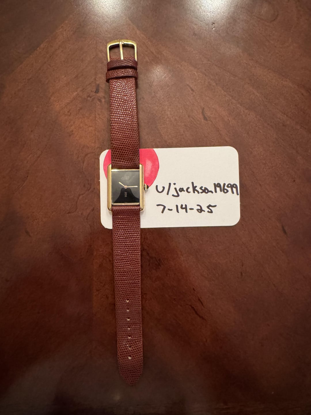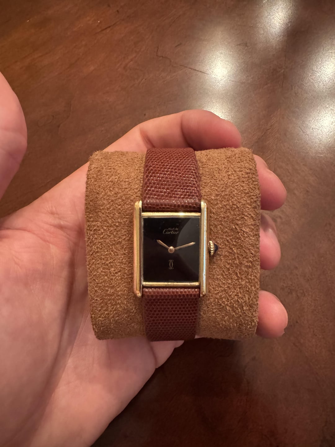 Hi r/Watchexchange, Up for sale is a stunning Must de Cartier Tank from the 1980s, featuring an elegant glossy black lacquer dial in the style of onyx. In certain lighting, the dial reveals a fine “spidering” patina that gives it unique vintage character. Case: 23 x 31mm gold-plated sterling silver (vermeil), in well-preserved vintage condition with light wear consistent with age. Dial: High-gloss black lacquer with a mirror finish, delicate gold hands, and the iconic “double C” Cartier motif at 6 o’clock. Fine, even spidering across the dial adds character and uniqueness. Movement: Manual-wind mechanical Cartier movement, just professionally serviced and running beautifully. Comes with a 1-year service warranty. Service paperwork included. Strap: Mounted on a genuine brown lizard grain leather strap. I’ll also include an additional black leather strap to suit a more formal look. Lug width: 17–18mm (Cartier’s standard hidden lug design). This is a timeless piece with a classic Cartier design. Price: $1999 USD or best offer shipped and insured. Please feel free to reach out, I’m more than happy to answer any questions!