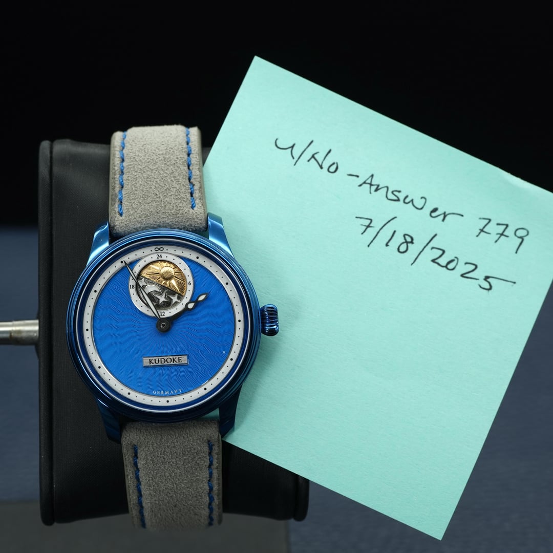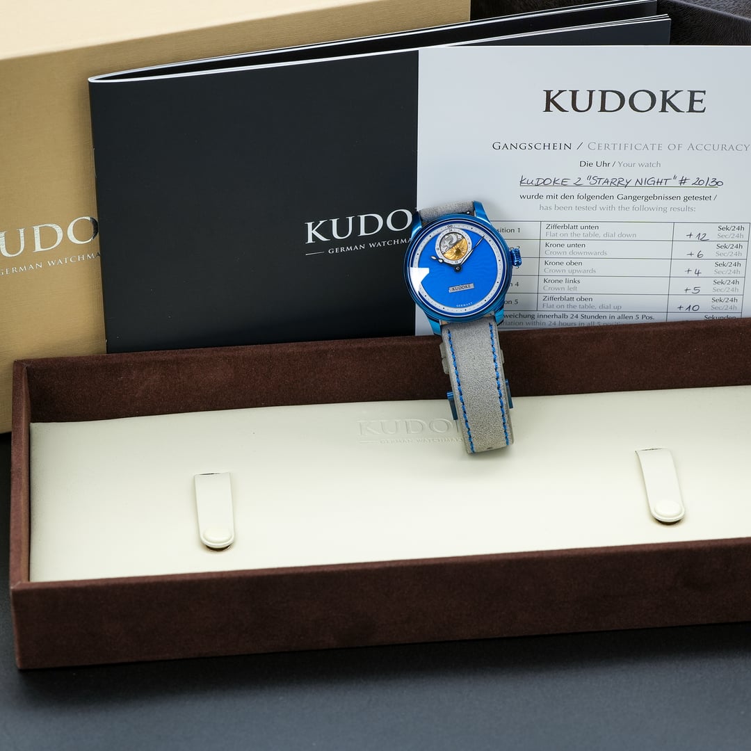**FOR SALE:** Kudoke 2 “Starry Night” – Full Set (#20 of 30) The Kudoke 2 “Starry Night” is a rare masterpiece of independent German watchmaking, limited to just **30 pieces worldwide**—and this one is **#20** in the series. It features a **39 mm Grade 5 titanium case** treated with reflective blue CVD, topped with a stunning **translucent blue guilloché dial** inspired by Van Gogh’s famous painting. The manual-wind **Kaliber 1‑24H** movement comprises 18 jewels, offers a **46‑hour power reserve**, and includes a poetic **hand-engraved balance cock** with a luminous star motif. The 24‑hour day-night sky disc at 12 o’clock glows in low light and completes the artistic narrative. This piece is in **excellent condition**, comes as a full set, and as the collaboration with Wei Koh’s ‘Grail Watch’ would imply, is a true grail for collectors. **Details:** * **Model:** Kudoke 2 “Starry Night” * **Limited Edition:** \#20 of 30 * **Condition:** Excellent * **Year:** 2023 (estimated – paperwork undated) * **Size:** 39 mm * **Water Resistance:** 50 meters * **Movement:** Manual-wind Kaliber 1‑24H * **Power Reserve:** 46 hours **What’s Included:** * Original Box & Papers **Yours for $11,500** **Additional Info:** * **Location:** Washington, DC and Denver, CO * Call/text with any questions: **571‑445‑4697**