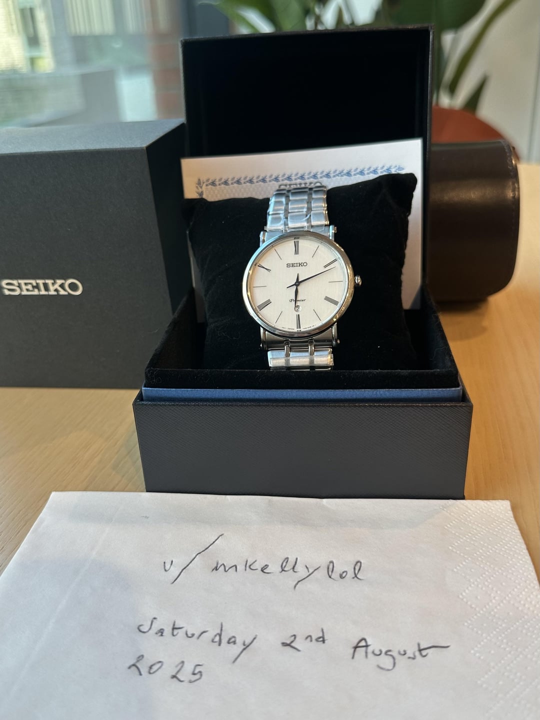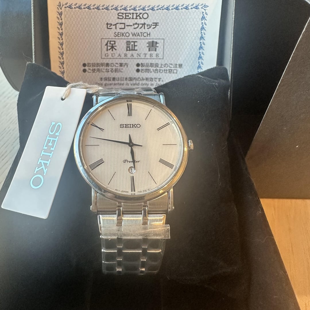 Hi, I’m new to watch collecting and the watch world and I’ve gone a bit overboard with buying too many watches in a short span of time lol… This is one of the few pieces I have that’s in great condition but I don’t think it’s something I’m going to wear much as I already have something similar with more sentimental value. This is a beautiful Seiko Premier that I got brand new with tags with the box and papers. The bracelet is steel and it’s a quartz movement. The time and date function are both working smoothly. The case is 40mm and the dial has this cool vertical stripe pattern. Roman numerals. I’m happy to give this watch to someone who will appreciate it. $299 inclusive of shipping and I’ll be using PayPal G&S. I’m always open to negotiate if you want to buy it for a reasonably lower price. International shipping is always possible. Feel free to ask me any questions.