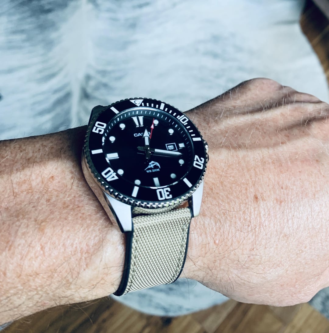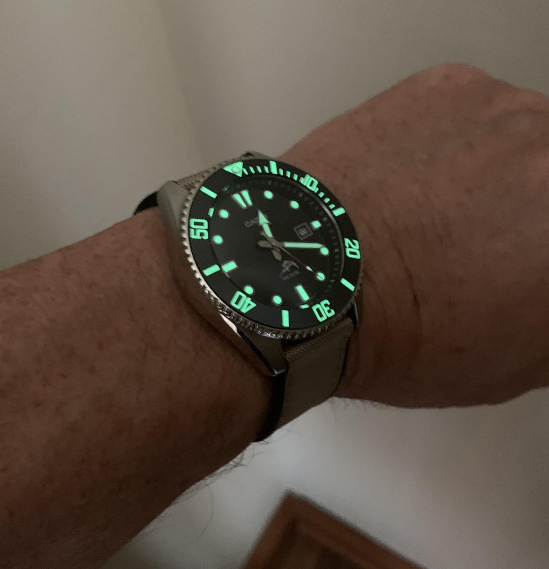 I bought this in March of this year. Not worn very much and is in very good condition. A few tiny hairlines on the polished case side that are too small to capture with my camera. Full kit. I changed the stock bezel to a ceramic black with full lume and changed the stock mineral crystal to a double domed with AR coating. These upgrades take this watch to the next level. A lot of watch for the money. The tan sailcloth strap is not included. The original rubber strap is included and on the watch right now. Price is $99 firm shipped to the lower 48. No trades. Payapl FF, Venmo, Wise are all accepted. Thank you