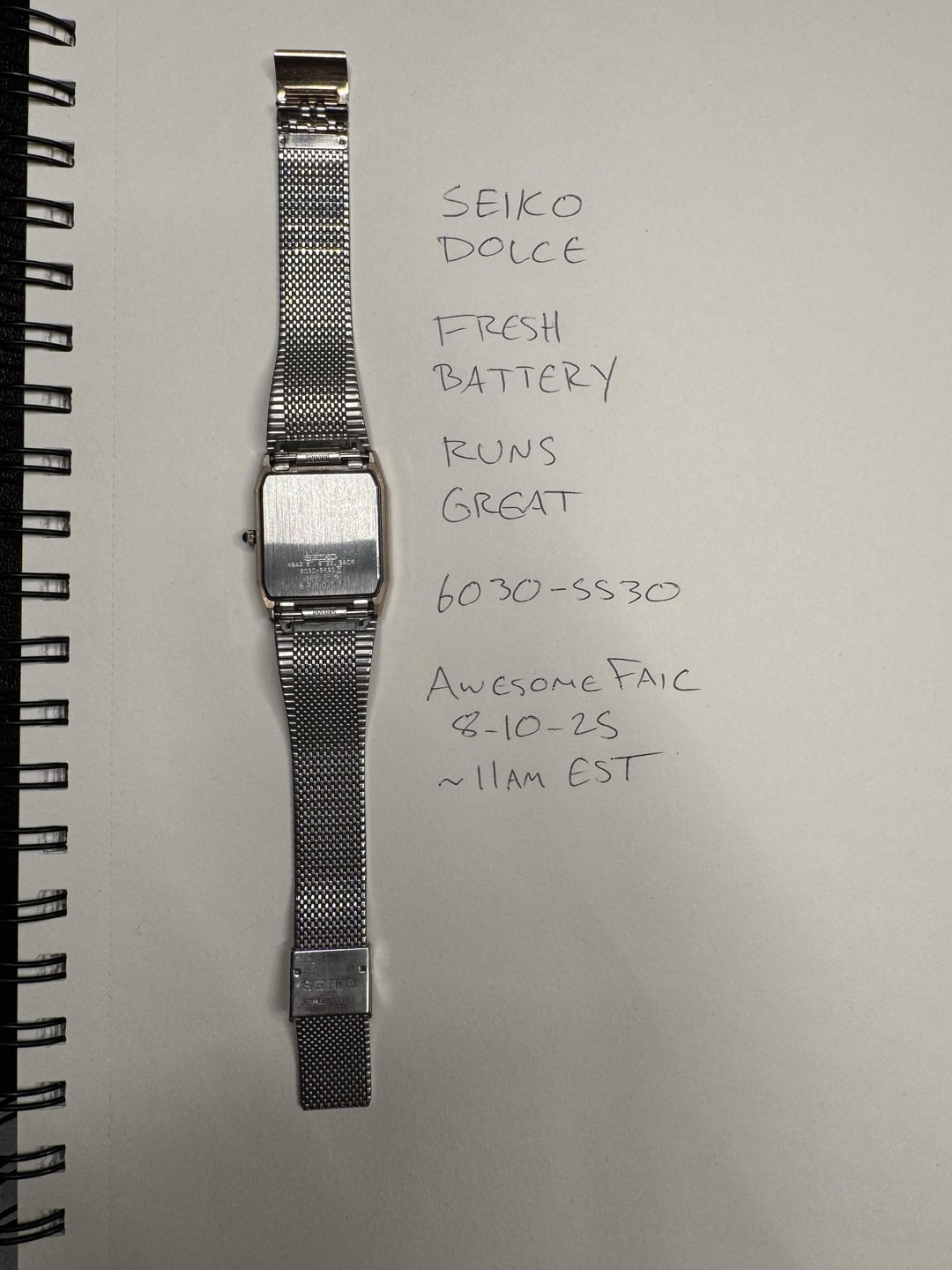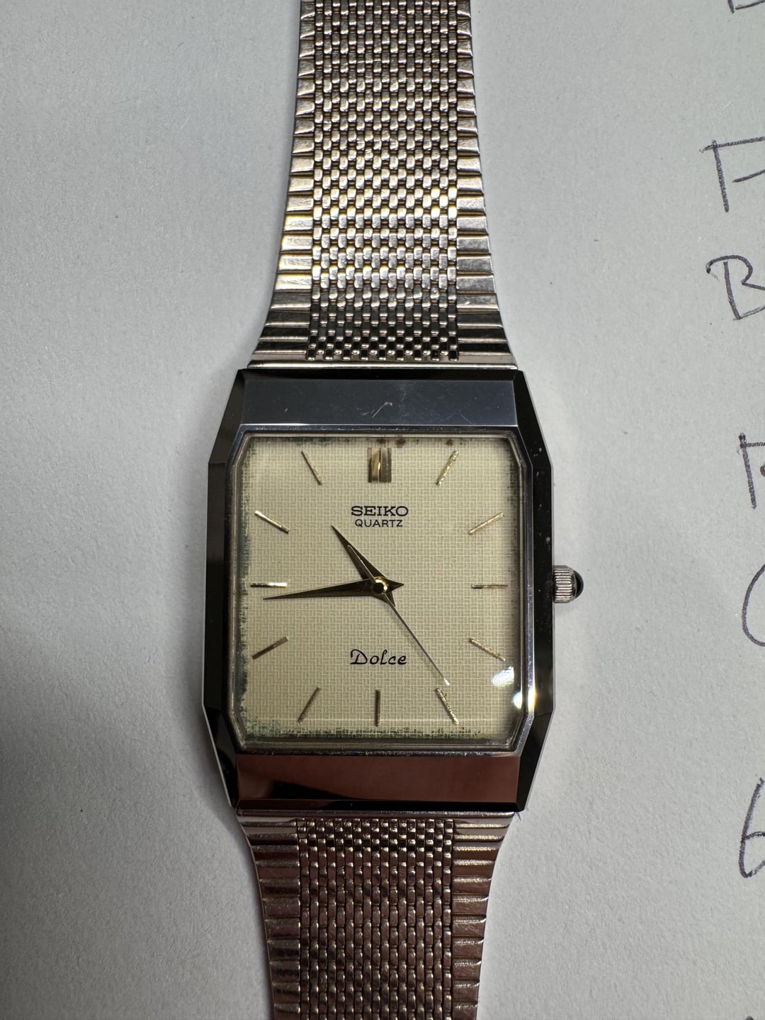 Looking to sell my Seiko Dolce. It's a beautiful budget piece but isn't seeing the wrist time that justifies it sitting around. I know this style is popular lately (heavily shared on TikTok lately) and would love to see it go to someone who'd wear it regularly. It runs great and has a good battery. There is a small mark on the clasp and some discoloration on the very edge of the face, but everything else is in excellent condition. The unique bracelet is basically in perfect shape, and captures the light beautifully. Located in northeast US, domestic shipping only. Asking $149, Venmo preferred but I have PayPal, CashApp, Zelle. Willing to accept crypto but will need to increase the cost slightly to cover conversion fees on my end. Happy to answer any other questions!