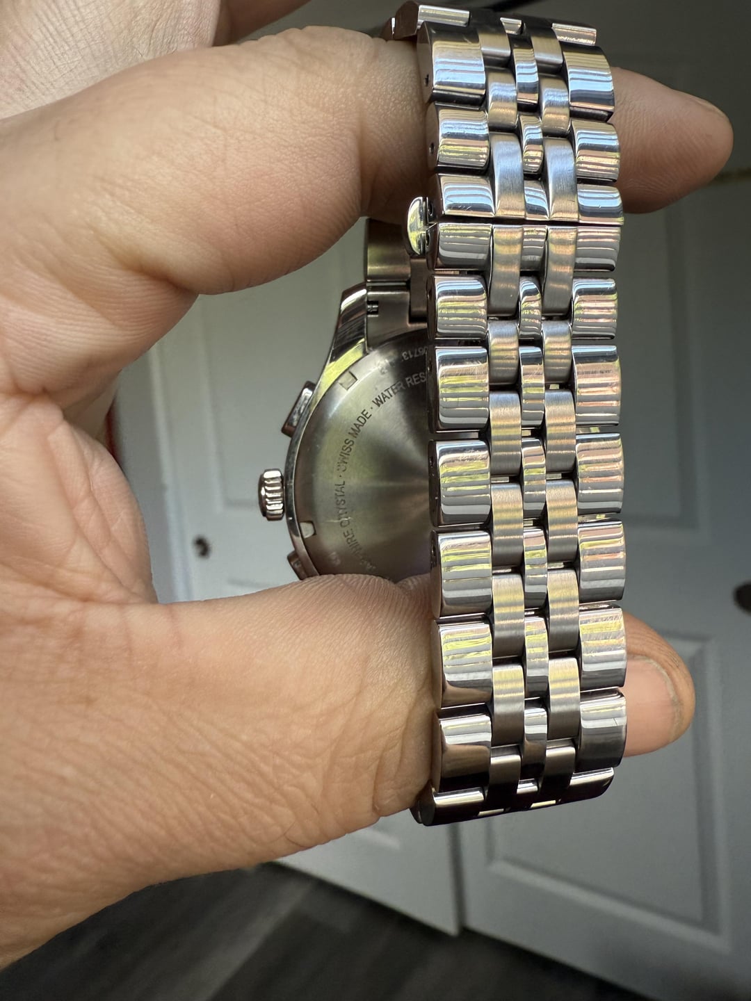 Mint condition watch other than a small scratch on the caseback. Like new otherwise. Swiss made watch with chronograph functions fused with a classic and timeless design aesthetic for effortless everyday style. With a Swiss made case crafted from high-grade stainless steel (316L). Generously sized hands and pyramidal markers provide effortless time readability. No box. Fits a wrist up to 7.6 inches w current links. $165 SHIPPED DIMENSIONS Height: 11 mm Weight: 168 g Lug Width: 21 mm Diameter: 44 mm DETAILS Item Number: 241745 Country Of Origin: Switzerland Case Back Sealing: Screw-in caseback Chronograph: Yes Alarm Function: No Closure: Deployant clasp Bezel Rotation: Fixed bezel Countdown Timer: No Date: Yes Dial Backlight: No Luminescent Hands: Yes Movement Type: Analog quartz Second Time Zone: No Water Resistance: 10 ATM/100 M/330 FT MATERIALS Case Material: Stainless steel Case Finish: Polished Bezel Material: Stainless steel Bezel Finish: Polished Case Back Material: Stainless steel Dial Finish: Circular brushed Bracelet Material: Stainless steel