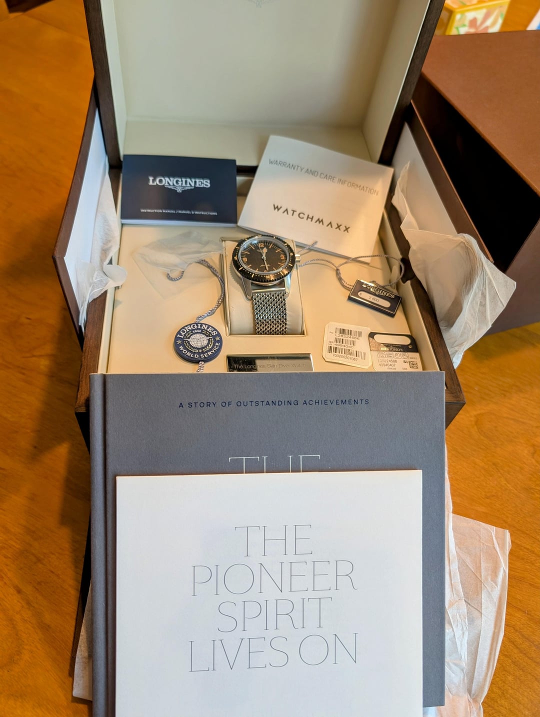 Longines Heritage Skin Diver L2.822.4.56.6 / L28224566 Gently used condition. Buckle has some desk rash and there are a couple marks on the underside of the lugs from changing out the bracelet, but nothing a polish can't handle. Case and crystal are clean and nick free. Full kit from WatchMaxx so there is no card, but has hang tags, all links, books and WatchMaxx warranty card. Overall beautiful condition. $1150 shipped CONUS from Austin, TX. No trades * Case Size: 42 mm * Caliber L619/888 * Scratch Resistant Sapphire * Bezel: Unidirectional Rotating * Power Reserve: Approximately 42 Hours * Water Resistance: 300 m / 1000 ft * Timestamp: [https://imgur.com/a/7uSruZc](https://imgur.com/a/7uSruZc) * PPFF or Venmo for payment and open to PPGS with 3% on top