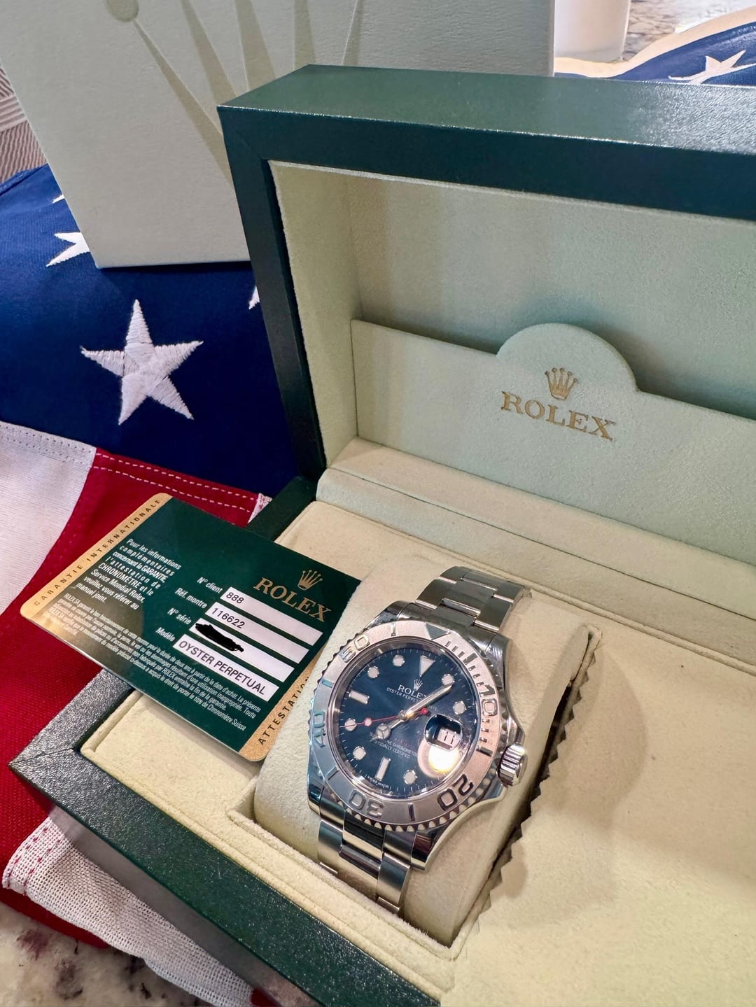 https://imgur.com/a/vmHRcsS Timestamp Rolex Yachtmaster Captain America! - Box and Papers included - in Excellent condition - ref 116622 - Asking $12250 pretty firm! Will consider trade deals for other Rolex or Omega as well Thanks for looking, she's a beaut!