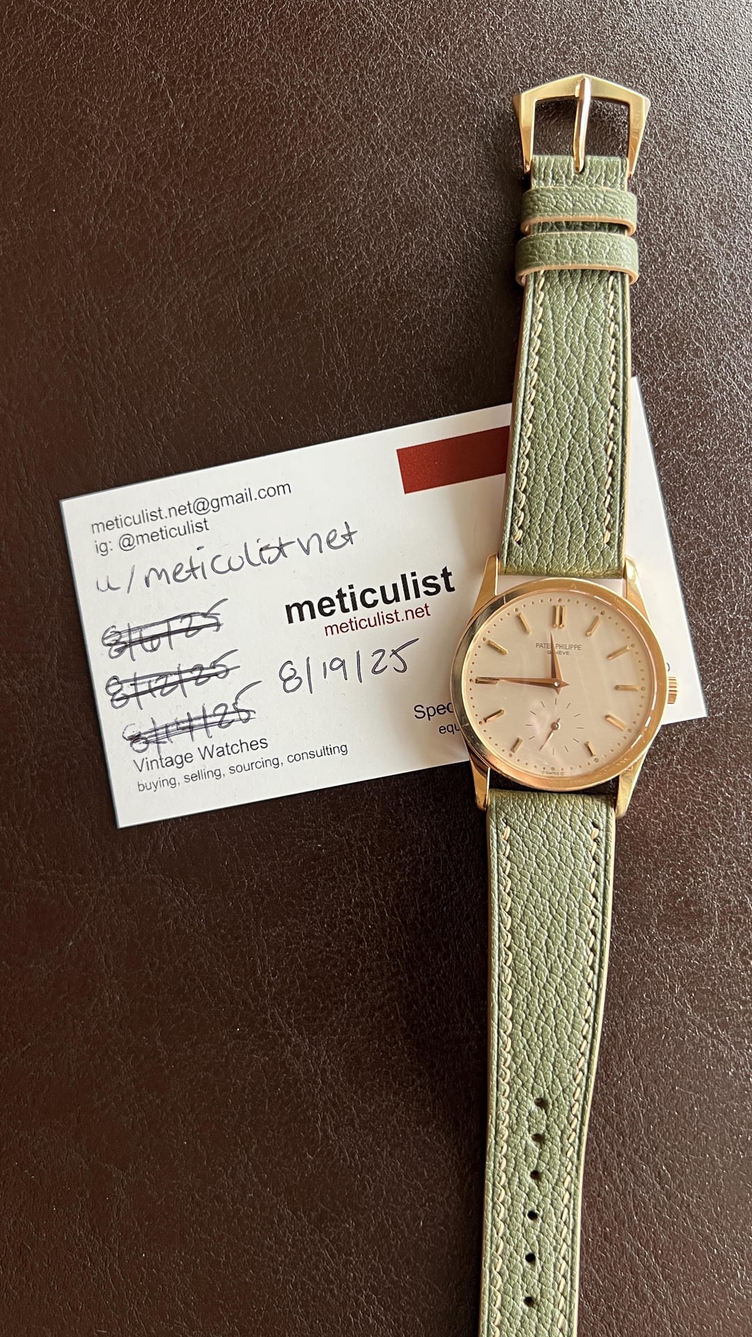 The reference 3796 just might be *the* king or archetype for the neo-vintage category of watches. The same proportions and (largely the same) design as the truly iconic reference 96 updated with a more robust movement, case, sapphire crystal, gaskets, etc. It’s a reference I was always concerned might feel too sterile or modernized compared to the warmth and charm of its vintage inspiration, though I am pleased to report I have not found that to be the case. The wide flat bezel feels potentially more pronounced than the 96, possibly due the flatter sapphire crystal, adding to the overstated presence of the measured case diameter that wears beautifully on wrist. I particularly love the (presumed to be early) examples that retain the smaller serifed signature and accent in the “e” of Geneve. The reference 3796 has fully captured my heart and quickly became one of those references I’m perpetually seeking out and always want on hand. This particular example has a very good case, excellent bezel, perfectly clean dial, and the subtle warmth of rose gold adding to the vintage aesthetic. **Case:** The 30.5 x 38.5 x 6.7 mm solid rose gold case is in very good condition, exhibiting only minor surface scratches throughout as photographed. It appears to be unpolished with sharp case edges, thick, full lugs, and hallmarks crisply intact. The lugs at 2 o’clock and 7 o’clock have minor dings that are not noticeable on wrist but can be seen in the photos provided. **Dial:** The subtly brushed very light silver dial is free of any defects and complemented by the applied and faceted rose gold indices, minute markers, and prominent dauphine hands. The serifed and accented signature and sigma Swiss dial lean into the vintage feel. **Movement:** The caliber 215 PS manually wound movement is traditionally finished under the closed caseback and proved to be a reliable, robust movement. The watch is winding, setting, and running smoothly at approximately -5 s/d, averaged across 6 positions. **Strap:** The watch is presented on matte brown alligator Patek strap with the original rose gold buckle in equally great condition. **Includes:** The more charming previous style of Extract from the Archives referencing 1989 production and November 6, 1989 sale. Price: $15,250 USD including fully insured shipping from Phoenix, AZ to a FedEx Office location or commercial address within the continental US, international shipping available at cost based on location. Payment by ACH or Wire, no trades please. I have all positive references here, C24, forums, and Instagram (@)meticulist Thanks mods for the space.