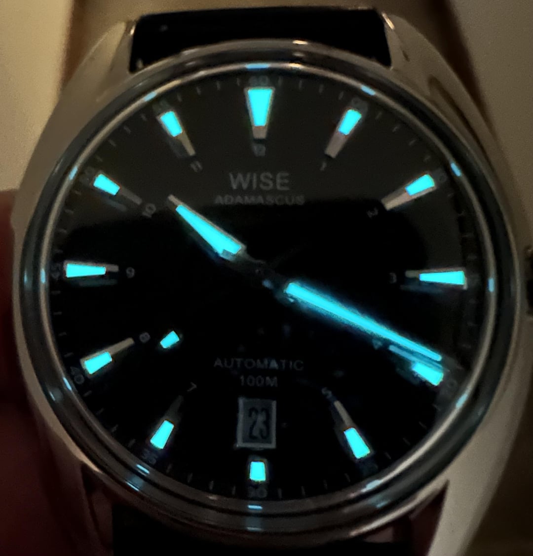 Preferably looking to trade my Wise for a nice mechanical field watch (Hamilton Murph etc). TV = \~$475. The watch is in excellent condition - full kit with some warranty left. Purchase Price - $450 including shipping from Chicago area - PP F/F - PP G/S +3.5% - Zelle - F2F in the Chicago burbs # Wise Adamascus AD771A * **DIAMETER:** 39 mm. * **DIAL:** Enamel with "7" pattern (Black) * **CASE:** Stainless steel 904L * **GLASS:** Box shaped sapphire crystal front/ Sapphire crystal back with inner AR coating * **LUG WIDTH:** 20 mm. * **LUG TO LUG:** 47 mm * **WATER RESISTANCE:** 100 m. * **STRAP:** 1 Leather (Crocodile or Shell Cordovan) * **LUMINOSITY:** Super-Luminova BGW9 (Blue-green) * **CALIBER:** Cal. 9019 28,800 bph, 24 jewels * **POWER RESERVE:** 42 hours * **WARRANTY:** 1 Year
