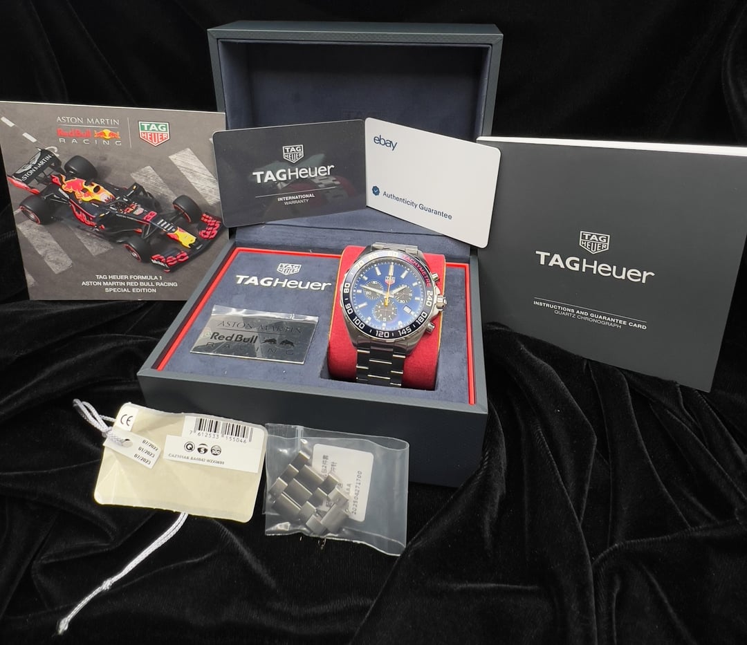 TAG Heuer Formula 1 Aston Martin Red Bull Racing Special Edition (Ref: CAZ101AB.BA0842) – a bold, sporty chronograph celebrating TAG’s partnership with Aston Martin Red Bull Racing. Details: • Model: TAG Heuer Formula 1 Aston Martin Red Bull Racing Special Edition • Reference: CAZ101AB.BA0842 • Case Size: 43mm Stainless Steel • Movement: Quartz Chronograph • Dial: Blue sunray • Crystal: Sapphire • Water Resistance: 200M Condition & Full Set: • Excellent condition – lightly worn • Includes: • Double box set (outer + inner) • Instruction manual • Aston Martin booklet • Warranty card • Prior authentication card • Original hang tag • 4 additional bracelet links Price: $1,100 Shipping: Fully insured shipping within the U.S. (buyer covers cost) Payment: Zelle This is a complete set special edition TAG Heuer with strong Formula 1 and Aston Martin racing heritage – perfect for collectors or motorsport fans. PM me with questions or for additional pics!