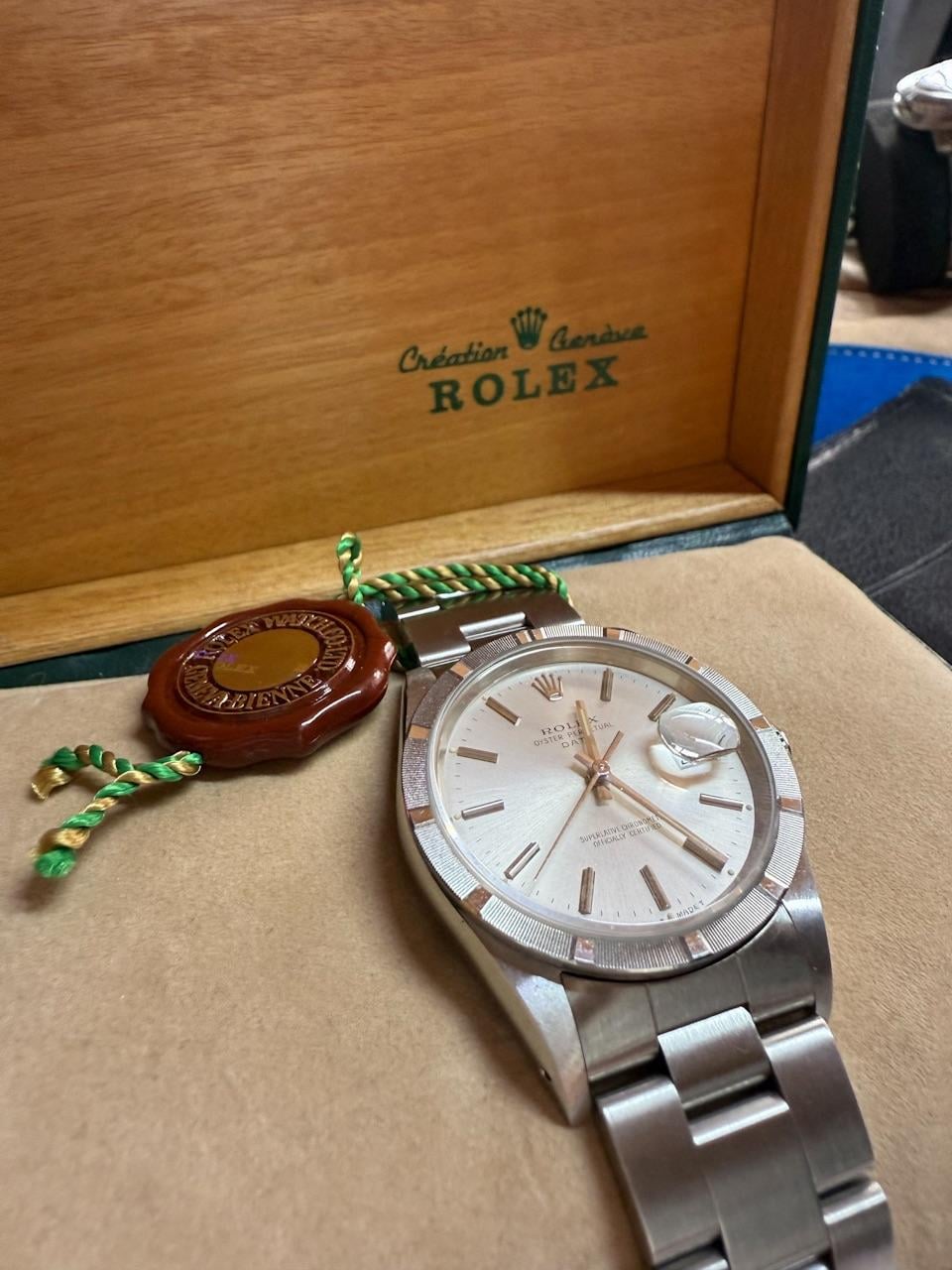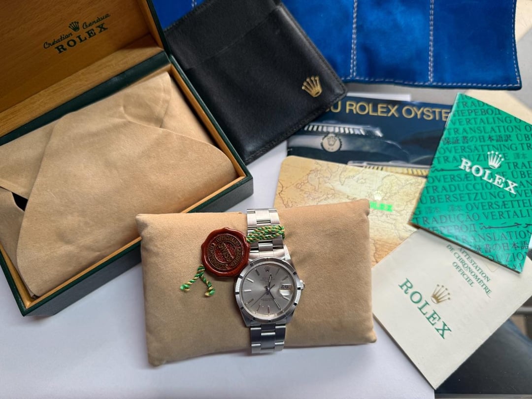 Hello there! Today I’m offering a Rolex Oyster Perpetual Date ideal for collectors or resellers. From 1989. Please note: lighting in photos was chosen to highlight condition details like wear, scratches, or strap usage. Details below: - 34mm - Stainless steel - Automatic - Silver dial - Caliber 3135 - Full set (box and papers) - NEVER POLISHED 💰 Price: $5.250 USD (negotiable) + international shipping according to the insurance rate of the courier 📦 Shipping from Bogotá, Colombia – insured and tracked 💳 Payment: PayPal, Wise also accepted Individual sales also possible – feel free to reach out with the one you’re interested in. No trades, sales only. ⚠️ Note: Buyer is responsible for any import duties, taxes, or customs fees in their country. Happy to provide additional photos, videos, or answer any questions. 1 reference available. Thanks for looking!