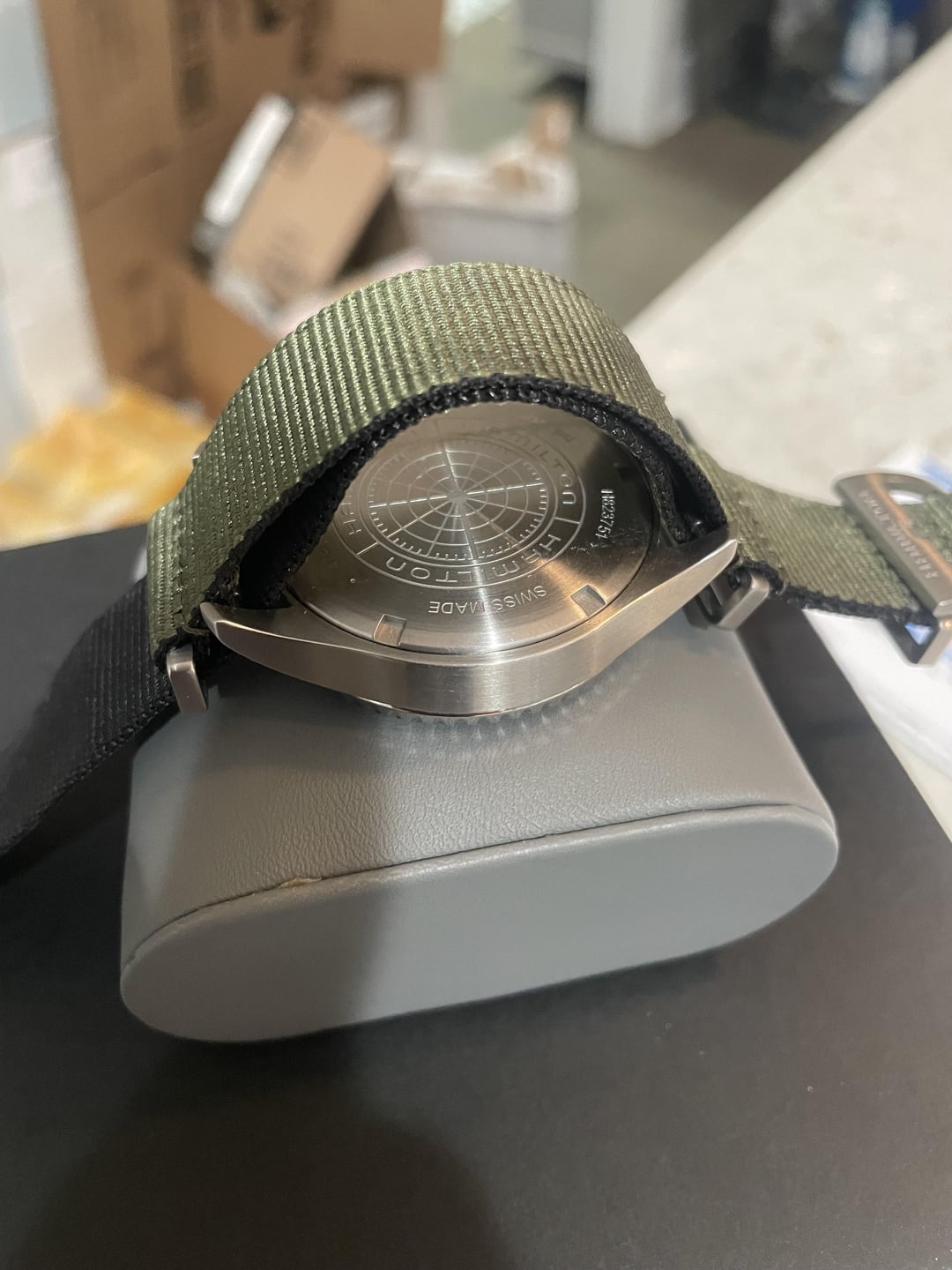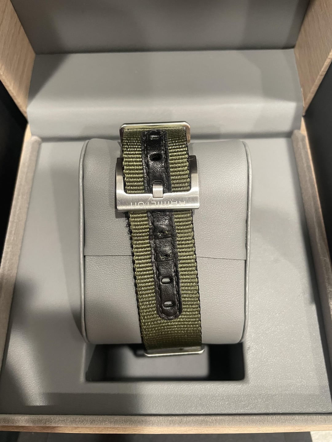 Excellent condition, strap shows signs of wear but that’s the only item of note. Comes with the inner and outer boxes, manuals, and two badass Hamilton patches! $475 shipped, trades of multiples of mine for one of yours welcome, check out my profile to see whats available. Please indicate your trade value when reaching out