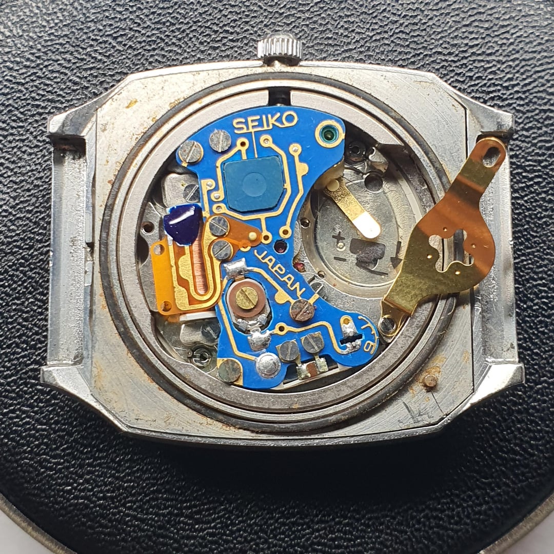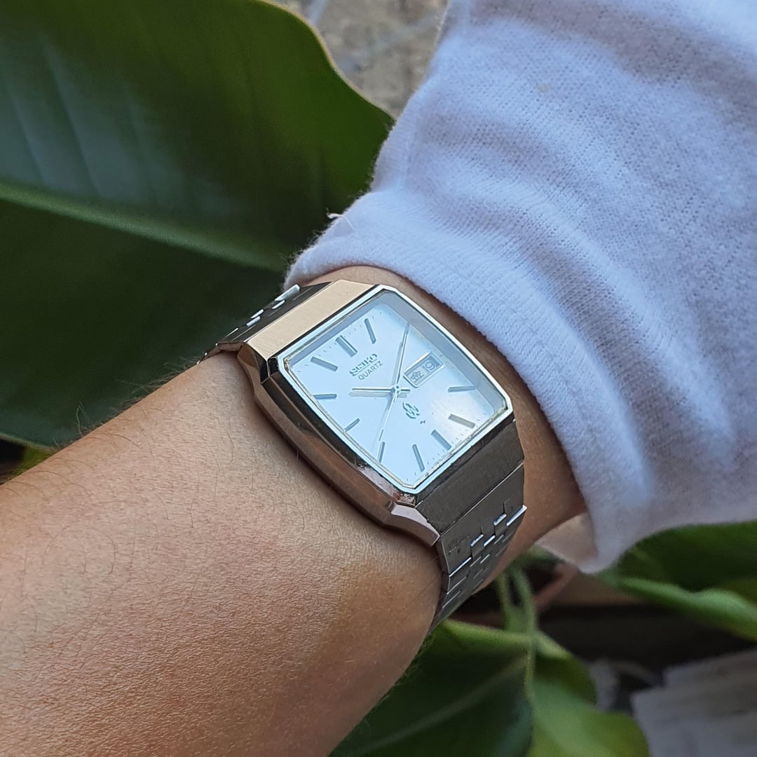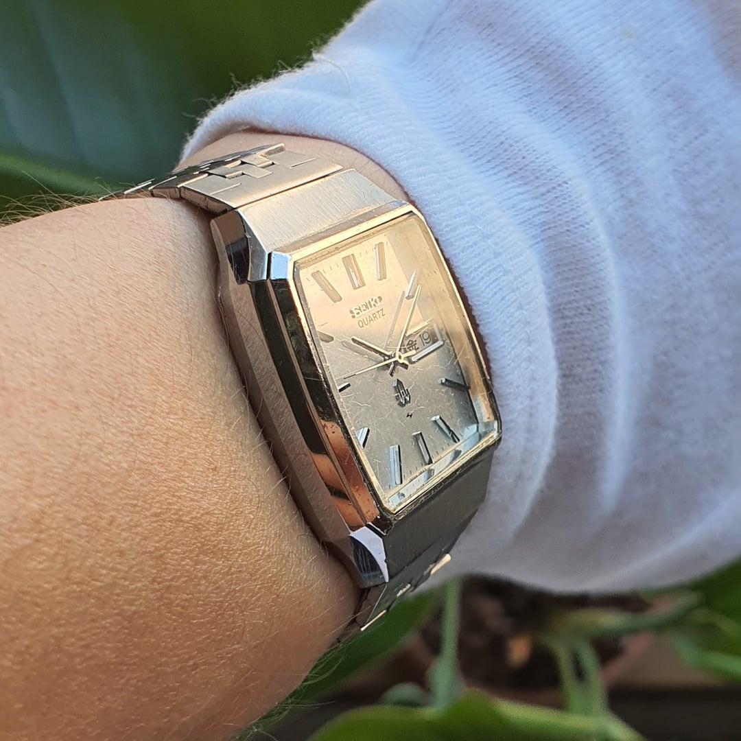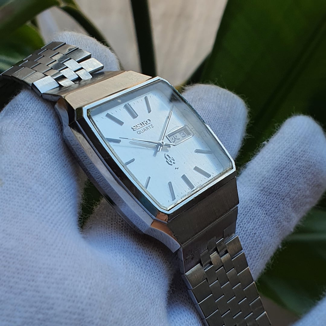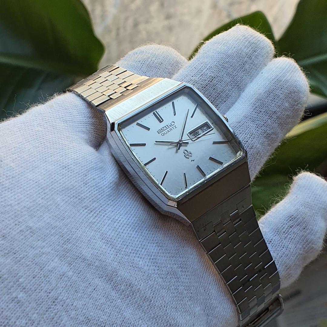 For sale is this vintage Seiko "08QZ" (0843-5010), made in Japan in January of 1976.  The "QZ" series was the third range within the "Q" series (QT, QR, QZ), which were more adventurous with their designs and colours. This was when "affordable" quartz was not yet available.  This model, reference number QMW020, cost ¥53,000 in 1976 which is equivalent to $980 today (adjusted for inflation). The QMW020 features a grey linen dial which has some ageing to it but still in relatively good condition given its age of almost 50 years old. The stick baton indices are high-polished and applied stainless steel with a black centre. The hands mimic the indices in styling and the seconds hand has a black tip. The seconds hand hits every marker satisfyingly. The Seiko logo and single crystal quartz logo are applied. The square case has some beautiful facets that are high-polish on the sides and brushed on the top surface. The design is super '70s. The Daini lightning bolt symbol on the dial and case back indicates it was made in the Seiko Daini factory (King Seiko) during their rivalry with the Suwa factory. The calibre 0843 movement is a very beautiful sight from the golden age of quartz when it was the new technology, with a stated accuracy of 15 seconds a month. Such a robust and over-engineered movement. The battery bridge is missing a screw but this doesn't affect the workings of the watch at all.  Can be set to either Japanese kanji or English days of the week all in black except Saturday (in blue) and Sunday (in red).Comes on the original adjustable Seiko bracelet. The ageing to the dial is not as noticeable in real life, the crystal is in decent condition but has slight scratches depending on the angle. General wear to the watch as expected. The slight yellowing on the left side of the crystal is the glue changing colour over time (i.e. it is not on the dial). The right side of the dial near the crown is slight corrosion on the dial but depending on the angle is not too bad.  Dimensions are: 33mm x 39mm x 10.4mm  Lug Width 19mm Bought in Japan.  Looking for $135 net (buyer pays Paypal fee) International Tracked Shipping $10 \*Returns accepted but all return postage costs are the buyer's responsibility in all circumstances.
