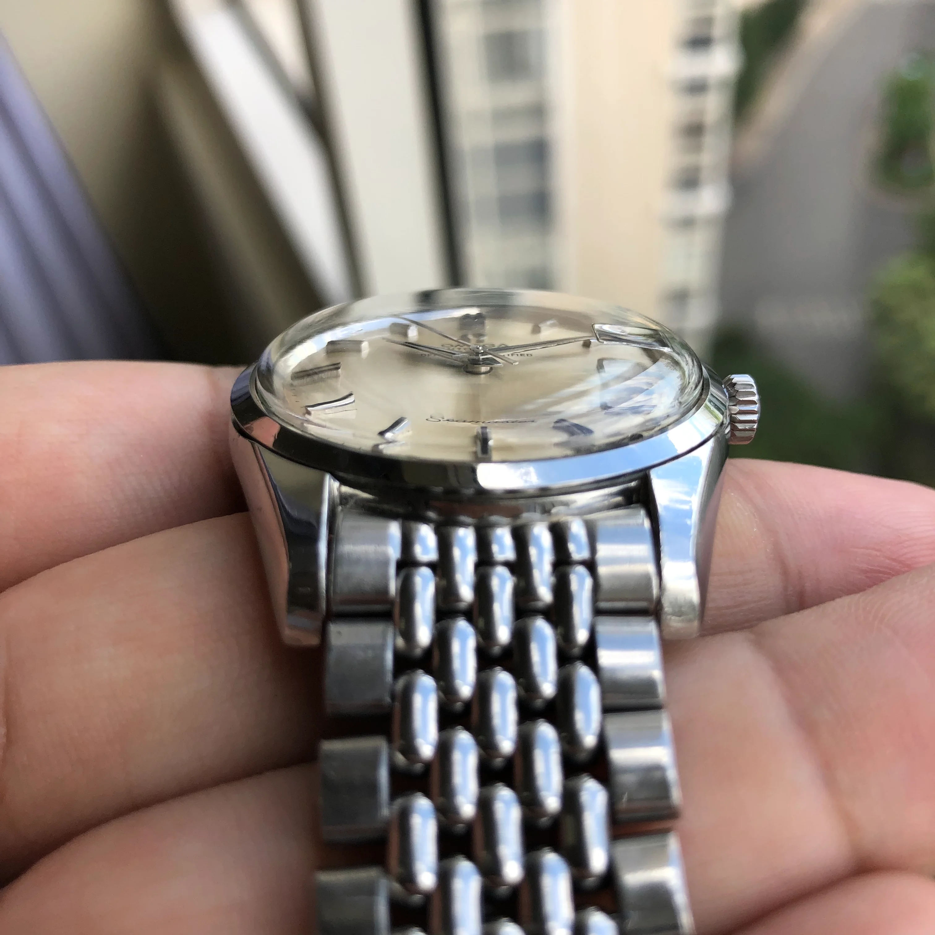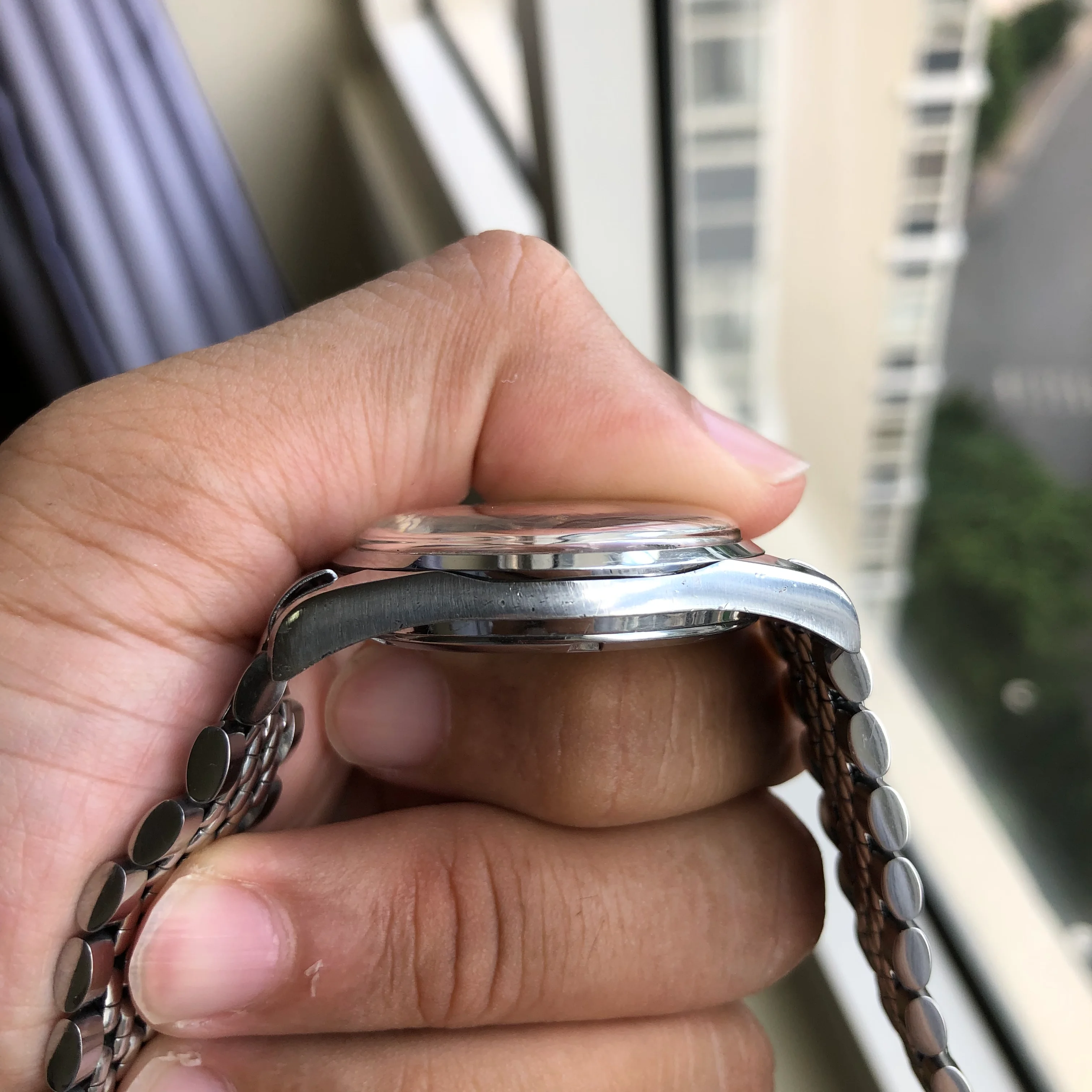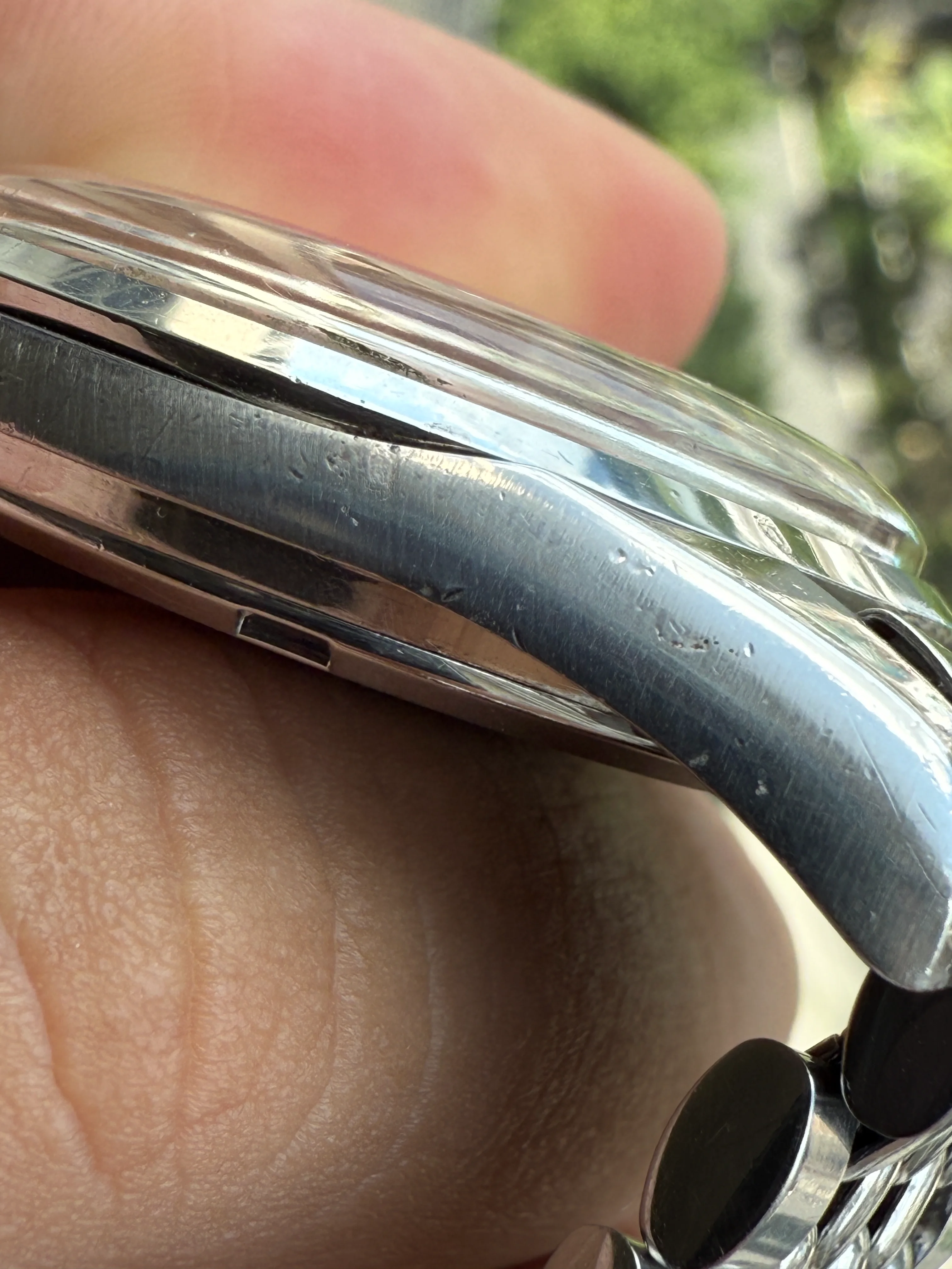 - Dial: Original white sunburst dial with black painted hour markers in good condition; faceted date-aperture frame at 3; dauphine hands; prints, hands and hour markers are all good.