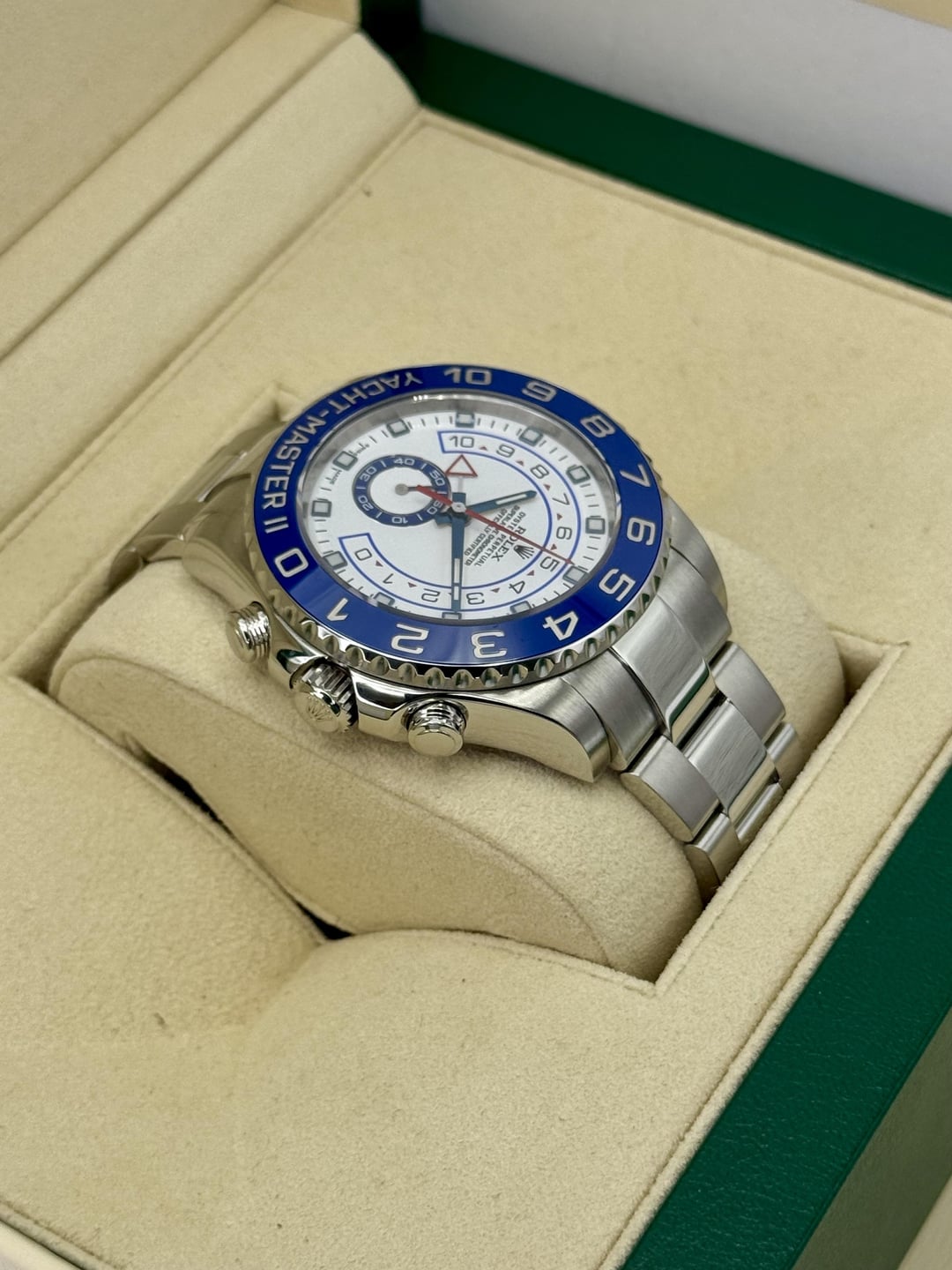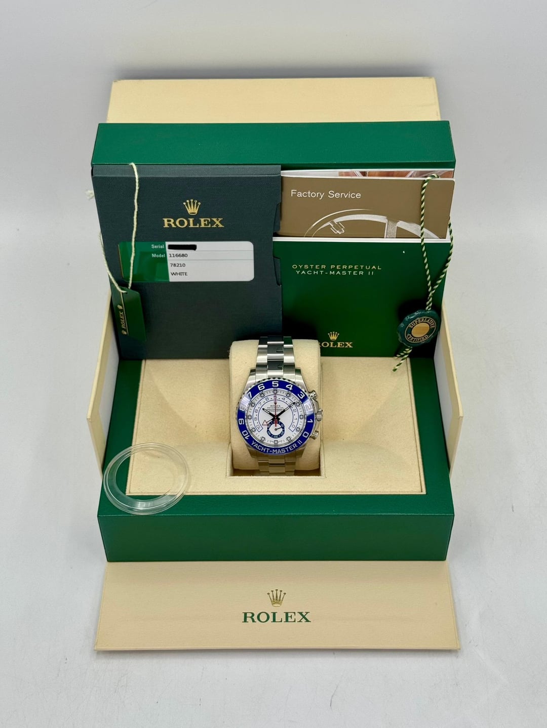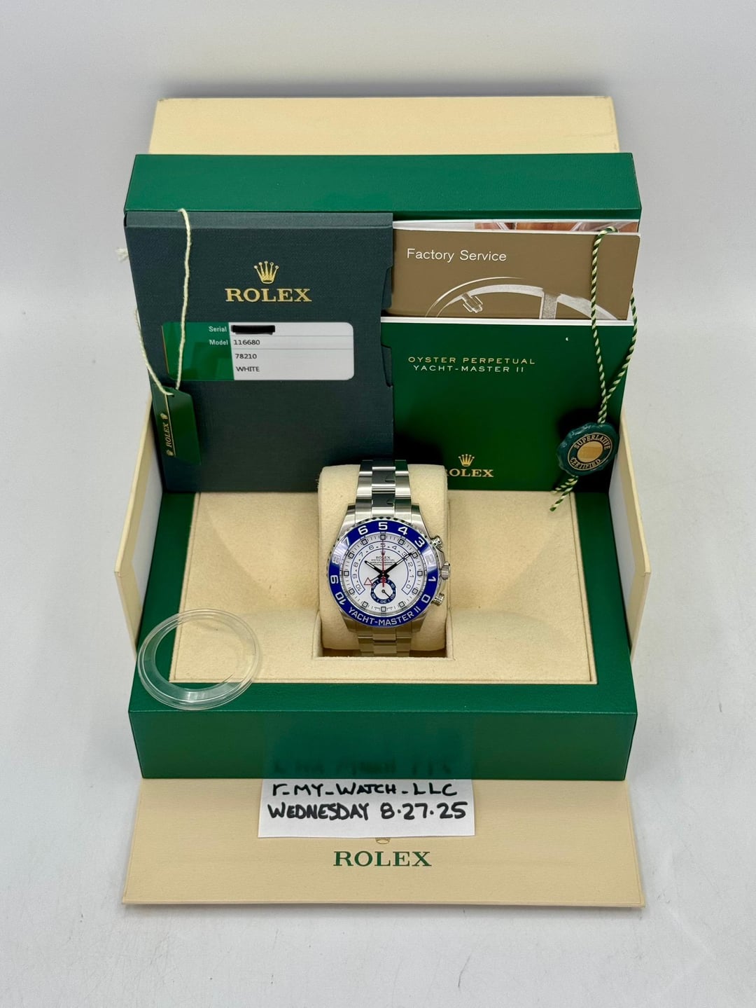 # 🔵2016 Rolex Yacht-Master II 44mm 116680 Stainless Steel White Dial **🔵TRADE or SELL us your luxury watch, all brands considered. Message me details.** **Includes the following:** **✔️Original Rolex Double boxed** **✔️Box and Papers - Yes** **✔️Warranty card dated 2016** **✔️Manual and Warranty booklets** **✔️Green Hang Tags included** **✔️Bezel Protector** **✔️Size: 8.0inch wrist (Full Links)** **✔️Watch is in excellent overall condition. Please see photos for details.** **✔️**[**Trades**](https://mywatchllc.com/pages/sell-my-watch) **welcome** Business Name: **My Watch LLC** LOCATION: Oak Park, Michigan ✔️[MyWatchLLC.com](http://mywatchllc.com) for current inventory ✔️Google Business Listing [https://g.co/kgs/Cmd6FPW](https://g.co/kgs/Cmd6FPW) ✔️Business Hours M-F 9-6 ✔️Facetime/Video chat/calls welcome to view the watch interested. ✔️Contact: 248-422-0909 via text or call for quickest response. 🟢TERMS: Visit [MyWatchLLC.Com](http://mywatchllc.com) for payments accepted 🟢REFERENCES/REVIEWS: We are well reviewed on all platforms from google, trust pilot, rolexforums, additionally we have 300+ reference in multiple FaceBook watch groups, reference checks welcome. 🟢SHIPPING: If you are not local, we offer Fully Insured FedEx overnight shipping in the USA for a fee. International shipping available.