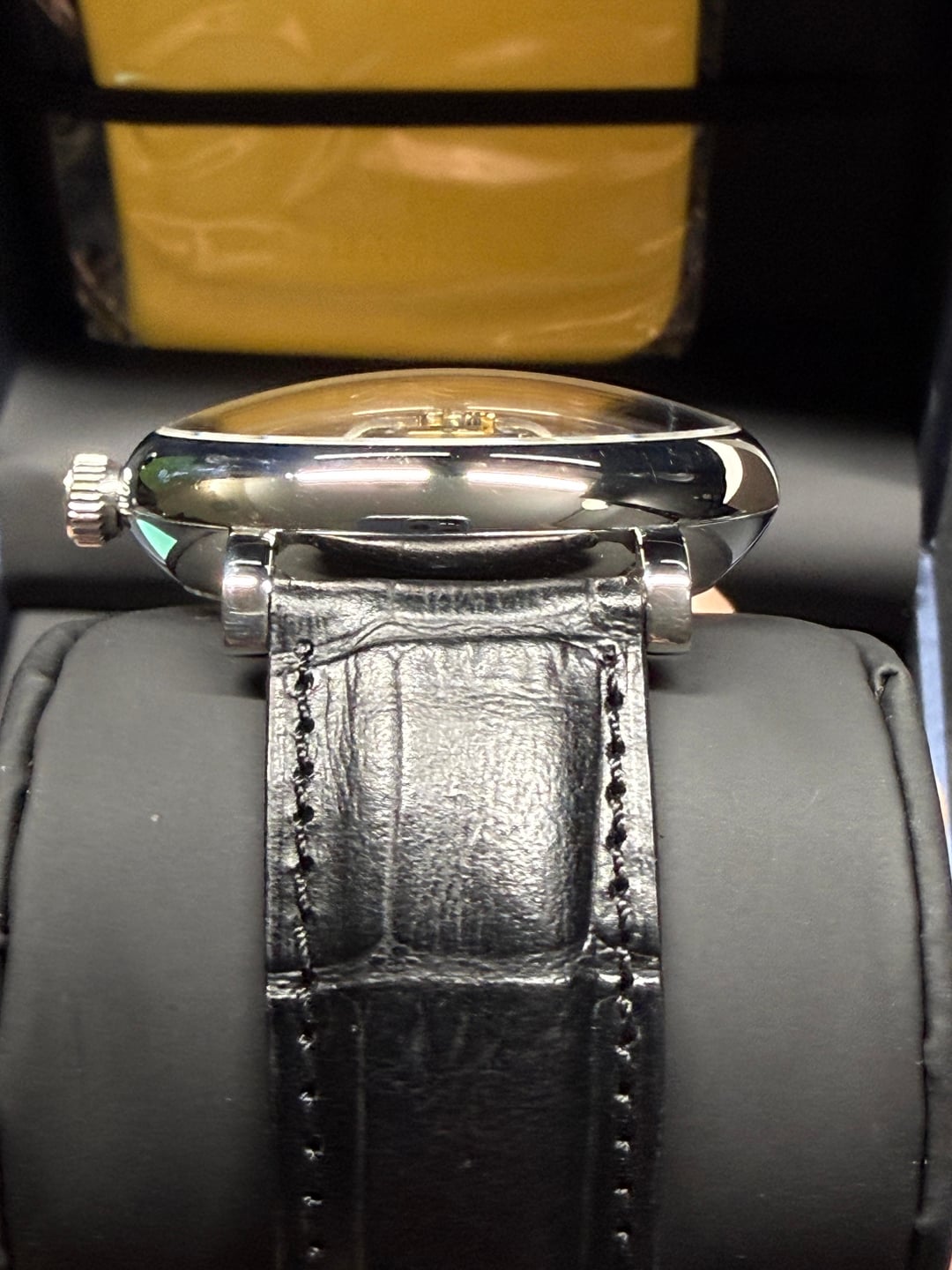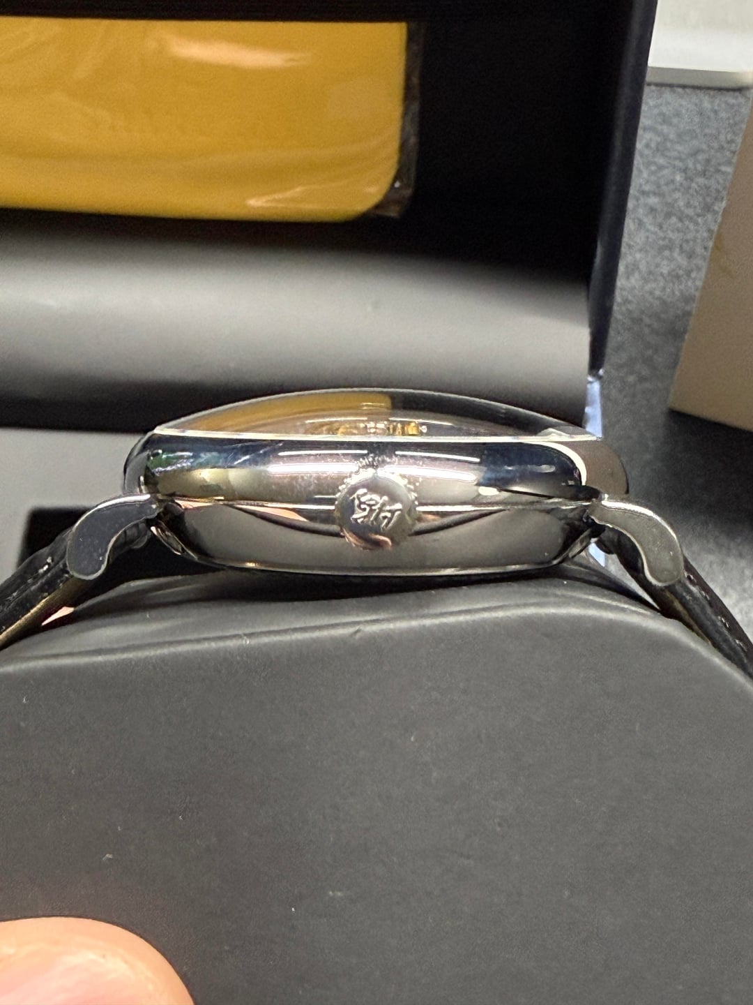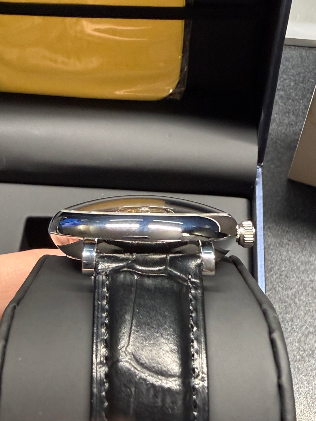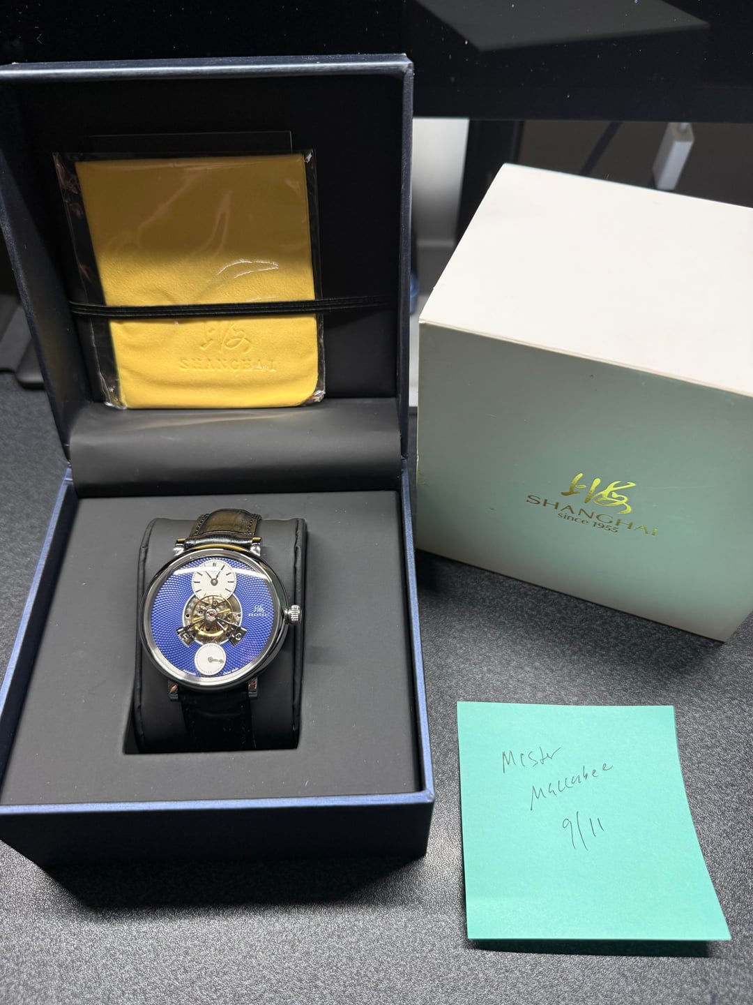 Hey folks Recent purchase. Looks amazing and much more expensive on the wrist! Full kit, looks good, nice condition some minor hairlines on case side - see pics. Official leather strap is basically unworn. $400 shipped / conus only PayPal F&F. I have 40 positive transactions on watchexchange with good feedback so please read them. Also have an eBay store with hundreds of sales and hundreds of positive feedback so read them as well (offtherakcollectibles) Sale only, no trades. Ships from NYC so if you're in area can meet up locally. Please leave a comment here so I can view your transaction history and then message me if you're interested. \----------------- *Brand: Shanghai (上海). Reference: 820-2. \[Version: guilloché blue dial, silver color case.* [*View other versions →*](https://chinawatchshop.com/search?q=%22G79P%22)*\].* Shanghai F28 movement with protruded balance wheel at center, covered by a highly domed sapphire crystal. A 30-second small hand. **Chinese character:** 上海 - Shanghai. Position: At 3 o'clock on dial, crown, movement rotor, back side of strap and buckle. 上海表业有限公司出品 - Shanghai Watch Industry Company Limited Presents. Position: on case back. **MOVEMENT** Mechanical, self-winding. China Made. **Caliber**: Shanghai F28. **Functions**: Hour, minute, second (Hour and minute subidal at 12 o'clock. 30-second small hand at 6 o'clock.). No hacking (Seconds hand does NOT stop when crown is pulled out). **Jewels**: 34. **Frequency**: 21600 vph. **Power reserve**: Around 45 hours. **CASE** 316L stainless steel. Diameter: 42.5 mm. Thickness: 15 mm. Water resistance: 30 meters. Weight: 85 grams (the whole watch including strap). Luminescence: No lume. **Dial**: Blue. Guilloché pattern. Applied hour markers. **Crystal**: Sapphire crystal. Double domed. **Case back**: Fixed with screws. Transparent. **Crown**: Push-pull. Signed with the "上海" logo. **STRAP** Black. Leather. No quick release: Need tool to remove strap from case. Fit for case lug width: 20 mm. Fit for clasp lug width: 18 mm. **Clasp**: Pin buckle. Stainless steel clasp.