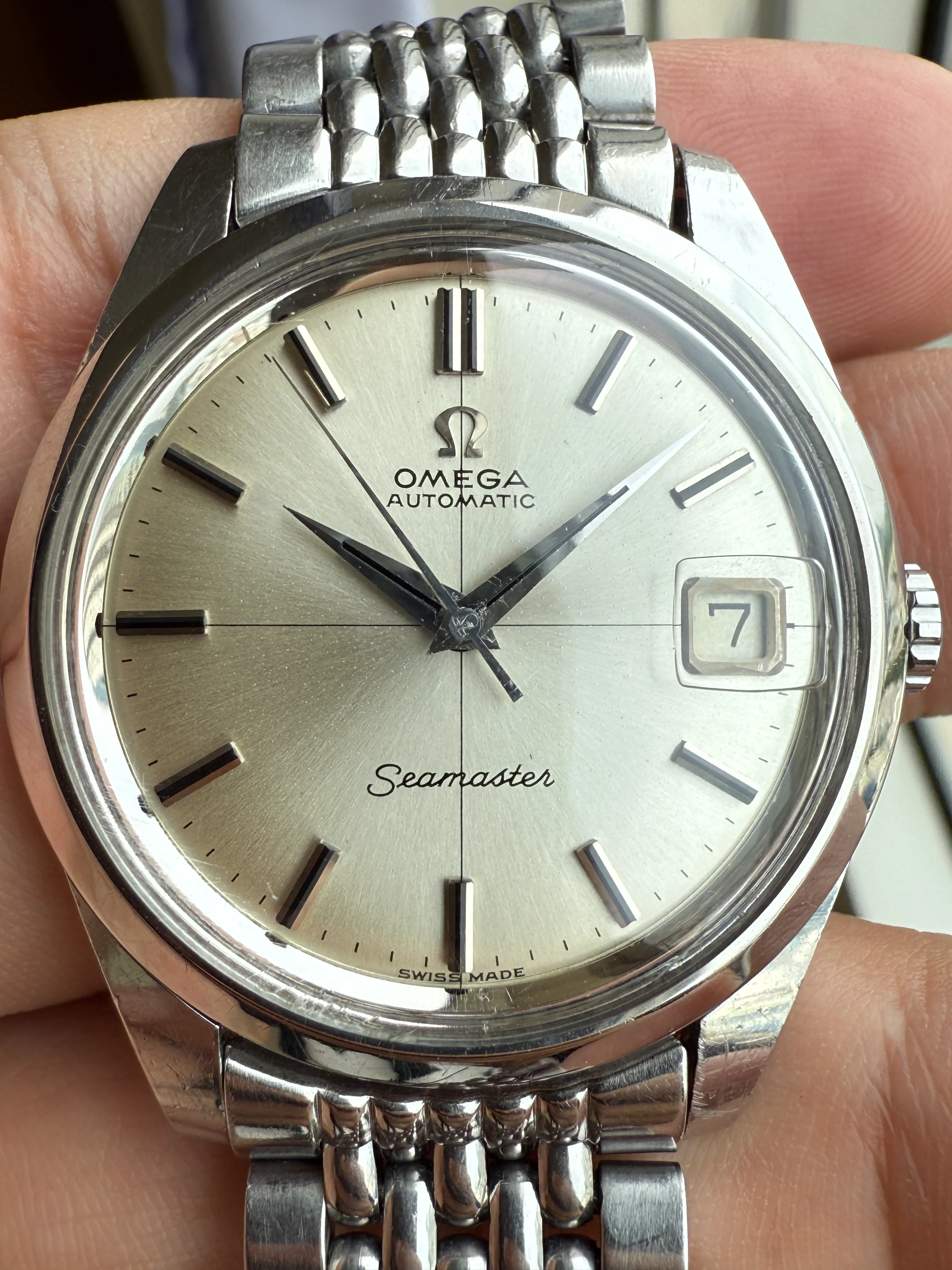 A stainless steel Omega 166.010, original cross hair dial with black onyx-inserted hour markers, Omega BOR 1036 with 511 endlink in good condition, serviced, shipping fee with insurance in EU/US included.