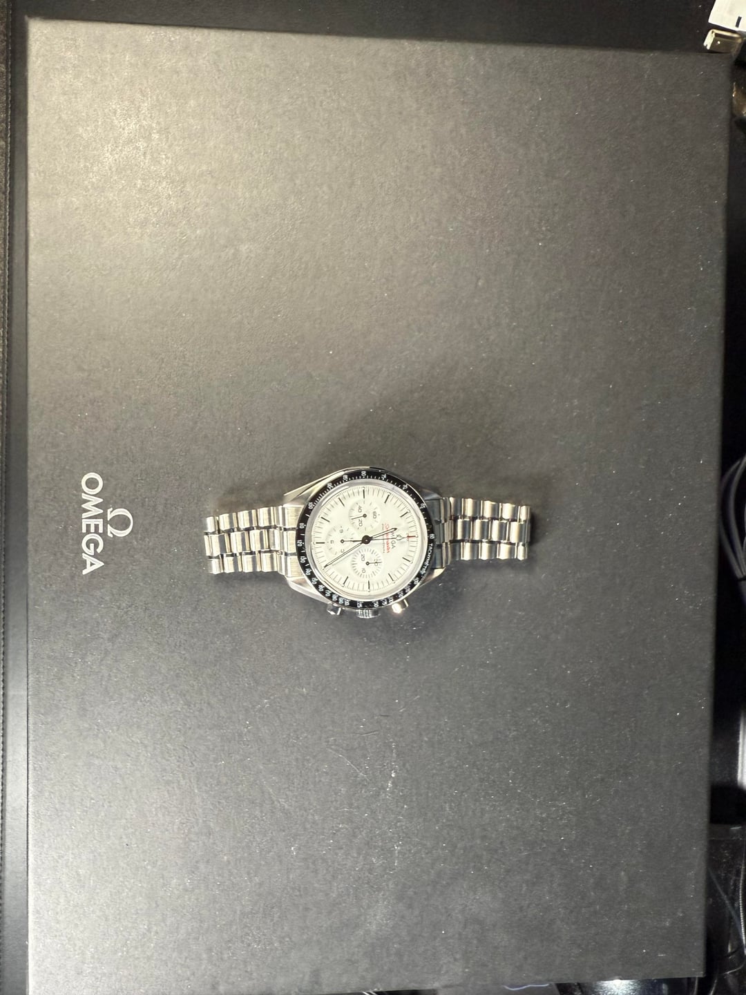 Selling my Omega Speedmaster Professional with the new white dial (Ref. 310.30.42.50.04.001). Purchased earlier this year from the Omega Boutique in Hawaii. Minimal wrist time. I do not see any major scratches other than one on the clasp, but please check the photos carefully as I’ve tried to capture all details up close. **Details:** * Reference: 310.30.42.50.04.001 * Purchased: 2025, Omega Boutique Hawaii * Condition: Excellent, minimal wear * Includes: Full box, cards, papers, hang tag * Price: **$7799 shipped CONUS FedEx overnight OBO. Open to trades.** * Payment: PayPal (G&S + fees or F&F at your discretion), Zelle, Venmo * Location: Colorado, USA * Verification: Happy to hop on Zoom/FaceTime for serious buyers Listing here before it goes up on eBay.