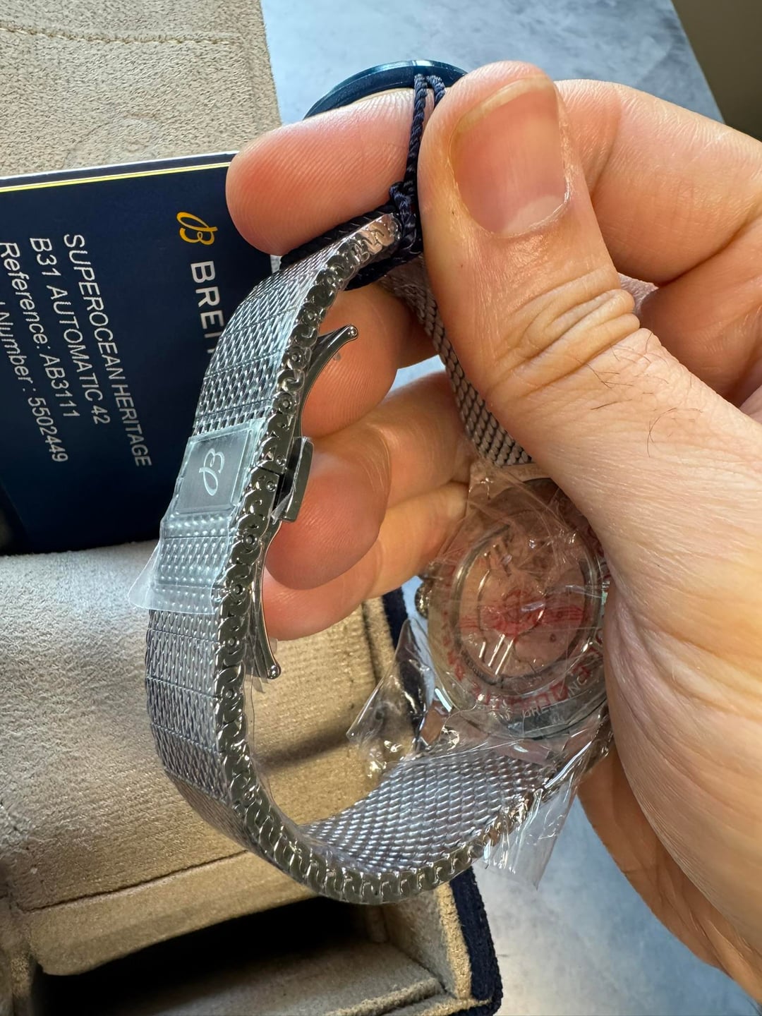 For sale is a completely new, newly released Breitling Superocean Heritage 42 in Blue on the integrated mesh bracelet. Everything about this is new and unused, unsized, with plastic unremoved as well. Purchased in August from an AD and selling at a price a thousand bucks cheaper than Jomashop's grey listing! Please note this is the new thinner watch with lug to lug under 50mm so it wears smaller than last generation 42's by a good bit, I tried one on at the dealer and I could have cleared the 44 on my 7" wrist! I have this for sale at $**4475! No offers this is my lowest price** Price includes insured, signature required shipping in the US.  No trade offers please. Please comment and PM/Chat if interested. Please see my extensive history on this platform, including recent sales of a Moser Pioneer, Zenith Chronomaster Sport, No Time to Die, Pelagos, white speedmaster, and many others. I have ebay and other references available as well timestamp image third in carousel