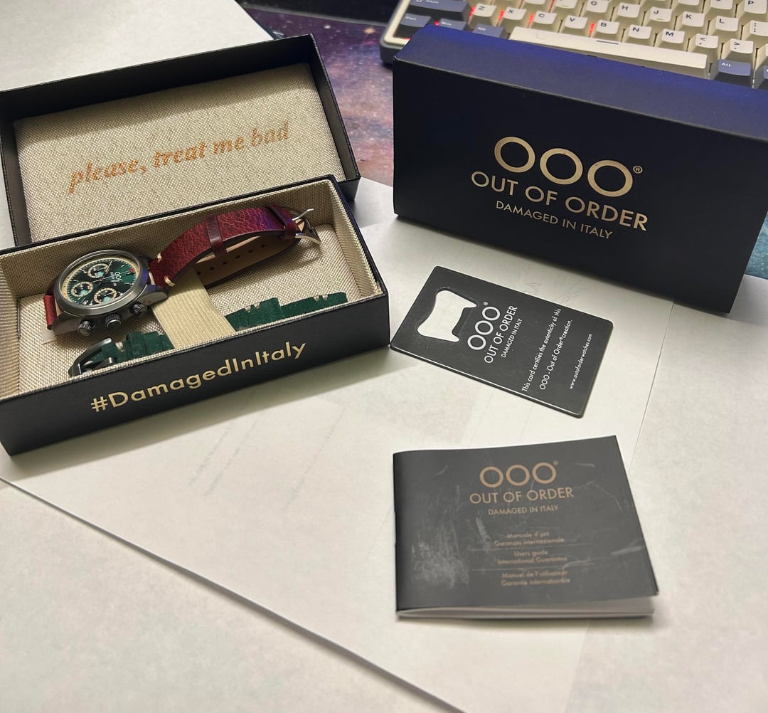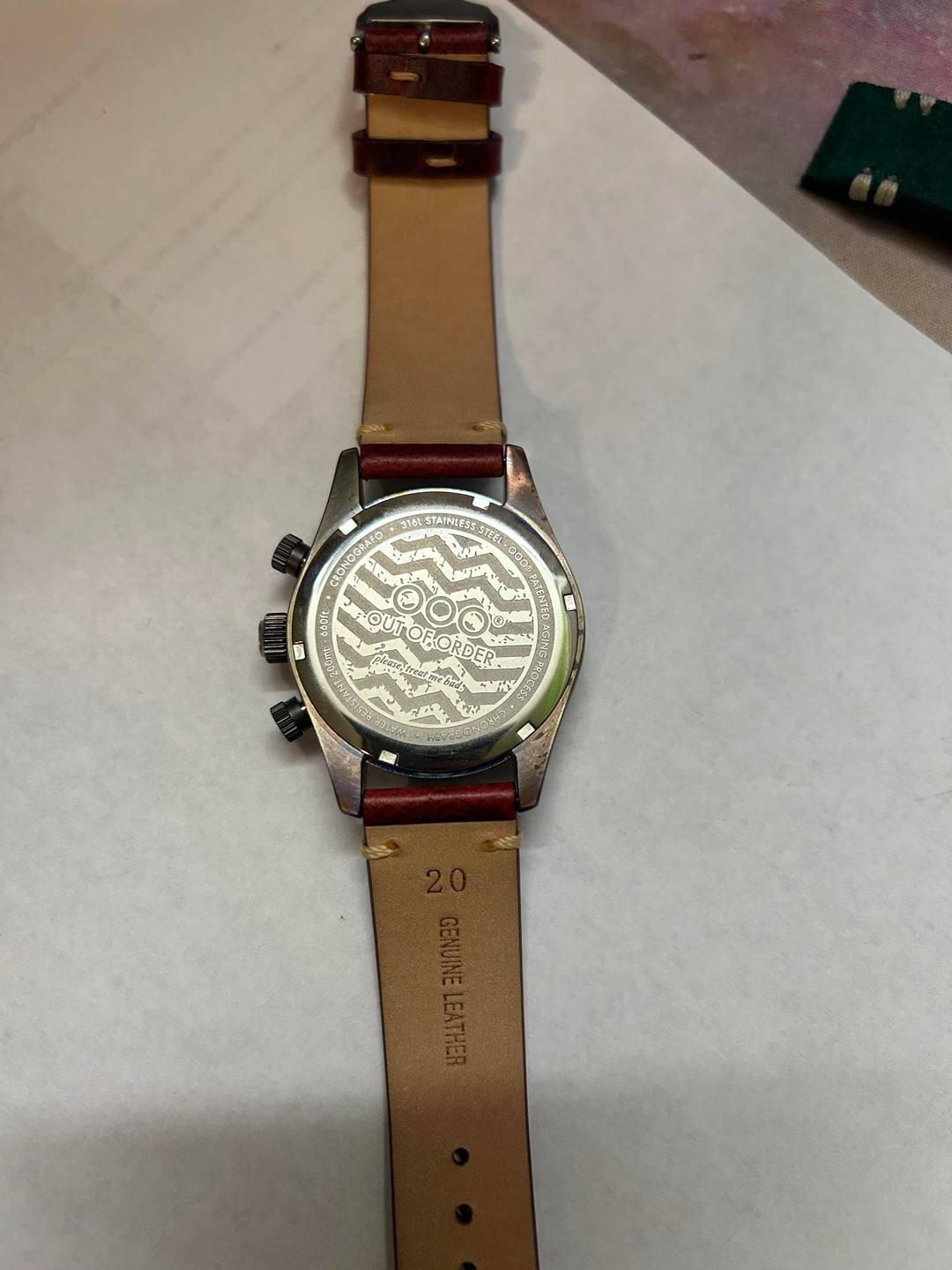 Next up is my Out of Order (OOO) Green Chronograph. This piece stands out with its distressed stainless steel case and vibrant green dial – intentionally “damaged in Italy” for a unique vintage look right out of the box. 42mm case diameter Quartz chronograph movement Domed mineral crystal Original distressed case finish (factory design) Comes on the original leather strap + extra red genuine leather strap 9.3/10 Great condition worn a few times This is a great grab if you want something bold and different. Tons of character with reliable function. Price: $230 + shipping