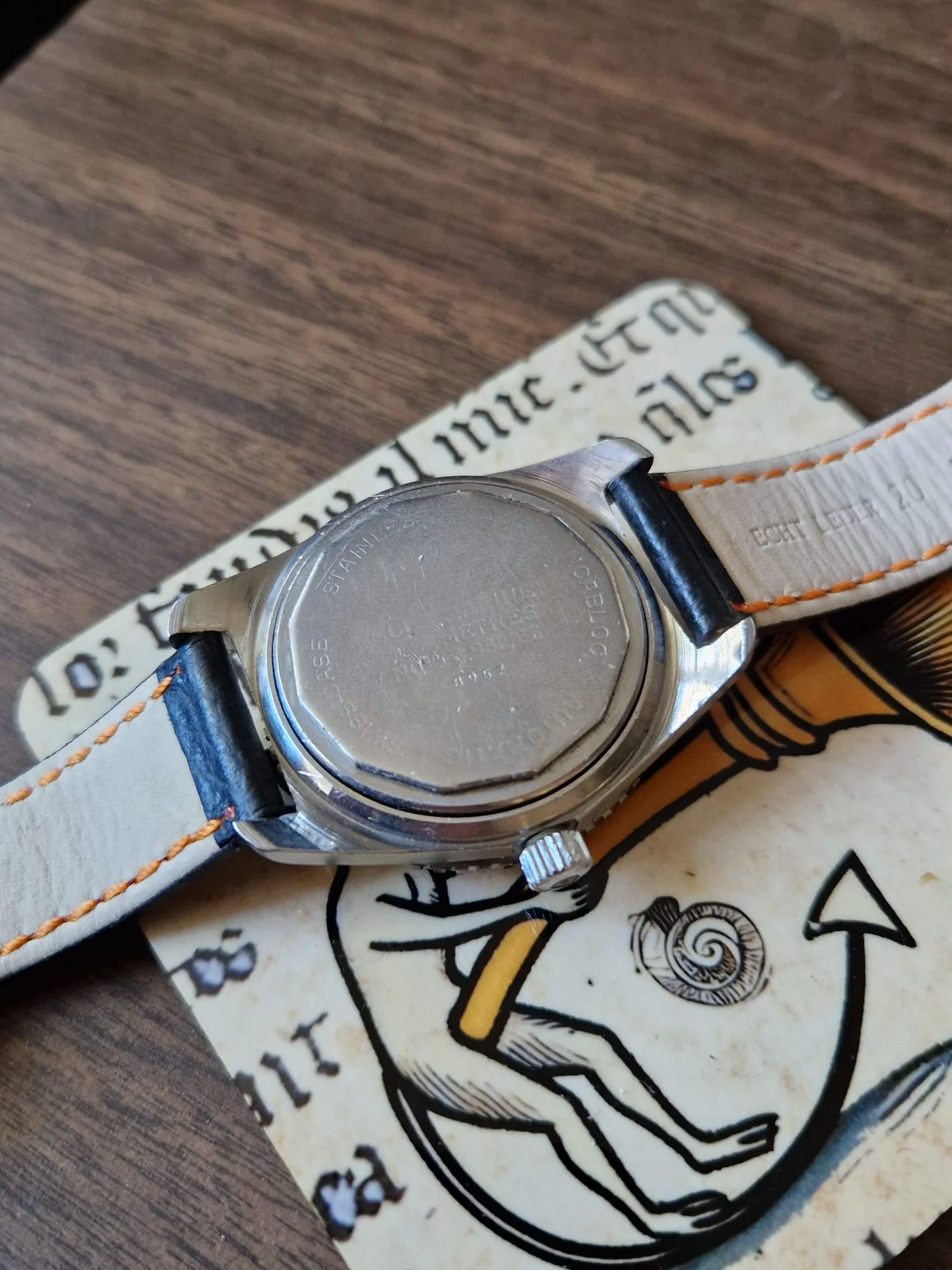 Case & Dial: The 41mm, all-steel case has an impressive wrist presence, especially for a vintage watch from this period. The dial is in the squale-style, with applied trapezoidal indices in an art deco style at the cardinal points, including a metal-framed date window. These are supplemented by smaller, round lumes at the non-cardinal points. It has rectilinear batons with a bifurcated arrowhead at the minute counter, and a small-lollipop sweep second. The case is in good shape, with sharp edges and retaining its original matte factory-finish (unpolished). Lettering on back is clearly visible, though, as is commonly the case with flat watchbacks, shows some honest wear.