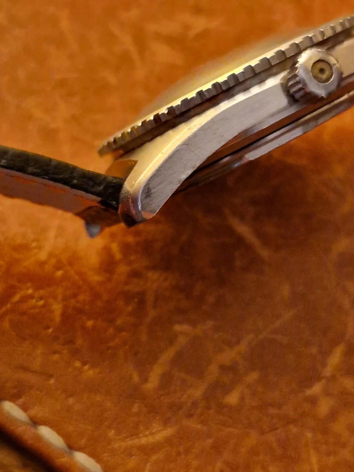 Bezel: The bakelite bezel is a particular highlight. Free of chips or cracks, this is the only time I've seen this colour combo of orange hashes and numerals on a black background. The bakelite is embedded in a thick metal frame with crenelated edges. As is common with such bezels, there has been some slight air intrusion between the top and middle layers of the bakelite, but there is no fading and all the demarcations are clearly visible.