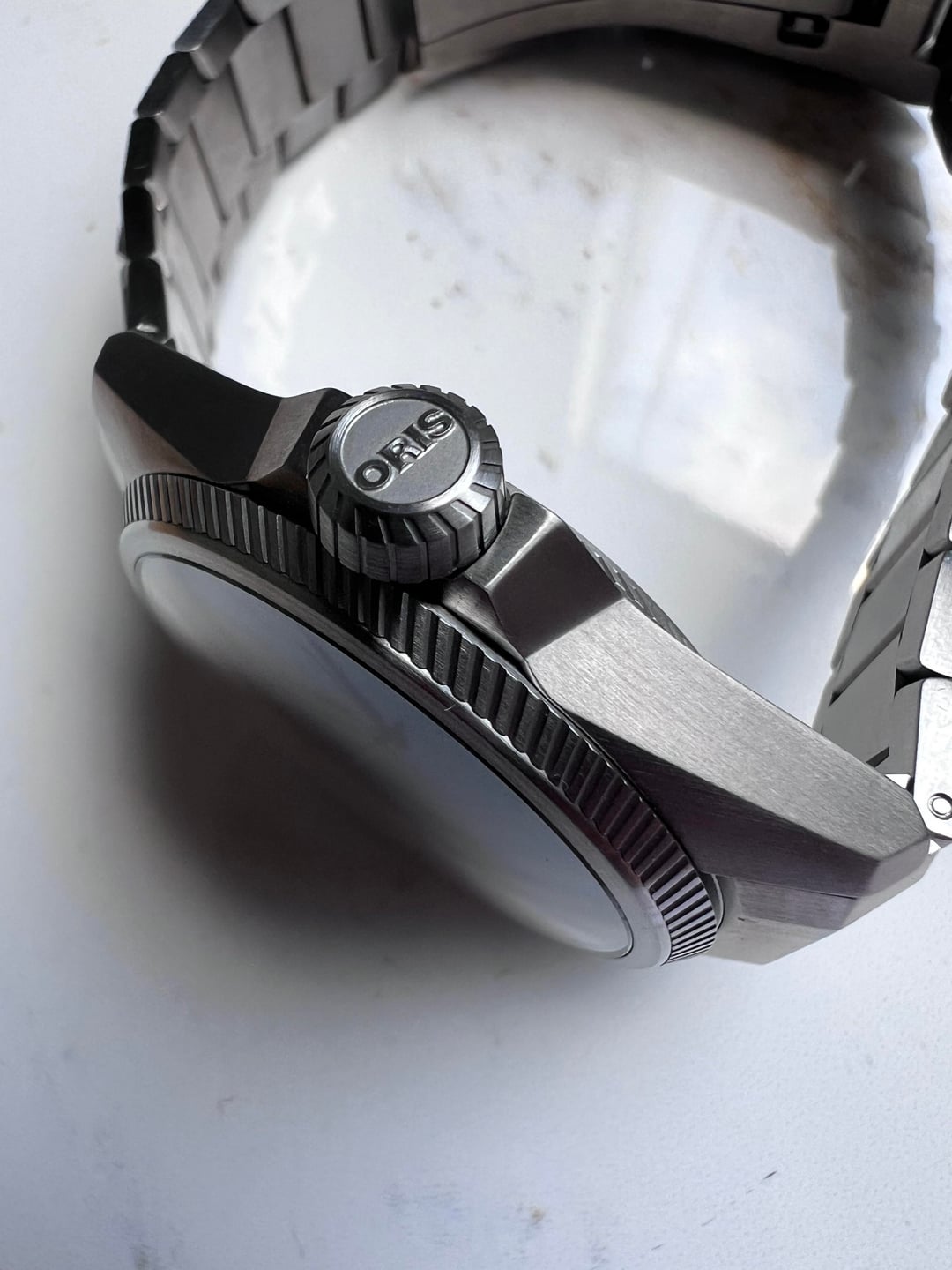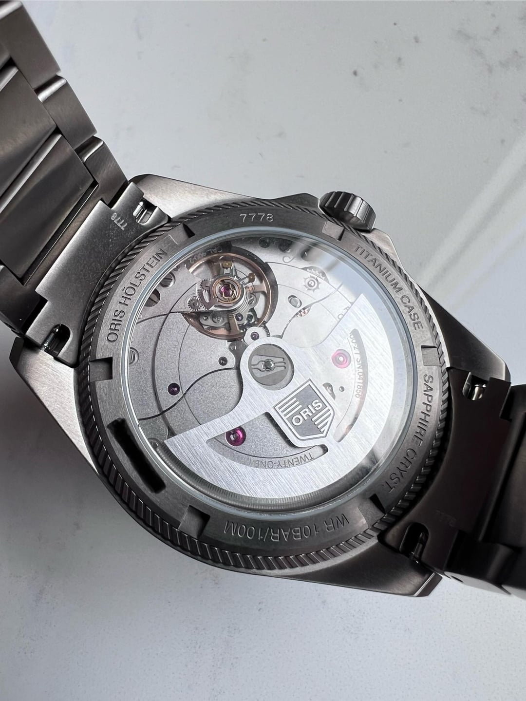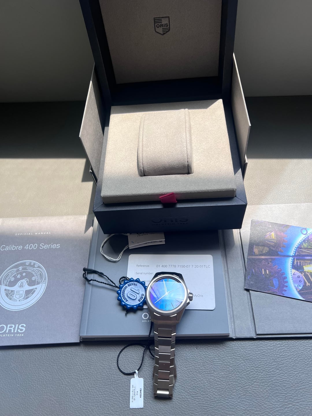 As someone in materials science I have a deep appreciation for how Oris used an innovative laser‑based technique, developed in collaboration with a research lab at ETH Zürich, marking a first in watchmaking. Instead of pigments, the bare titanium surface is micro‑etched by laser to manipulate light: it suppresses red wavelengths while reflecting green and blue, creating a subtle iridescent gradient that shifts between blue, green, and violet depending on the viewing angle. Yes, it’s that bad ass. The titanium case and bracelet make it super lightweight and the way the bracelet articulates makes it supremely comfortable. So you’re asking what’s the problem, right? It feels too small on my almost 8” wrist. Should I get over it? Probably. But it’s just been sitting in my watch box. **Condition:** I wore this watch twice. I wish I could say it was mint but there are a few tiny scratches on one of the links. I zoomed in to highlight that. Otherwise, the watch is like new and the clasp still has protective tape on it. **Scope of delivery:** Double-boxed with manual, warranty card, and hang tags. The warranty is good through 4/2035. **Specs:** Reference number: 01 400 7778 7150-07 7 20 01TLC Case size: 39mm Lug-to-lug: 47mm Case thickness: 12mm Water resistance: 100m **Price:** $4250 shipped to your local FedEx Office hold location. **Methods of payment:** Zelle or bank wire only. **Trades:** A sale is highly preferred but as for trades, I’d be looking for a sports watch 40mm or large, ideally titanium. Open to trading up or down. **References:** Hundreds of successful transactions in watch trading. See my eBay account under the same name. Many references in Facebook groups, watch forums, and on WUS.