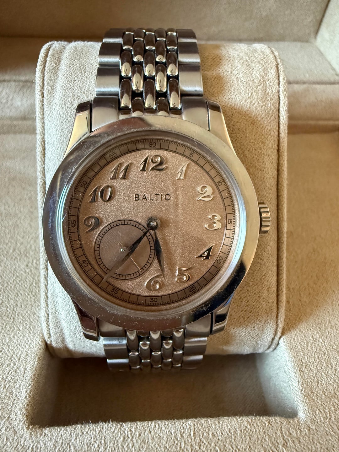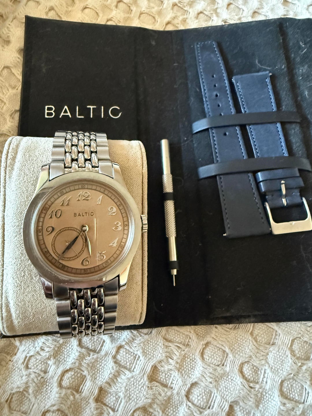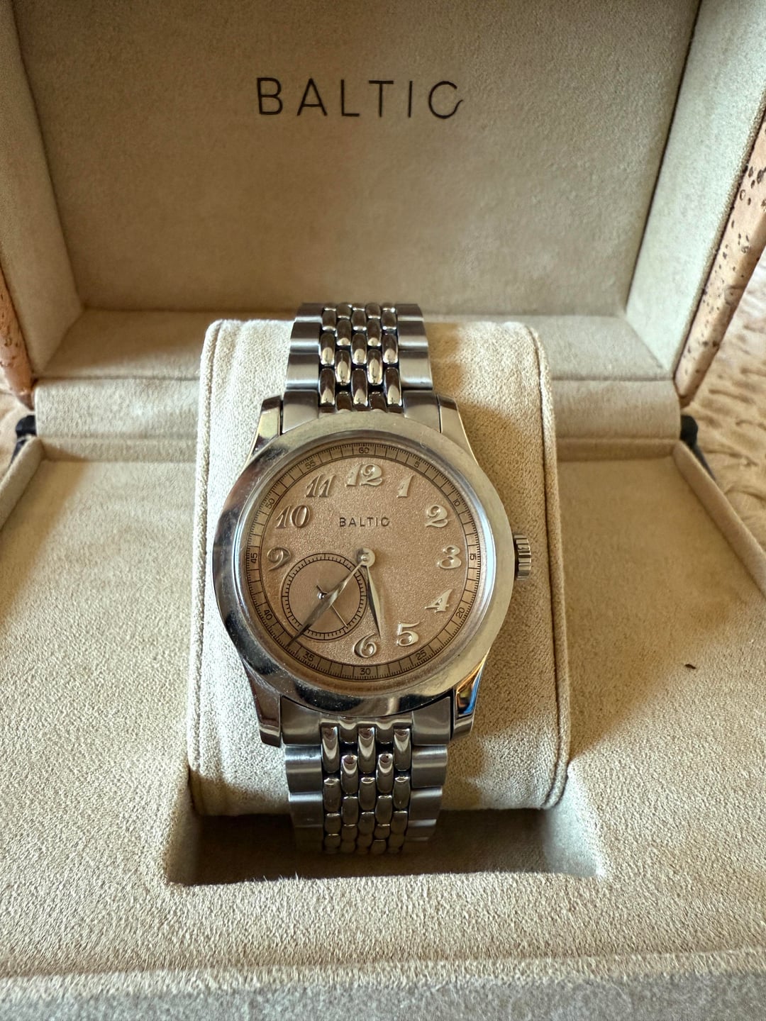 Up for sale is my Baltic MR01 Salmon. This is a full set that includes the upgraded Beads-of-Rice bracelet, the original Baltic leather strap, box, papers, and strap tool. Model: Baltic MR01 Salmon Case: Stainless steel, 36mm Crystal: Domed Hesalite Dial: Salmon dial with applied Breguet numerals and small seconds at 7:30 Bracelet/Strap: Beads-of-Rice bracelet (currently fitted) + original Baltic leather strap Condition: Shows normal light wear, runs well. Crystal and dial are clean. Extras: Box, papers, strap tool, both straps included Price: $475 shipped CONUS Payment: PayPal F&F or Zelle Location: Los Angeles, CA Shipping: CONUS included, international available at buyer’s cost