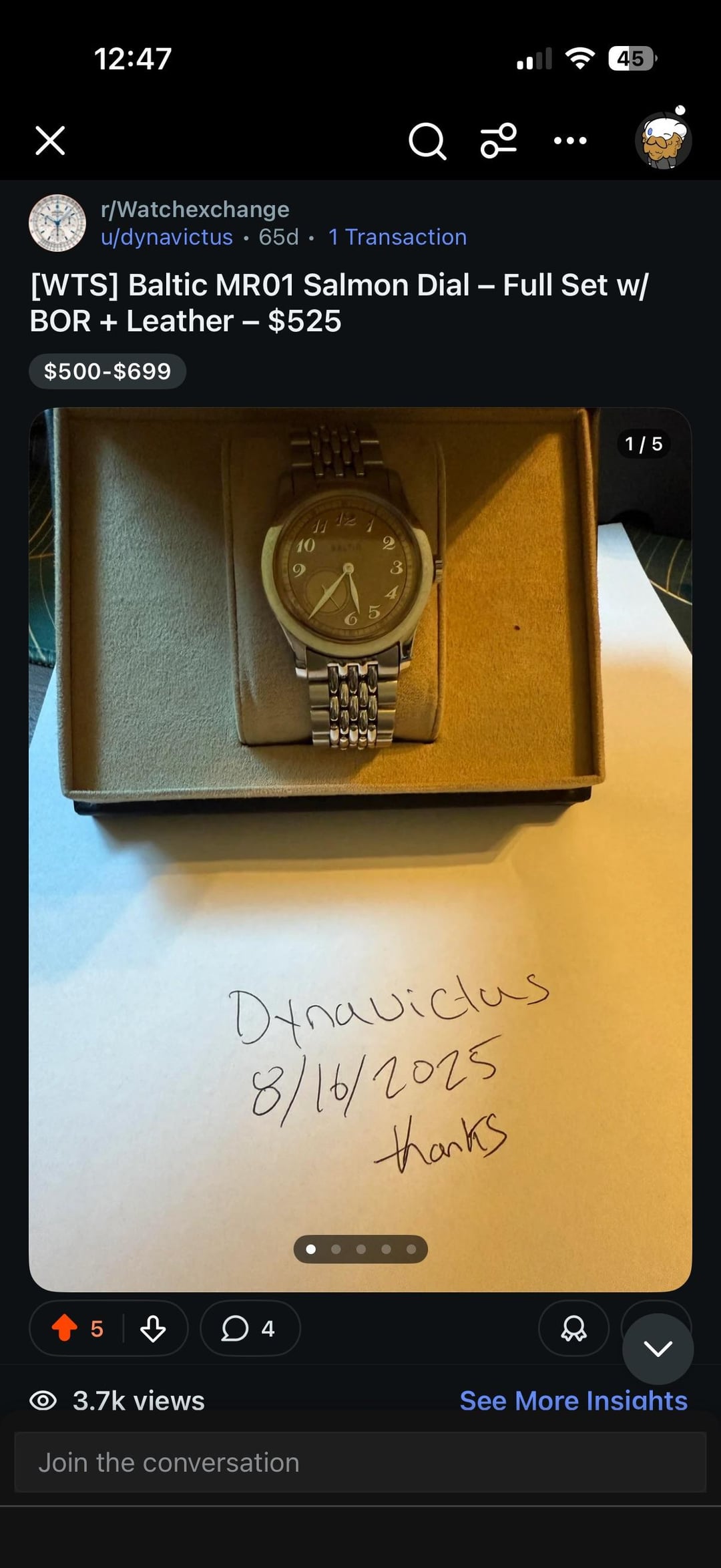 ![Thumbnail [WTS] Baltic MR01 Salmon Dial – Full Set w/ BOR + Leather Strap – $475 3](https://cdn-cf.watchpatrol.net/120x120/img/full/ca68cbf6cff141b4c13195f23c2de925e280b728.jpg)