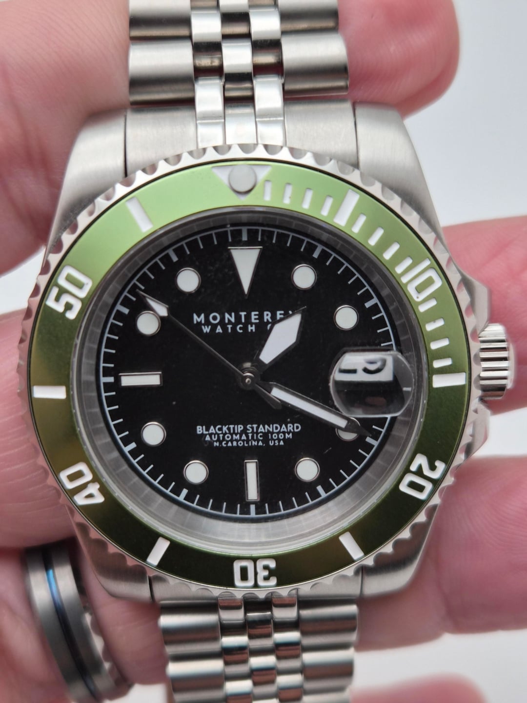 For Sale – Monterey Watch Company Black Tip Standard - Custom Harrods Green Dial Condition: Pre-owned, in excellent condition. Watch details: 40mm 12mm Height Unidirectional Ceramic Bezel Date Window with Magnifier Sapphire Crystal 100m Water Resistant NH35A Movement Luminous Dial and Markers Solid Case Back Screw-Down Crown Stainless Steel Bracelet Includes: Box Price: $235 Shipping: Free shipping within the CONUS. Payment: PayPal F&F, Venmo F&F, or Zelle accepted. Location: Fernandina Beach, Florida Thank you for viewing my listing!