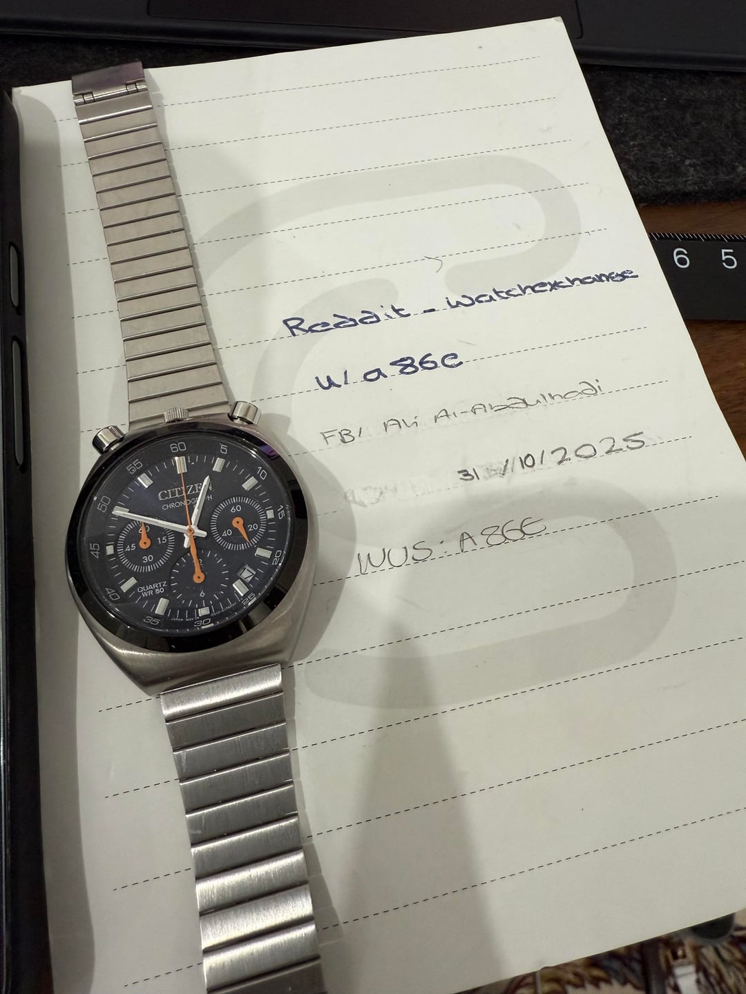 Hey all, Watch is in overall excellent condition, few marks on the links near the buckle from resizing. Nothing major really. 38 mm case, Citizen Bullhead Record Label Tsuno Chronograph Quartz, watch only Asking price: $225 TYD via UPS or Fedex Not interested in trades Please read the disclaimer before shooting a PM Thanks ⸻ Watch Sale Disclaimer: • I am a private collector, not a store or reseller, and I am not affiliated with any watch brand mentioned in this listing. • The watch will be shipped from Kuwait via FedEx, and a tracking number will be provided to the buyer once dispatched. • Buyer is responsible for any customs duties, VAT, or import taxes that may be charged upon delivery, depending on your country’s regulations. • I welcome all reasonable requests for additional information, including more photos and/or videos to verify the watch and its condition. • Payment terms: • Established Watchexchange members with verifiable feedback may pay via PayPal Goods & Services only, I do not accept Friends & Family nor Zelle • New or low-feedback users must pay via wire transfer. All watches are sold as-is, with details described to the best of my knowledge. Serious inquiries only, please. Thanks for looking