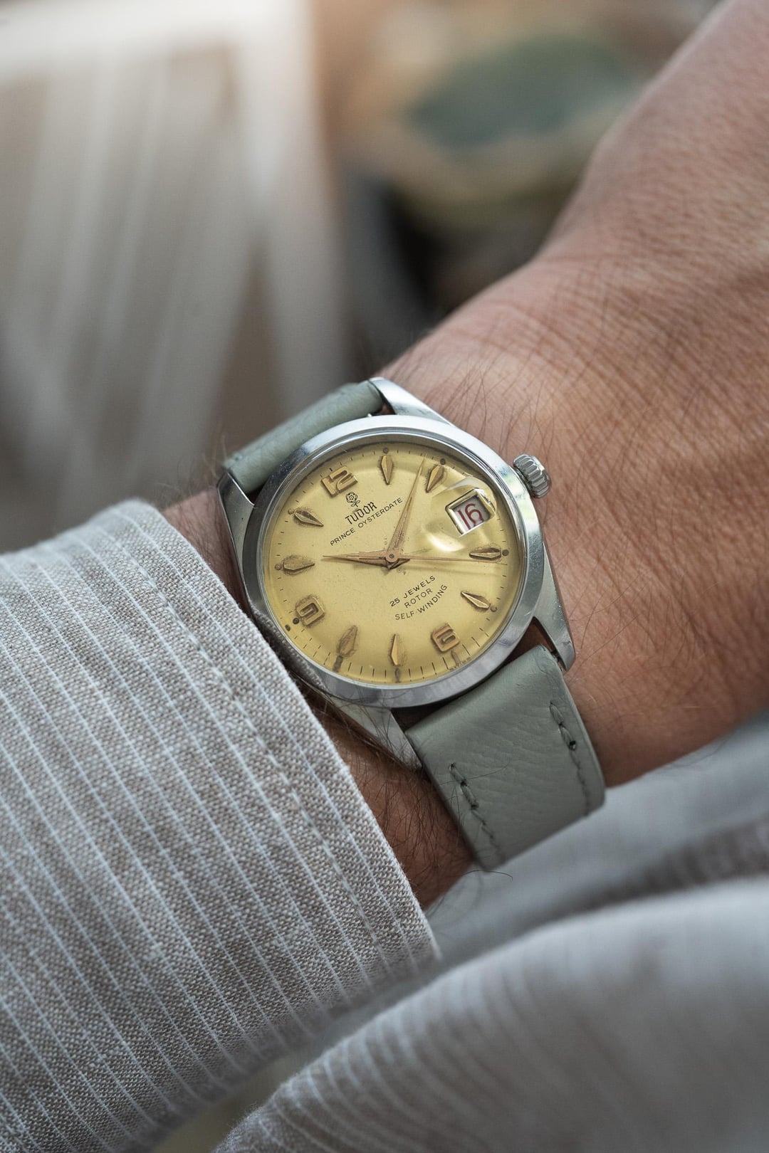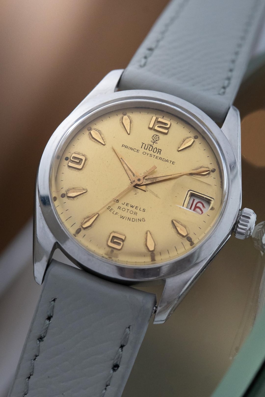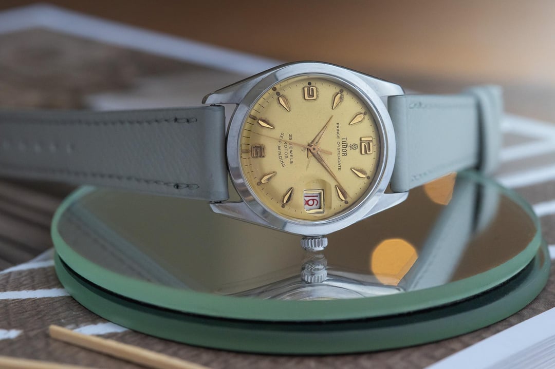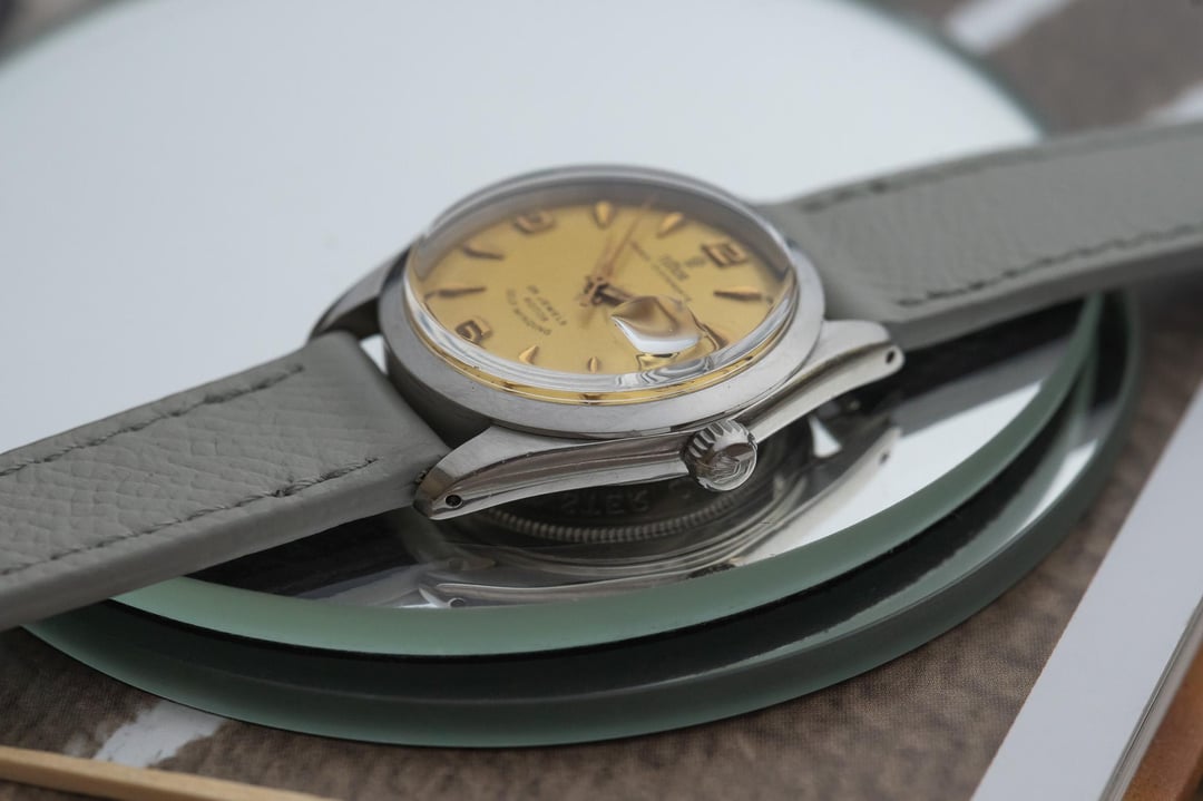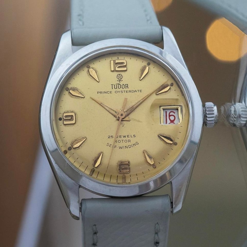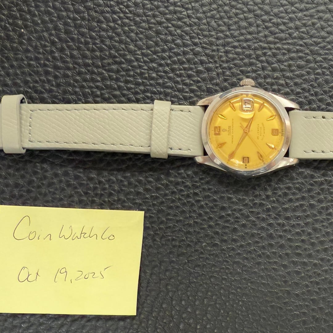 This is a beautiful example of a 1966 Tudor Prince Oysterdate, reference 7966/0, is presented in all original and highly attractive condition. The watch features a striking gold dial that stands out elegantly against its stainless steel Oyster case, creating a timeless and eye catching contrast that exudes vintage charm. One of the most desirable details of this piece is its roulette date wheel, with alternating red and black numerals, a feature that is both rare and highly sought after among Tudor and Rolex collectors alike. Recently serviced by our watchmaker, this Tudor is running smoothly and ready to be enjoyed for years to come. Combining classic mid-century style with mechanical reliability, this 1966 Tudor Prince Oysterdate makes an exceptional addition to any discerning watch collection. The serial begins with 589xxx dating this watch to 1966. THE DETAILS: Case: 34 mm stainless steel case showing honest signs of previous wear. Dial/Hands: Original Tudor gold dial showing honest signs of aging as seen in the photos including some patina around the markers and marks on the dial. Original hands showing honest signs of wear Caseback: Original stainless steel in showing honest signs of previous wear Movement: Original Tudor automatic winding movement which has been serviced by our watchmaker and is currently running +9 seconds per day Bracelet/Strap: Bespoke grey leather band with quick release pins making it easy for quick removal! Crystal: Original acrylic in attractive condition Accessories: This watch comes watch only, it does not come with box or papers Available for sale $2190