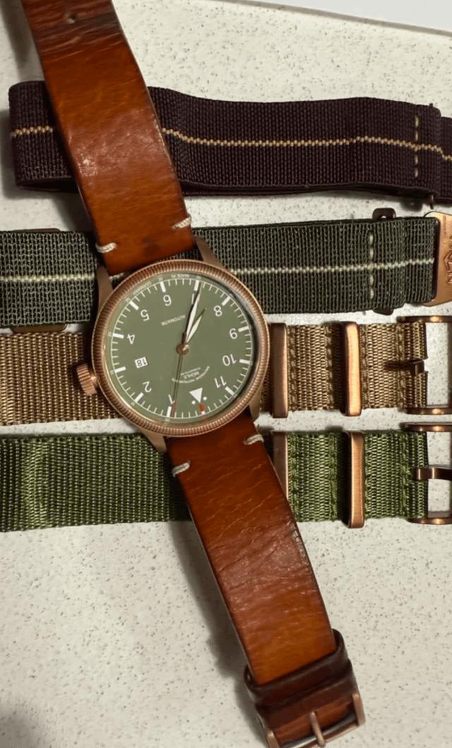Selling my Mühle Glashütte Terrasport IV Bronze Limited Edition (#179/250) with “khaki” green dial. This is a catch and release. It's a very cool watch but at 42mm is a tad big for my wrist. The watch is in overall great condition. Crystal/case/bezel are clean, made the crown has a small scuff as shown in photo. I’m happy to send additional photos on request. $1400 shipped, CONUS only. Paypal/Venmo preferred. 42mm case, 10.2mm H, 22mm lug width. SW200-1 automatic movement with Muhle version woodpecker manufactured regulator 38h reserve. Double anti reflective sapphire crystal. Luminous hands and hour markers. Is has the box, papers, and original leather strap with normal signs of wear. Also included are 2 nato style straps and 2 Erika’s Original para straps (approx 120usd each), all with bronze hardware to keep the theme. 10 bar water resistance.
