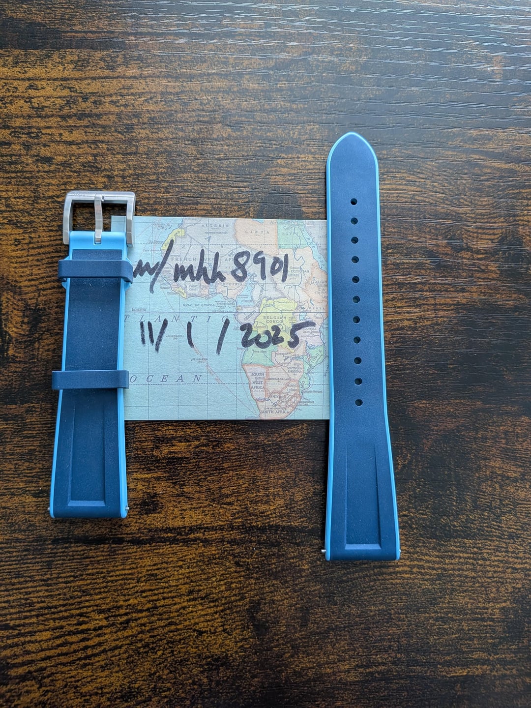 For Sale: Christopher Ward 20mm Blue/Light Blue Aquaflex Rubber Strap SKU: 20-RUB-05-SXBB-DC-ST 316L Steel Clasp Comes with Box $50 Shipped (CONUS). International Shipping on your label. Glad to do a FaceTime/video call or provide more photos if needed. Accept Zelle, Venmo, PayPal (Buyer pays fees). For Sale Only. No trades.