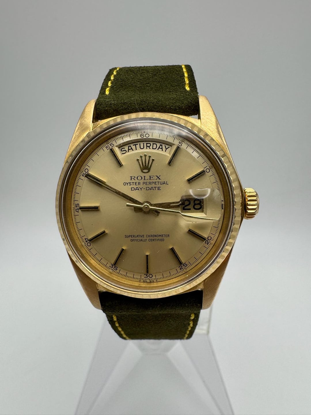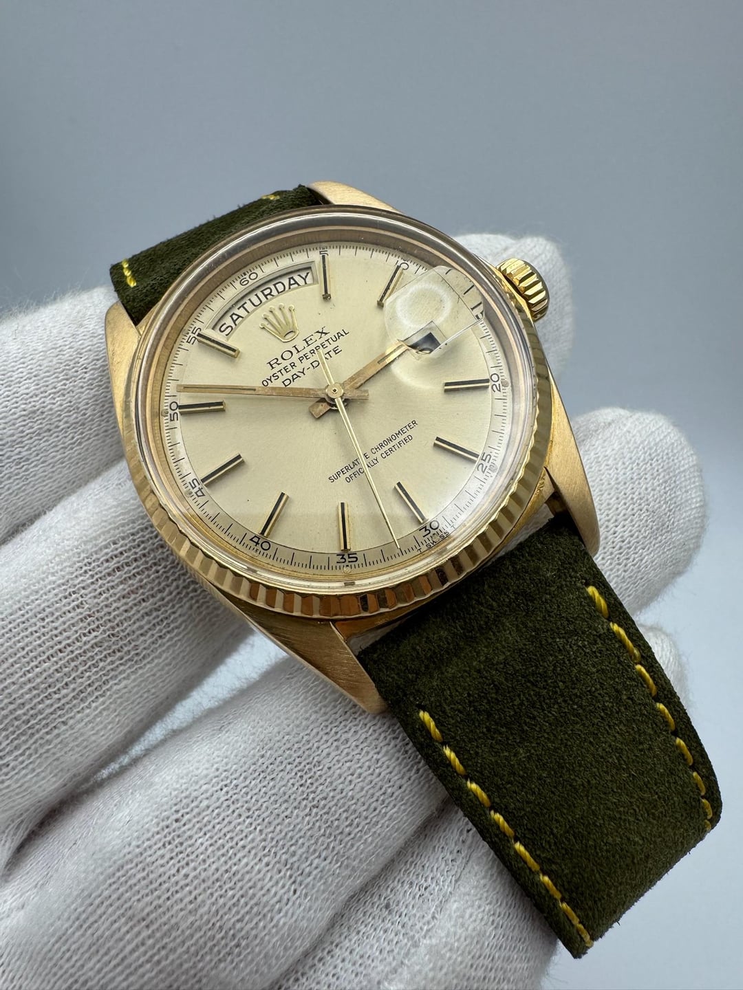 Rolex Day-Date 1803 18K Yellow Gold – A Distinguished Example of the Iconic Presidential This vintage Rolex Day-Date 1803 is presented in 18K yellow gold and remains in very nice overall condition. The case was polished in the past but retains sharp lugs and strong definition. Its original period-correct pie pan champagne dial is clean and well-preserved, showing only minimal signs of age. The movement has been checked and runs properly, with the last known service performed about a year ago by the previous owner. All reference and serial numbers are crisp and fully legible, with a serial in the 2.5 million range dating back to approximately 1968. This example is fitted with a new 20/16mm green suede leather strap paired with a gold-plated Rolex pin buckle, completing a refined and classic presentation of one of Rolex’s most celebrated models. **Reference:** 1803 **Size:** 36mm **Year:** 1968 📜 Includes: Custom [travel pouch](https://bogossia.com/products/travel-carrying-case) ($50+ value) 💵 Price: $8,000 + FREE overnight shipping with FedEx fully insured. [Timestamp](https://imgur.com/a/Wz5BEp3) 🔥 Follow us on [Instagram](https://www.instagram.com/bogossiajewelers) 📍 Location: New York 🔒 Authenticity: 100% guaranteed, buy with confidence. We have 150+ reviews on Chrono24 with 180+ transactions, and Excellent rating score on Trustpilot. Visit our [profile](https://www.reddit.com/u/BoghossianJewelry/s/vm81HAdB7o) for links and references. 📦 Domestic Shipping: Ships with FedEx overnight, within 24 business hours of payment, from New York, NY to CONUS. The shipment is fully insured against damage, loss or theft. 🌍 International Shipping: Incurs an additional $100. 💳 Payment: PayPal/CC (+4%), Web, or Face-to-face deal in NY. 🔐 [Seller References](https://bogossia.com/authenticity) 🔗 [Other Listings](https://www.reddit.com/u/BoghossianJewelry/s/vm81HAdB7o) 📸 [IG: @bogossiajewelers](https://www.instagram.com/bogossiajewelers)