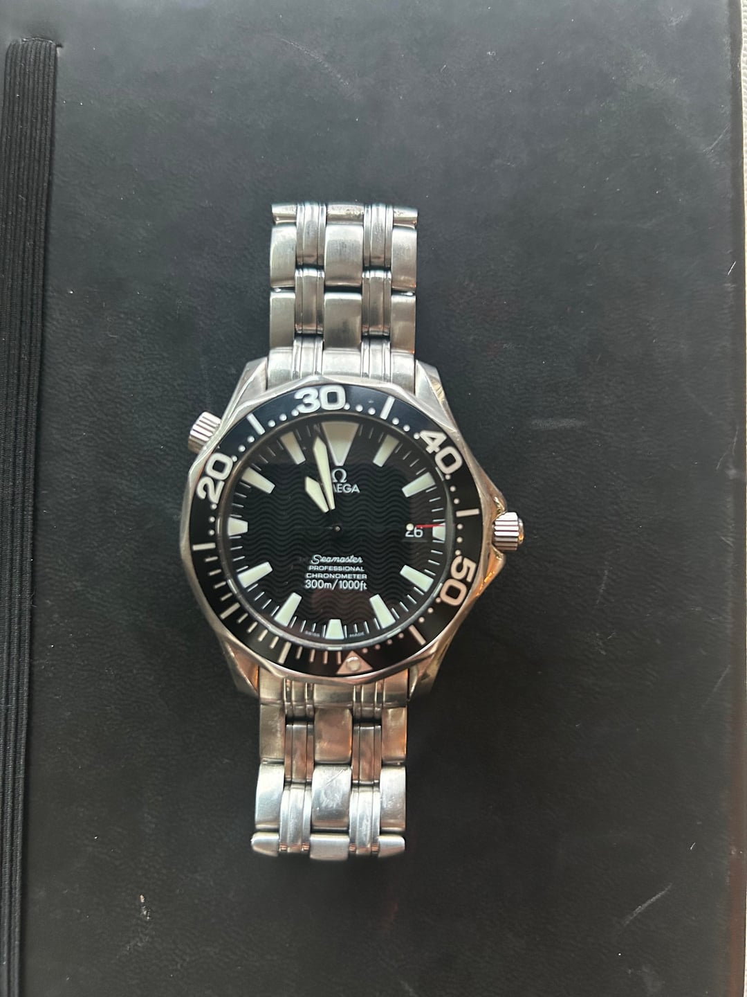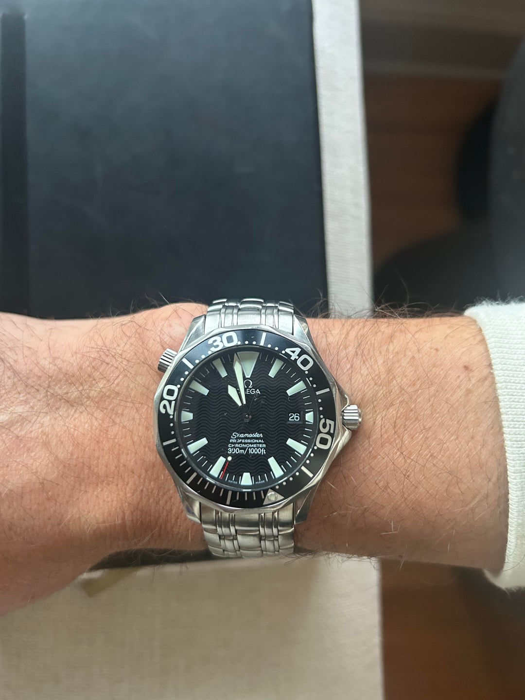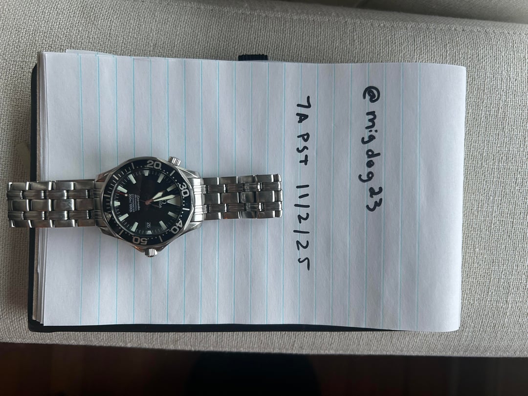 Hello! I'm selling my Omega Seamaster Peter Blake Automatic in 41mm, ref 2054.50. Featuring a 41mm case, black wave-pattern dial, bold sword hands, and a unidirectional bezel with minute markers. It’s powered by the Omega Caliber 1120 automatic movement, offers 300 meters of water resistance, a helium escape valve, and a date display at 3 o’clock. Similar to the Peter Blake 2254.50, this reference features a Bond style bracelet vs the Speedmaster found on the 2254. Personally I prefer the weight on this bracelet. Condition: Good pre-owned condition with normal wear (light scratches and scuffs) on case and bracelet. Nothing deep. Scope of Delivery: Watch only. Bracelet can fit up to 7.25" wrist. Asking $2700 shipped and insured to CONUS. No trades please. Payment Methods: Zelle accepted. PayPal F&F available for established WatchEx users. I have zero sales transactions on this channel so would be happy to FaceTime or have a call. This watch was previously and recently purchased on this fine channel. Thanks!