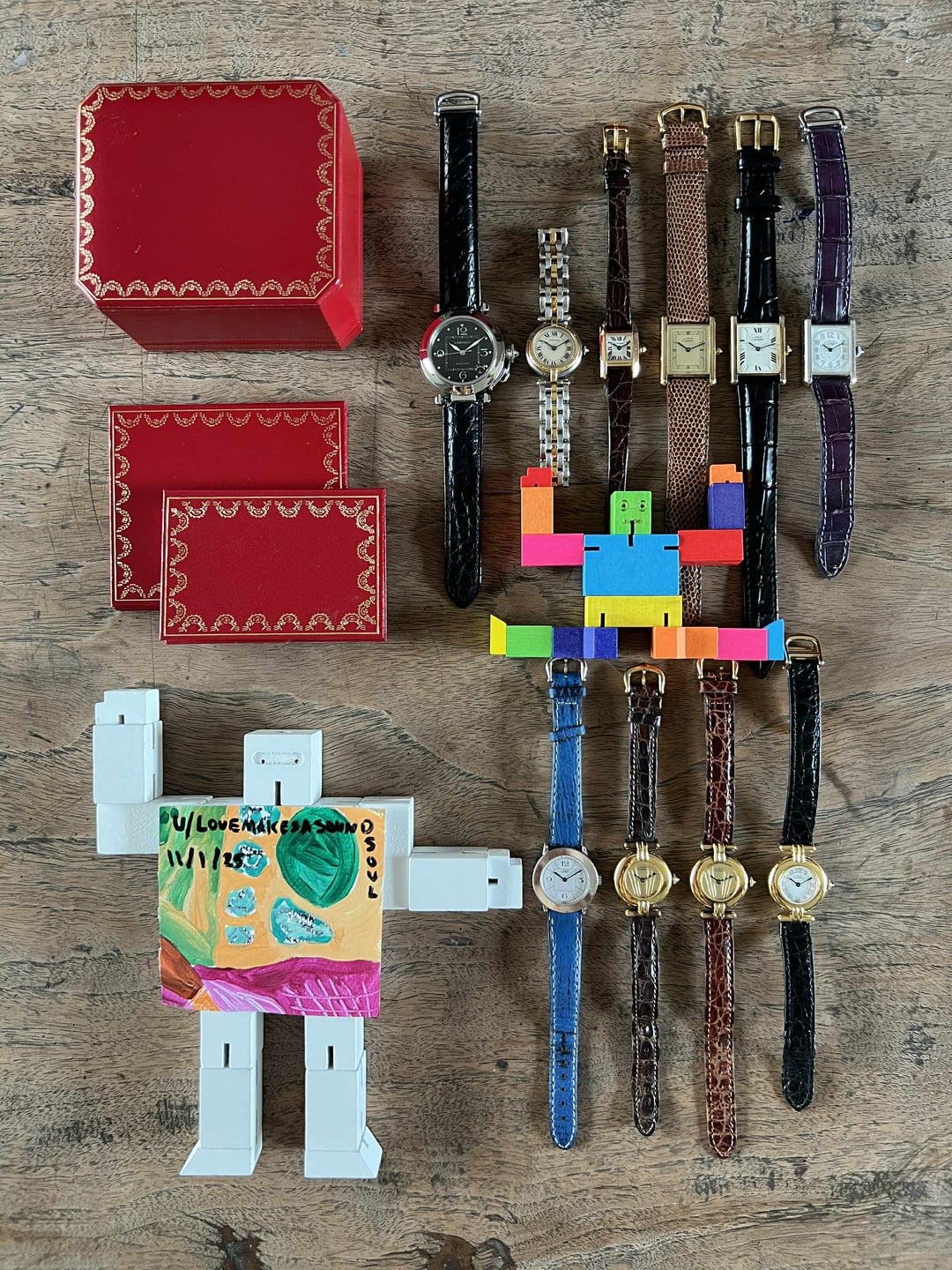 **Hello WatchExchange!** **Photos:** I shoot under harsh lighting so you see every bit of wear. On wrist, these look much better. **Details (from top left to right then bottom left to right):** **$1900 -** [**Pasha C Ref.2324 2002 Christmas Limited:**](https://imgur.com/a/cartier-pasha-c-ref-2324-2002-christmas-limited-automatic-watch-55zkYcp) The dial is a stunner on this one. At times a deep flush black and at other times a lovely tapestry. More muted or subtle than a Rolex tapestry dial. Please see the photos of the dial to see how it looks in all lighting conditions. 35x35mm case. Movement in excellent condition. Automatic movement. Recent service by a professional watchmaker. Keeps time up to post-service standards. Also checked wound laid flat for two days. Case without any wear to mention. Crystal also spotless. Dial without any wear. No other signs of wear to mention. On a Cassis genuine alligator strap with a Cartier deployant buckle. Strap is brand new. Will fit most wrist sizes but preferred on larger wrists. Watch only. **$1900 -** [**Panthere Vendome Ref.166920:**](https://imgur.com/a/cartier-panthere-vendome-ref-166920-1-row-quartz-watch-dBQah8x) Although these come with many references, this specific reference is the only one dating back to the 80's. Other references were usually produced in the 90's. This one also has some patina forming through the base of the hands. I did have the movement checked for water damage but there wasn't corrosion, rust, nor dust to note. 24x24mm case. Movement in great condition. Quartz movement. Case with moderate wear in the form of scratches. Case is entirely steel with an 18k gold bezel. Crystal without any scratches. Spotless dial. On its original 1-row 18k Panthere bracelet with a Cartier double hidden clasp. The bracelet exhibits light wear and the stretch observed is normal for the bracelet type. Will fit up to a 6" wrist best as is. Watch only. **$3950 -** [**Tankissime Ref.2829 w/ Box:**](https://imgur.com/a/cartier-tankissime-ref-2829-18k-rose-gold-quartz-watch-kY1grBj) One of few on the market at this time. Substantial waitlist for this piece from Cartier. 16.5x24.5mm case. Movement in excellent condition. Recent service by professional watchmaker. Quartz movement. Light hairline scratches across the case with maybe one or two scratches that can be seen without scrutinizing. The case is entirely 18k rose gold filled and is unpolished. The crystal and dial are both in spotless condition. On an aftermarket crocodile strap with an aftermarket buckle. The strap has light wear. Will fit most wrist sizes however preferred on larger wrists. Strap will likely need adjustments on a dainty wrist. Serial is verifiable via Cartier Care. Watch and box. **$1700 -** [**Tank LM Small Roman Gold:**](https://imgur.com/a/cartier-must-tank-lm-ref-681006-small-roman-gold-quartz-watch-isrSBaQ) 23x30mm case. Movement in great condition. Quartz movement. Case with hairline to minor scratches. Tarnish on case abovce and below the crystal. Crystal with minor scratches. Dial without damage to note. On a new Cartier lizard leather strap with a Cartier gold plated tang buckle. Will fit most wrist sizes as is. Watch only. **$1650 -** [**Tank LM Ref.1615:**](https://imgur.com/a/cartier-tank-lm-ref-1615-quartz-watch-wakf6T2) 23x30mm case. Movement in excellent condition. Quartz movement. Light scratches and some rusting on the case. Case plating is not peeling. Crystal is nearly spotless with a smudge near the bottom left. Raised indices with a monogram basin on the dial. Generally clean dial with specks of dust. On an aftermarket genuine leather strap with an aftermarket gold plated buckle. Will fit most wrist sizes but preferred on larger wrists. Watch only. **$1700 -** [**Tank MM Ref.2614 Arabic:**](https://imgur.com/a/cartier-must-tank-mm-ref-2416-arabic-quartz-watch-6L5PivC) 22x29mm case. Movement in excellent condition. Quartz movement. Case with hairline scratches with one minor scratch. Case is entirely sterling silver so softer than a typical gold plated tank. Crystal without scratches. Dial without damage to note. On its original Cartier alligator leather strap with a Cartier steel deployant buckle. Strap with light to moderate wear. Will fit most wrist sizes as is. Watch only. **$825 -** [**Ronde SM Ref.1806:**](https://imgur.com/a/cartier-ronde-silver-ref-1806-quartz-watch-YOVGfsO) 27x27mm case. Movement in excellent condition. Quartz movement. Case with substantial scratching and general wear. Spotless crystal and dial. On its original Cartier painted leather strap with a Cartier tang buckle. Some stiffness in the pre-conditioned strap but otherwise no cracking. Will fit most wrist sizes. Watch only. **$795 -** [**Colisee SM Gold Dial w/ Papers:**](https://imgur.com/a/cartier-colisee-sm-gold-dial-quartz-watch-w-papers-PLMm9Bq) 24x24mm case. Purchased from KAM's in Paris. Movement in excellent condition. Quartz movement. Case with moderate wear. Crystal with two hairline scratches. Dial with a single mark near 9 o'clock. On its original Cartier crocodile strap with a Cartier tang buckle. Strap with moderate wear but no cracking. Will fit most wrist sizes but preferred on smaller wrists. Watch and papers. **$725-** [**Colisee SM Gold Dial:**](https://imgur.com/a/cartier-colisee-sm-gold-dial-quartz-watch-wHSZgkR) 24x24mm case. Movement in excellent condition. Quartz movement. Case with moderate wear. Case plating is not peeling. Spotless crystal and dial. On its original Cartier crocodile strap with a Cartier tang buckle. Lightly worn strap with supple feel and no cracks. Will fit most wrist sizes. Watch only. **$850 -** [**Colisee SM Ref.2410:**](https://imgur.com/a/cartier-colisee-sm-ref-2410-quartz-watch-hnBR8k8) 24x24mm case. Movement in excellent condition. Quartz movement. Case with only minor hairline scratches. Two very subtle hairline scratches on the crystal. Spotless dial. On its original Cartier crocodile strap with a Cartier deployant buck