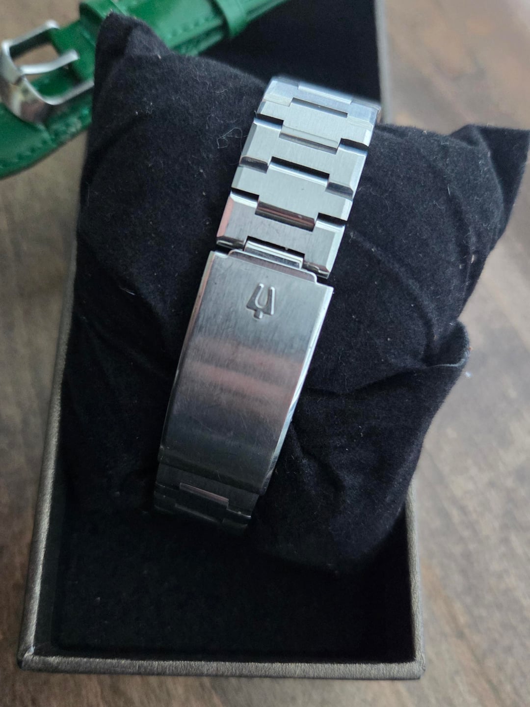 Fully restored from eBay seller, purchased 2024, recently replaced the battery, running great. Comes with green leather strap, vintage Bulova stainless steel bracelet. Asking $800, Zelle/PayPal F&F accepted.