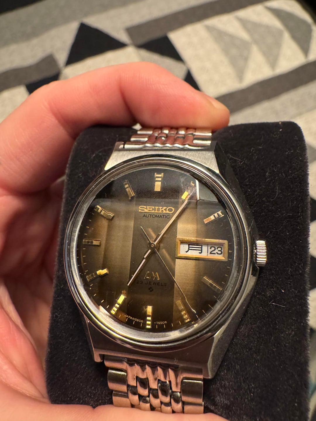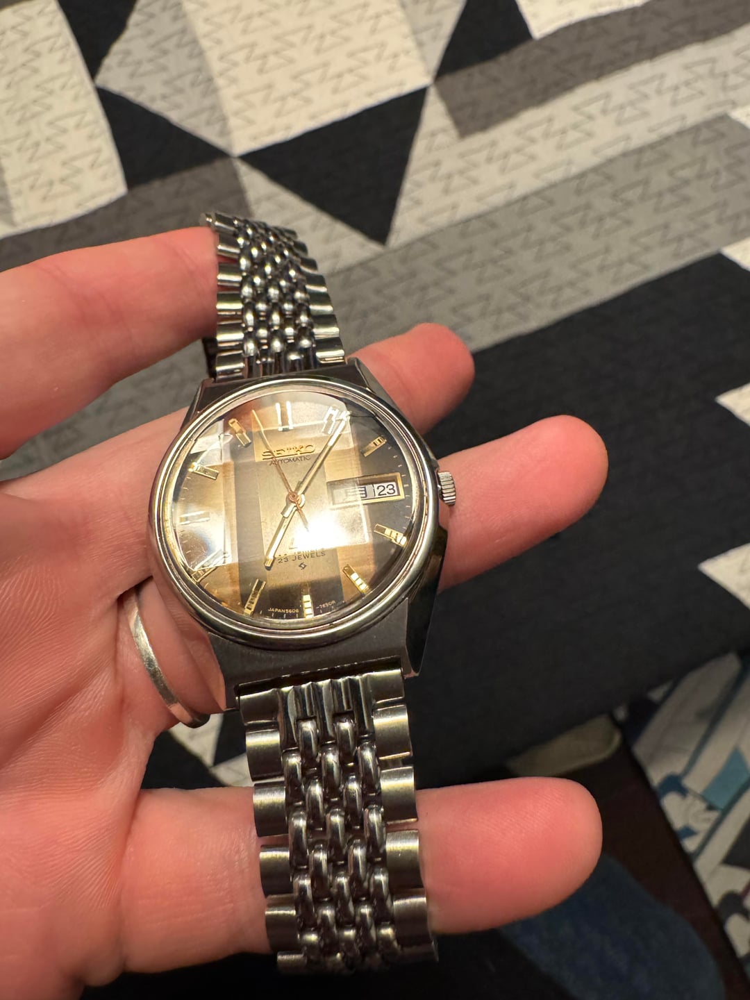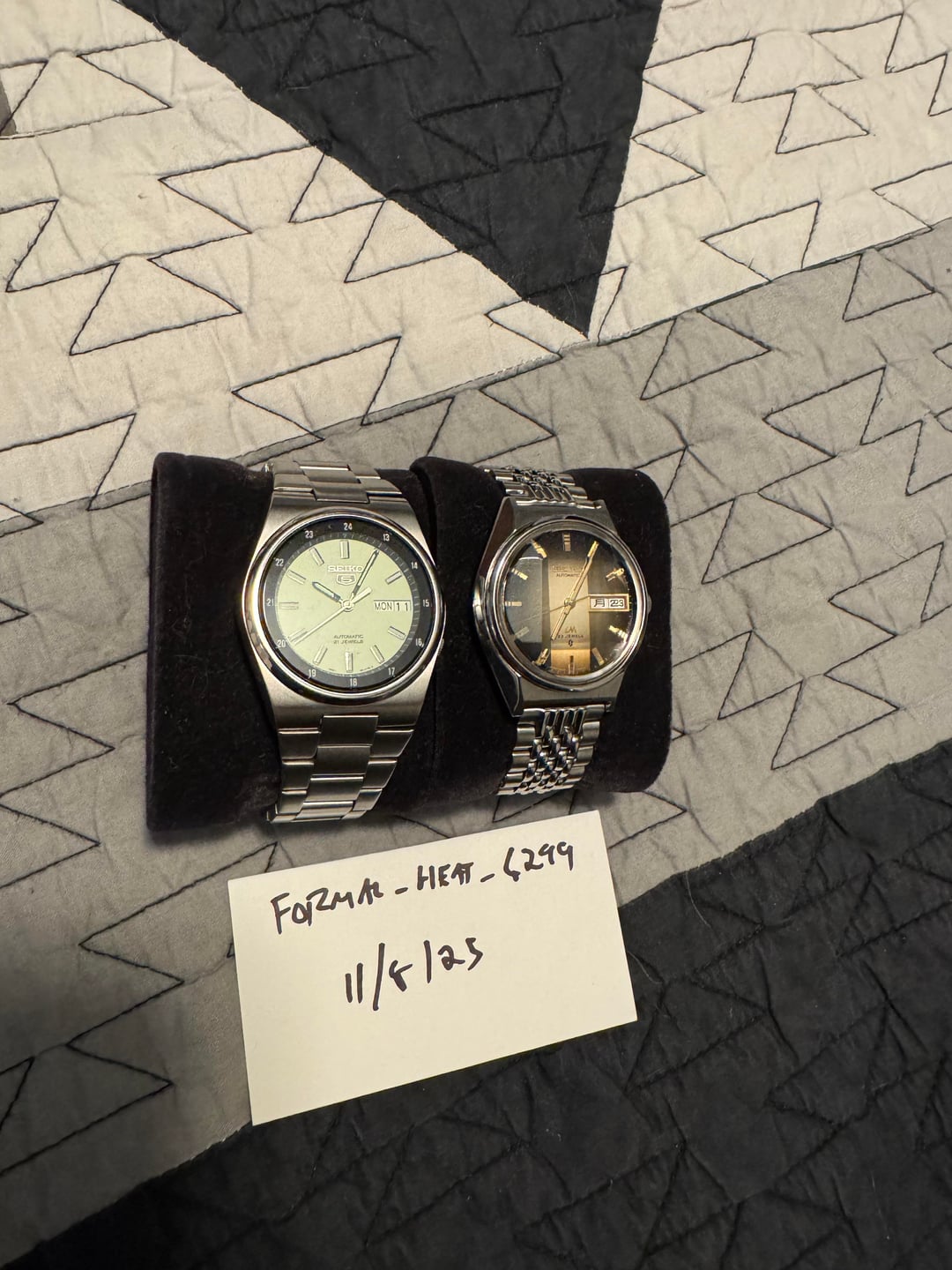 up for grabs are two of my vintage seikos that don’t get enough wrist time. first is a seiko 5 series full lume dial with integrated bracelet, date, and spanish/english day wheel. not sure of production date but somewhere in late 90s early 2000s. larger of the case sizes for this model (wears like a 38 or 39) which i’m told is rare. also has a display case back second is a 1970s lordmatic with a beautiful amber dial and square cut crystal. must see in person to really get the sparkling effect of this! beads of rice bracelet, date, and eng/kanji day wheel. both sizes for my ~6.75 wrist but both come with several extra links. both are watch only. $150 for the 5 series $250 for the lordmatic $350 for the pair! shipped CONUS feel free to DM for more pics, video or questions!