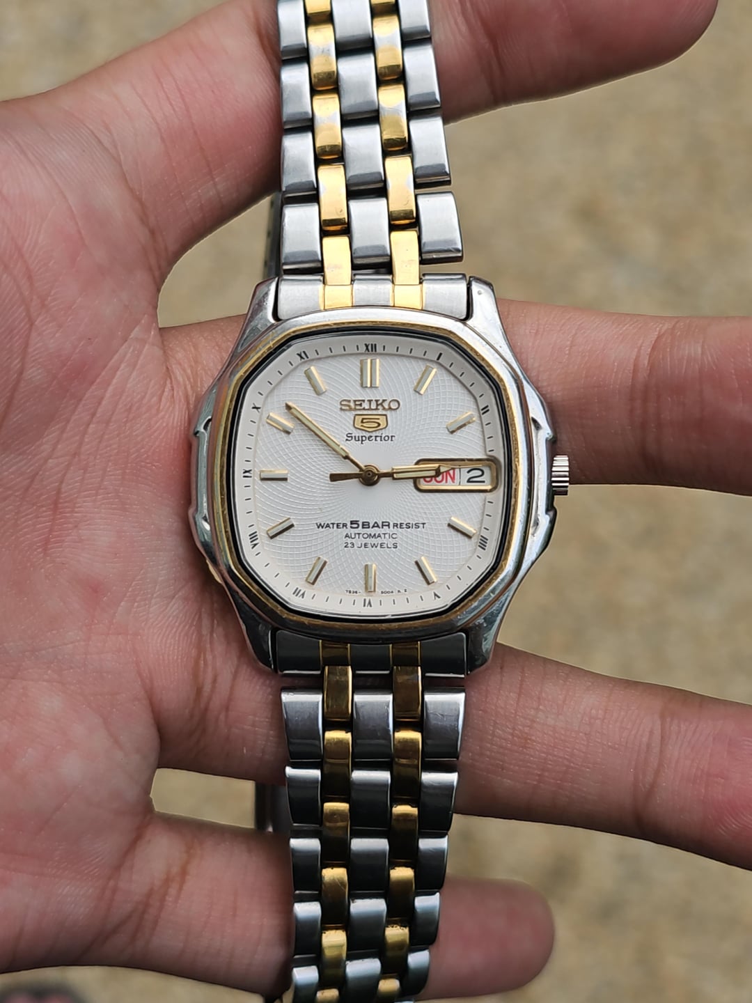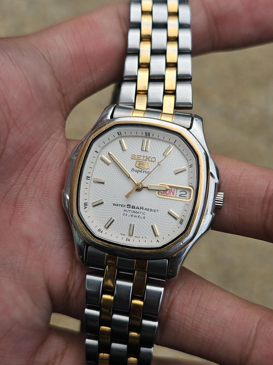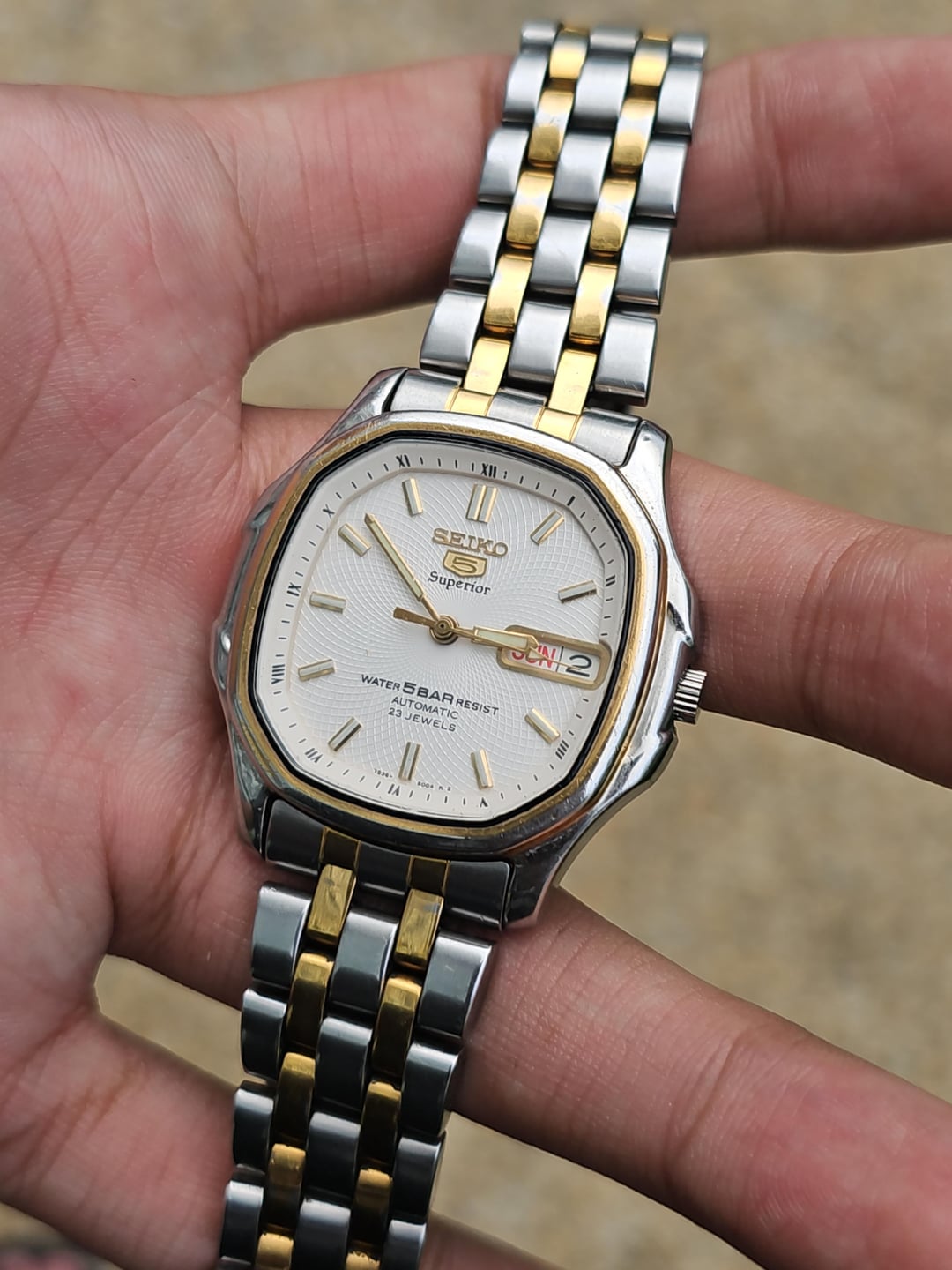 Hello! r/watchexchange, up for sale is a two-tone Seiko 5 Superior with a whirlpool dial. This is an automatic watch from the 90s, featuring stunning whirlpool dial and a unique TV case shape. Condition: - Watch has just been recently serviced, runs perfectly well. - Can provide additional links at buyer's request for free. Currently it fits my 17cm wrist with some allowance - Case is in good condition with some scratches, although there is fading at the front portion of the case. The rest of the gold plating is honestly in great shape (especially given the age), so I wanted to keep it in its original shape. Case is in unpolished condition. - Scratch on glass is apparent, but I wanted to keep it to the original glass. It's far less noticeable in natural light and blends in fairly well with the dial. - Can do alterations to the aesthetic appearance of the watch at buyers expense, and if it's an assured buy. - Watch comes with a replacement box, no papers Timestamp: https://drive.google.com/file/d/1WbZlf0V-KZ08Yo-h901oZA7RfeogzJBZ/view?usp=drivesdk Pricing, Payment & Shipping Price: $350 Shipped via DHL express Payment Method: I heavily prefer WISE payment because it has substantially better rates but will take PayPal F&F or G&S with 4.4% Paid by buyer. No trades. Willing to answer questions and hear offers