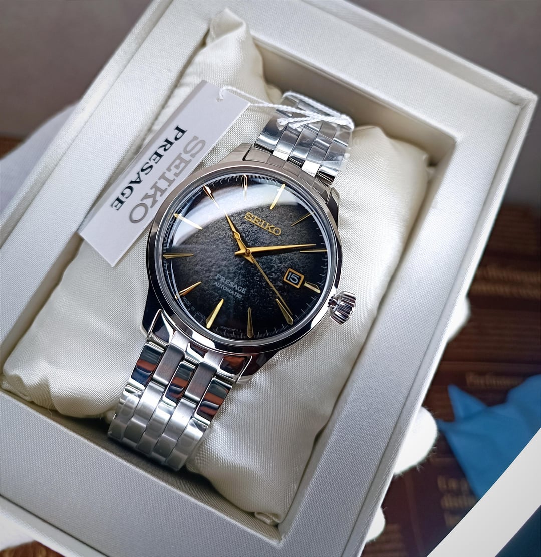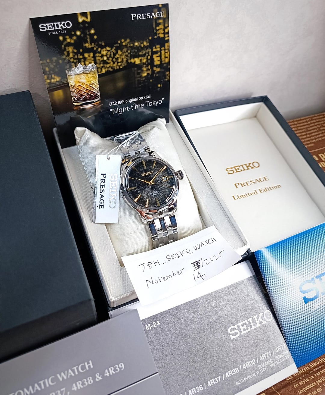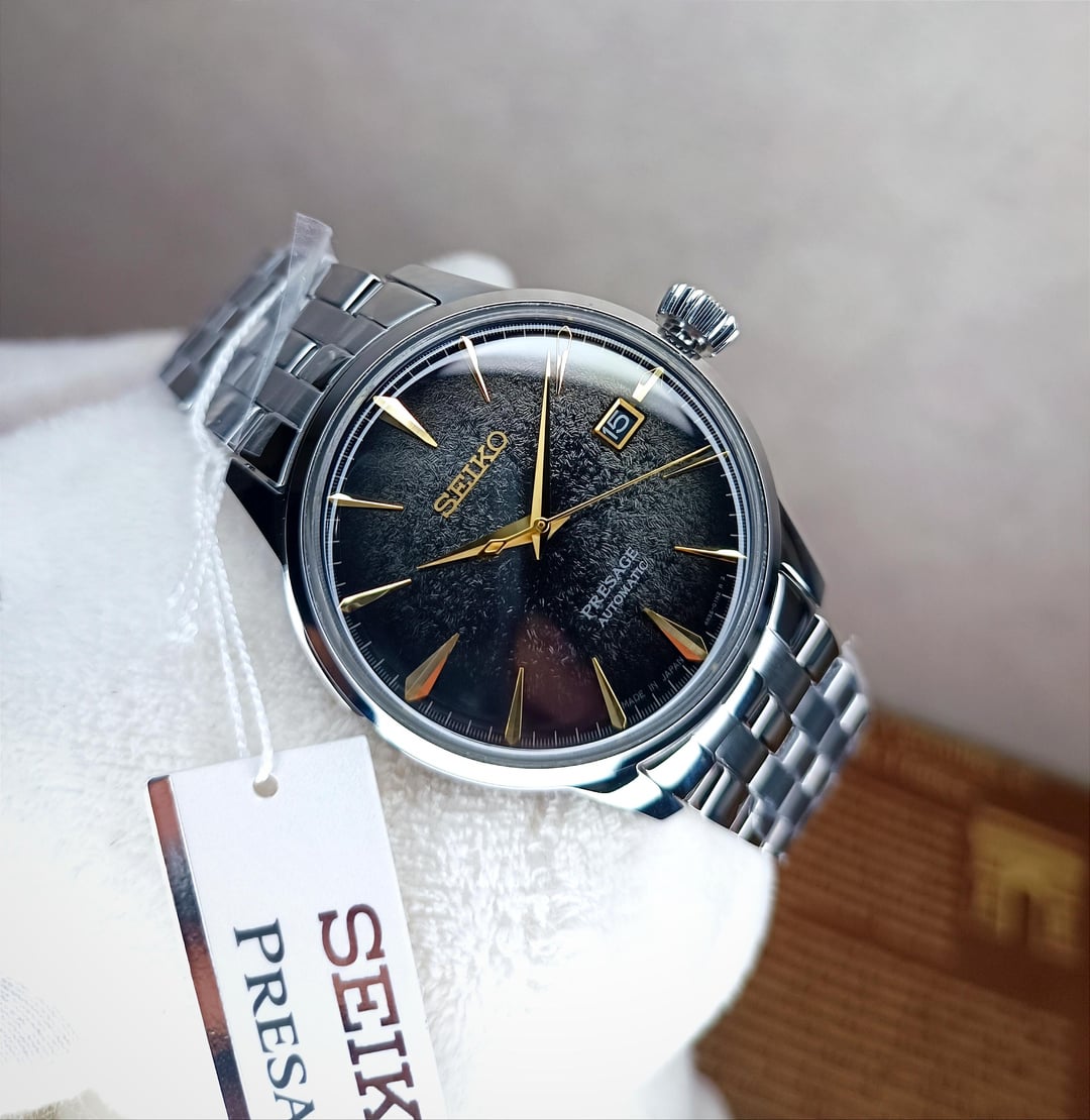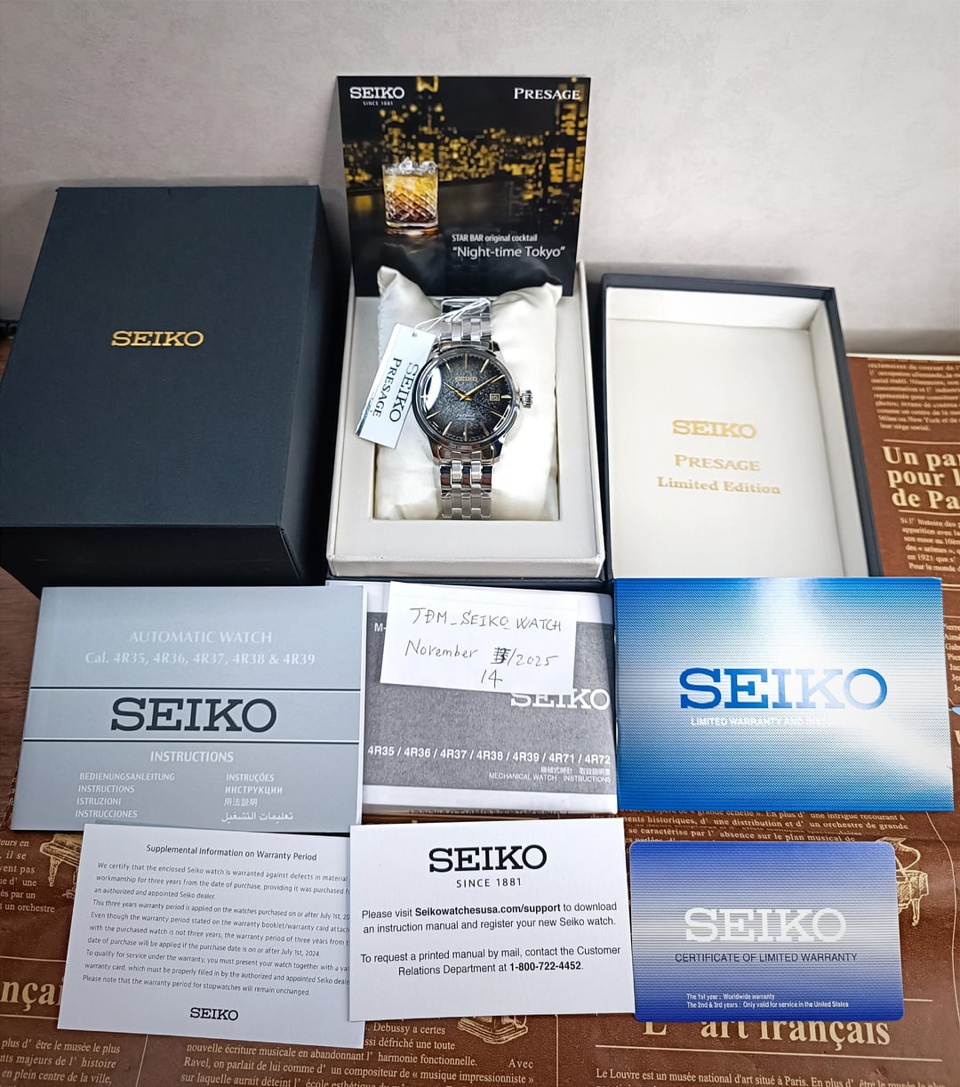 Hello r/watchexchange, I am currently selling the JDM Seiko Cocktail Time Star Bar SRPK93 (SARY245) – Night-Time Tokyo Limited Edition, in brand new, full set condition. Condition: Brand new, full box with all original papers. Still fully wrapped in factory protective stickers. Case size: 40mm | Lug width: 20mm Movement: Seiko 4R35, 41-hour power reserve, runs smoothly. Dial: Beautiful black textured dial with gold PVD indices, excellent light reflection. Crystal: Curved Hardlex Bracelet: Original stainless steel bracelet, still fully stickered. This watch was produced in 300 pieces for the Japanese domestic market and 9,000 pieces worldwide. It has completely sold out in Japan and prices have been rising significantly. I believe this is a strong collector’s piece, similar to previous limited-edition Cocktail Time models. Images / Timestamp: Included in the post! Pricing, Payment & Shipping: Price: $775 (shipping not included), no trades. Payment: WISE, PayPal F&F or G&S (+4.6% fee) Shipping: FedEx Express worldwide, 2–3 days ($50–$80 depending on location). --- Thank you!