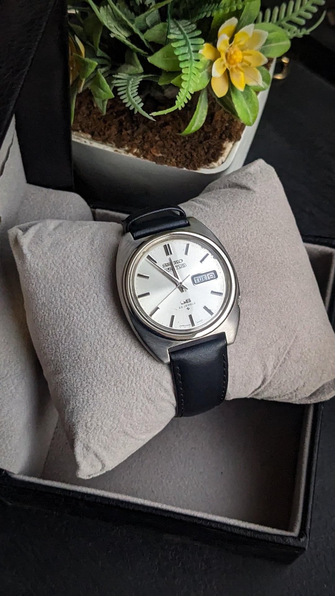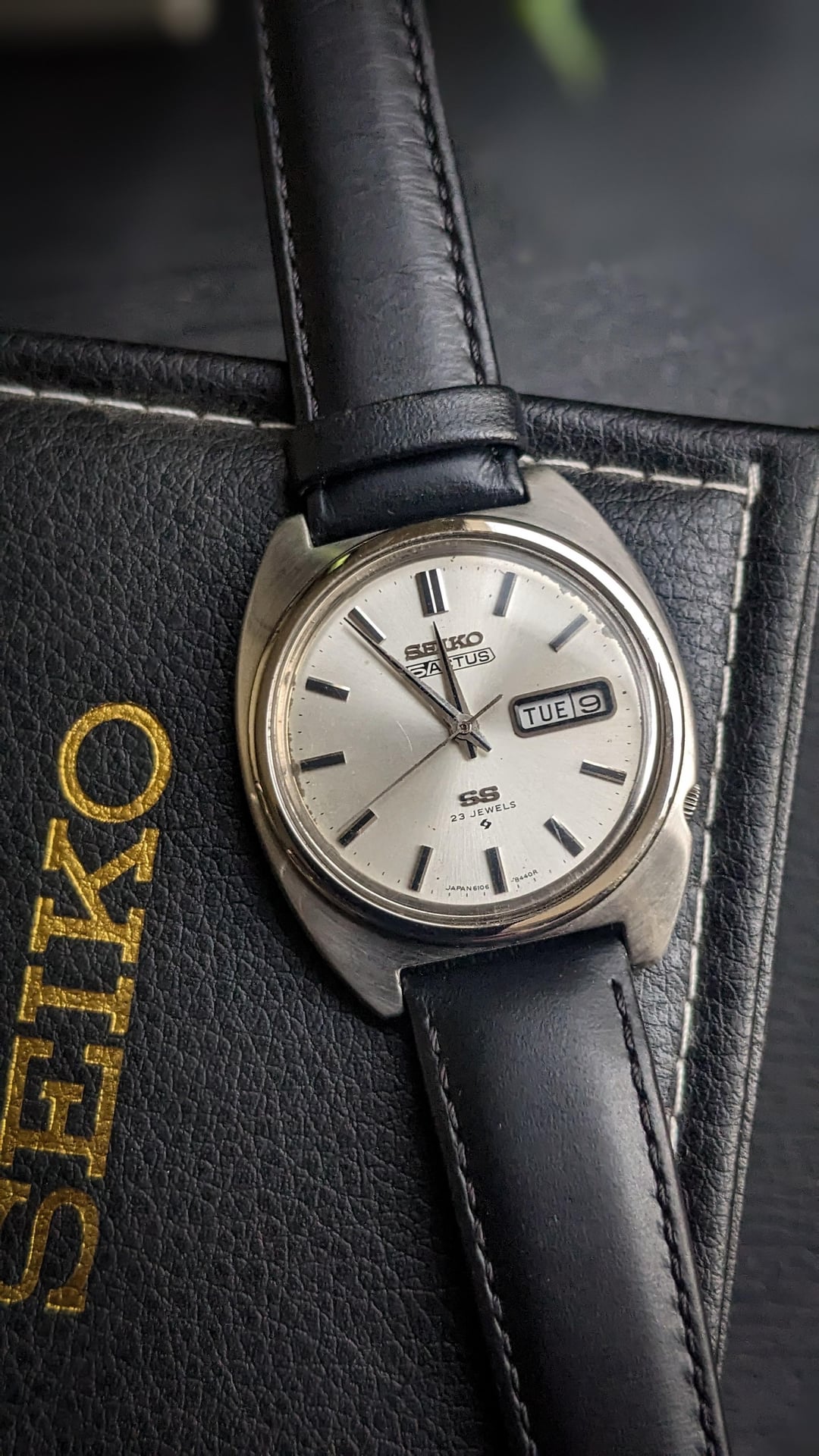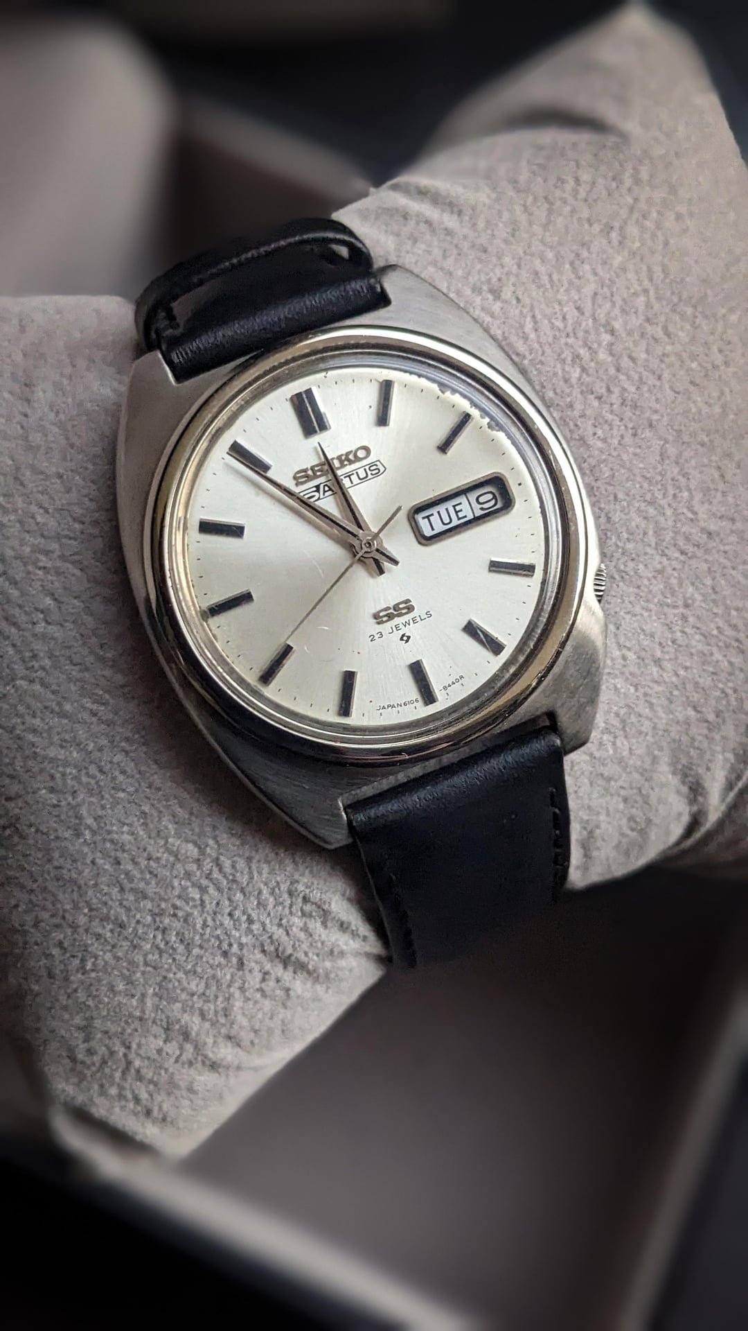 History of the Seiko 5 Actus SS The Seiko 5 Actus line was introduced in Japan in the late 1960s, positioned as a youthful yet reliable extension of the legendary Seiko 5 series. The “Actus” name was derived from the Latin word meaning “active” representing a new generation of automatic watches designed for young professionals who wanted style, performance, and everyday durability. The “SS” designation on the dial stands for Seiko Sports, emphasizing robustness and improved water resistance compared to standard dress models. The Seiko 5 Actus watches were part of Seiko’s effort to appeal to the growing domestic market, particularly among university students and young office workers in 1970s Japan. Produced by the Suwa Seikosha factory (indicated by the Suwa logo above 6 o’clock), this model ,reference 6106-8420 , houses the reliable Caliber 6106 automatic movement working fine not serviced known for its 23 jewels, day-date function, and hacking seconds feature. The tonneau-shaped case and minimalist silver sunburst dial reflect the bold yet refined design trends of early 1970s Japanese horology. Description Brand: Seiko Model: Seiko 5 Actus SS (Sports) Reference: 6106-8420 Movement: Automatic, Seiko Cal. 6106 (23 Jewels, hacking seconds, quickset day/date) not serviced Production Era: Circa 1970 Manufacture: Suwa Seikosha, Japan Dial: Silver sunburst finish with applied bar indices and baton hands Case: Stainless steel tonneau case, brushed and polished surfaces Crystal: Acrylic (domed) Water Resistance: “Water Resistant” (original factory rating) Strap: Black leather (aftermarket replacement) Case Back: Screw-down stainless steel with Seiko 5 Actus engraving Functions: Hours, minutes, seconds, day-date (English/Japanese display) Timestamp:https://imgur.com/a/UrnHZts Price $275