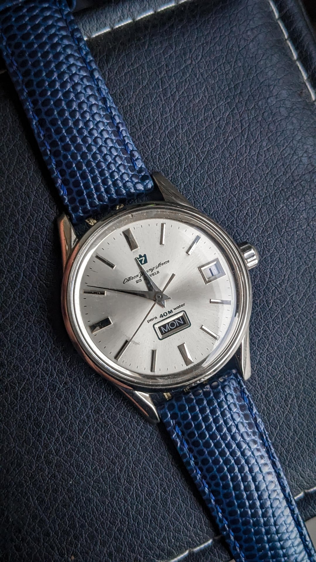History of the Citizen Young Seven The Citizen Young Seven line was introduced in the late 1960s to early 1970s, during the golden age of Japanese mechanical watchmaking. At that time, Citizen sought to create a watch series that blended precision engineering, youthful style, and durability. The “Young Seven” was aimed at younger professionals who admired mechanical craftsmanship but wanted something versatile and water-resistant enough for daily use. The “Seven” in its name symbolized seven key features that defined Citizen’s new generation of automatic watches: automatic winding, day-date function, shock resistance, water resistance, anti-magnetic design, durable case, and precision timekeeping. This particular reference, YSEN 51301-T, is a JDM (Japan Domestic Market) exclusive, meaning it was sold only within Japan and rarely exported, making it highly collectible today. Movement is 23 jewels automatic working fine good for daily Usage (not serviced) Description Brand: Citizen Model: Young Seven Automatic Reference: YSEN 51301-C Origin: Japan (JDM Model) Movement: Automatic (23 Jewels) with manual winding option Functions: Hours, minutes, seconds, day-date (English) Dial: Silver sunburst finish with applied bar indices and baton hands Case: Stainless steel, polished finish Crystal: Acrylic domed crystal Water Resistance: Para 40M Water (original rating) not tested Strap: Blue leather strap (replacement, not original) Approximate Production Era: Late 1960s - early 1970s Timestamp: https://imgur.com/a/UrnHZts Price $320