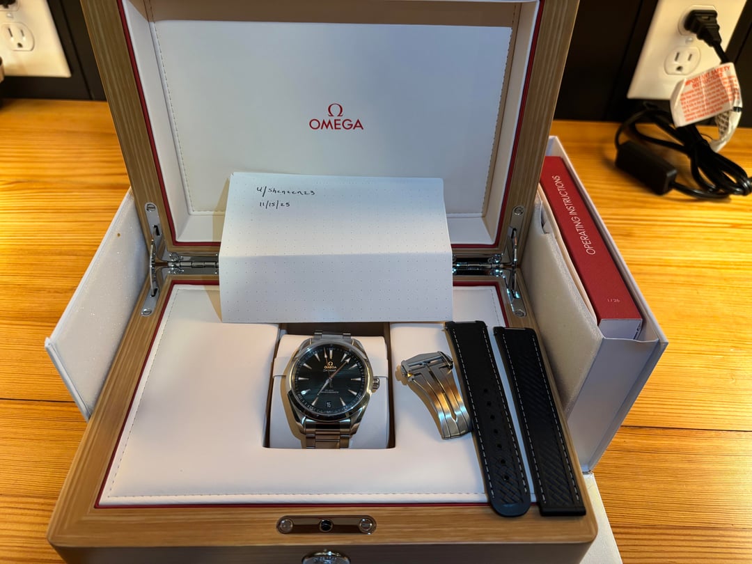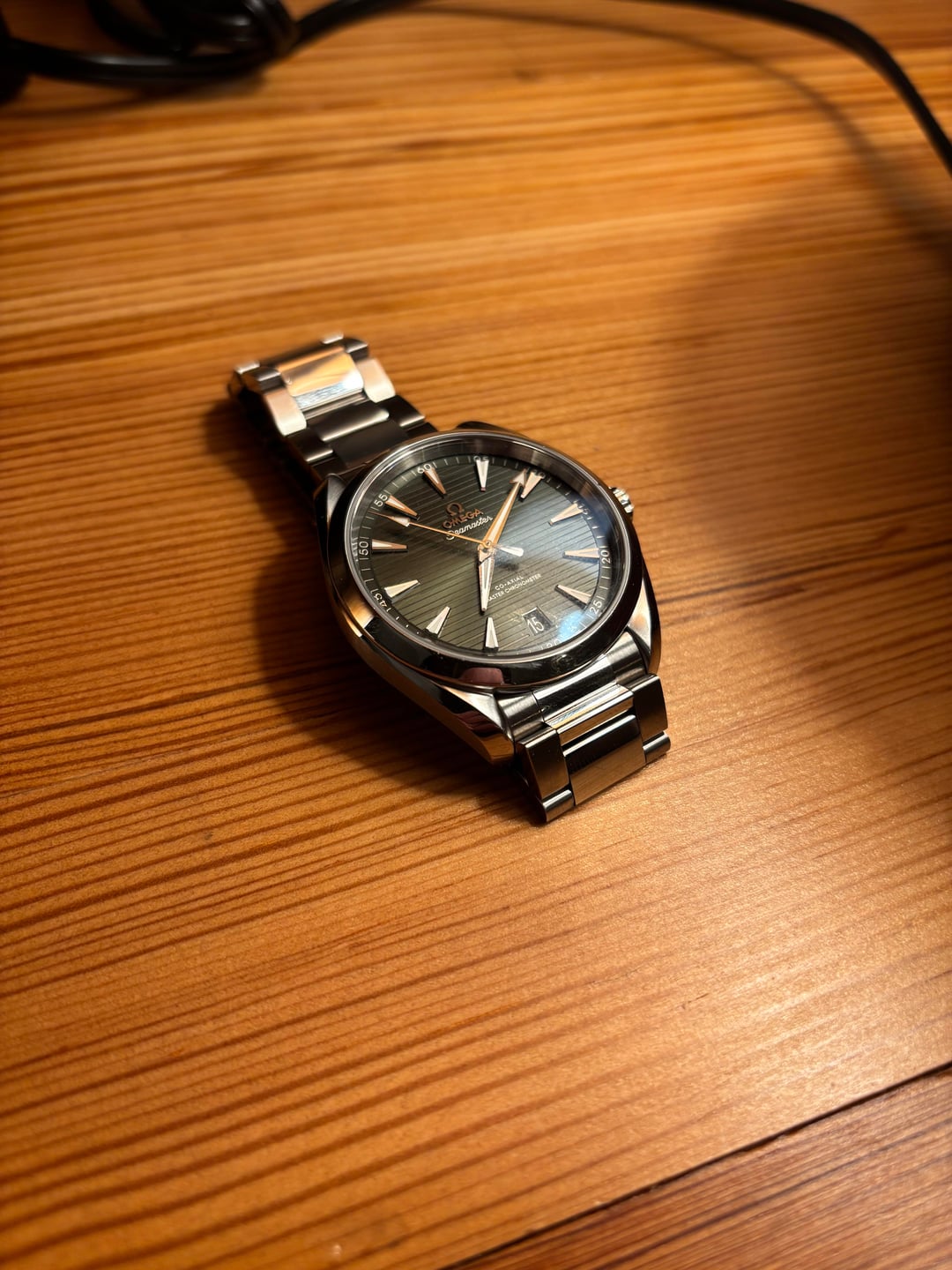 I am selling my 41mm Omega Aqua Terra in green teak, ref. 220.10.41.21.10.001. The watch includes OEM bracelet (with all links included, currently sized for a 6.75” wrist) and I will also include an aftermarket rubber strap with clasp. Inner/outer box and papers included. The watch is less than two years old (Mar. 2024 purchase) so has three + years of warranty remaining. There is a small ding on the bezel above 3 o clock that I tried to highlight in the pictures, but is hard to notice in normal viewing. Otherwise the watch is in excellent condition. Movement running within METAS/COSC certified spec. $3975 shipped CONUS. Zelle or wire preferred, can also do PayPal G&S for a 3% fee. Please reach out with any questions!