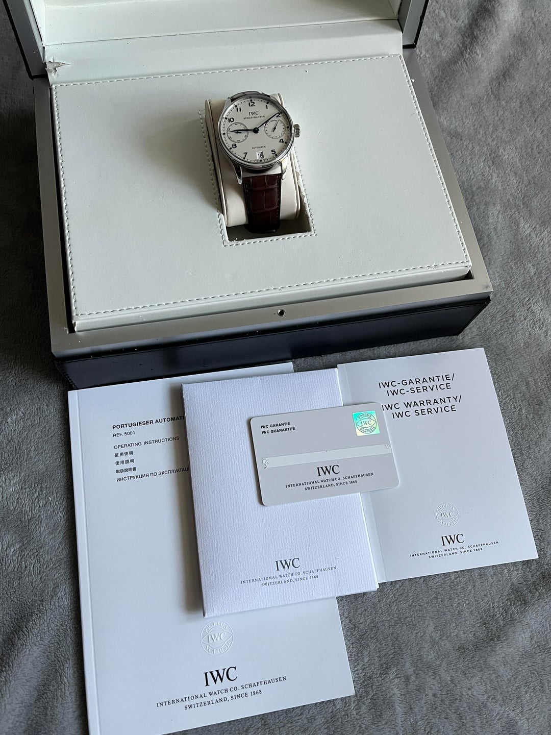 For sale - IWC Portuguese 7 Days 500107 Fully serviced by IWC in September 2025 (service cost was nearly $1,000, the receipt is included). Like new condition. The IWC strap is brand new. Comes with full set - box, papers, warranty card, microfiber cloth, service receipt. Priced to sell at $4,700 shipped (**no trades please**). Thanks for looking!