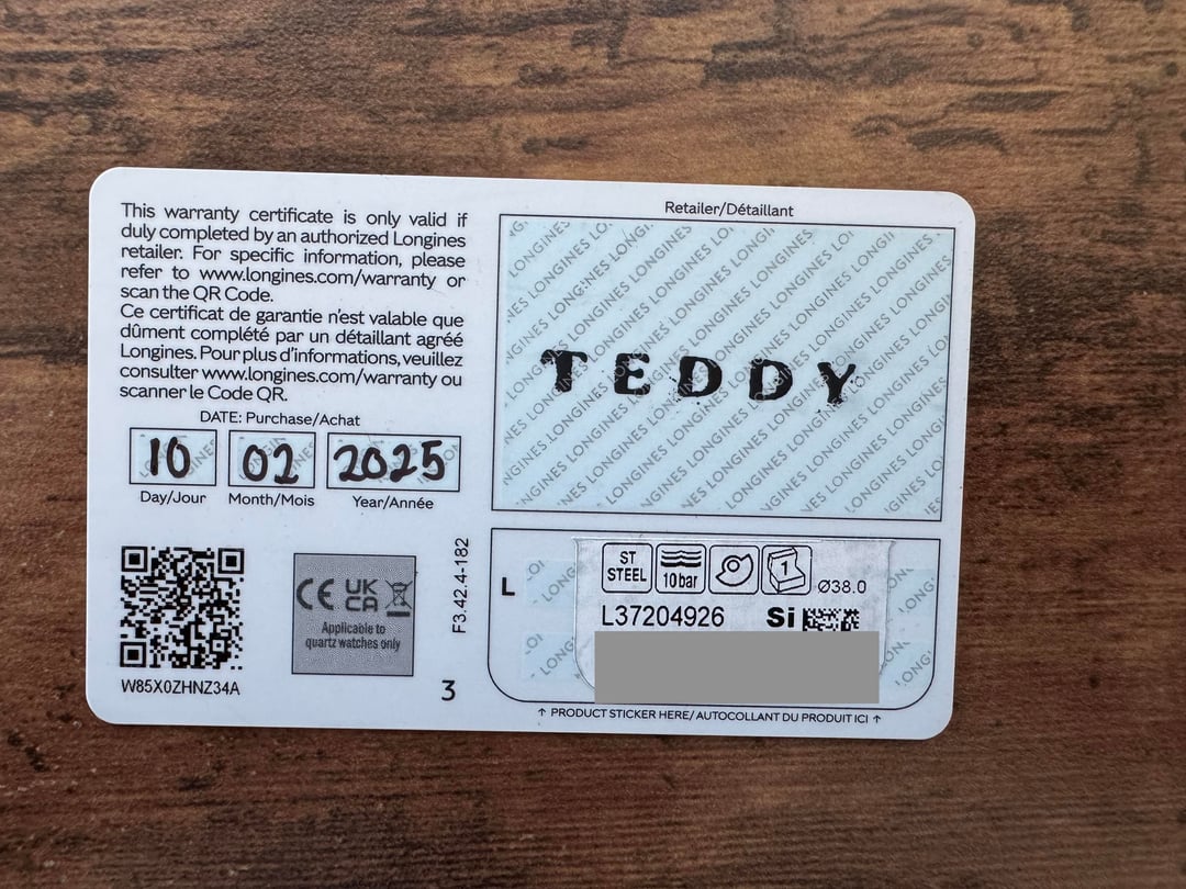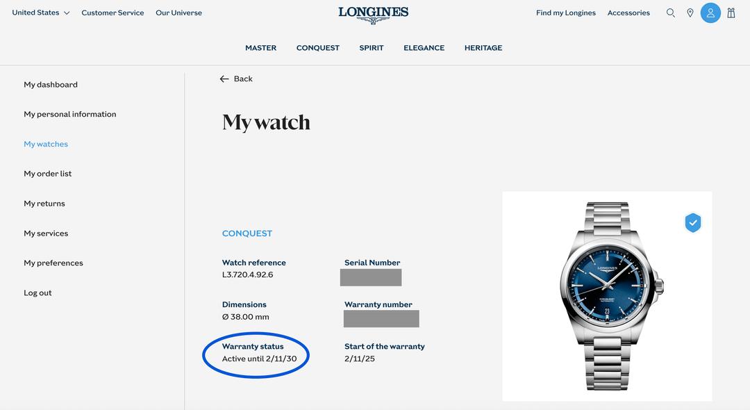 Located in the U.S. For Sale: Longines Conquest 38mm Blue dial. Excellent condition. Under warranty until 2030! Beautiful watch. I have gotten a lot of compliments. Purchased from an AD (Teddy - see card in pic), not grey market. Under warranty until 2030 (see screenshot). Comes in original box with original papers and tags. Extra links. Runs very accurately at \~1 sec / day. Model: L3.720.4.92.6 Specs: 38mm, Thickness 10.9mm, Lug to lug 46.8mm, Lug width 19mm, Movement L888 caliber, 72 hour power reserve, Screw down crown. Note: it has a very light scratch on the dial (see pic - I did my best, as the scratch is very light). Nobody has ever noticed, but I want to be upfront and honest.