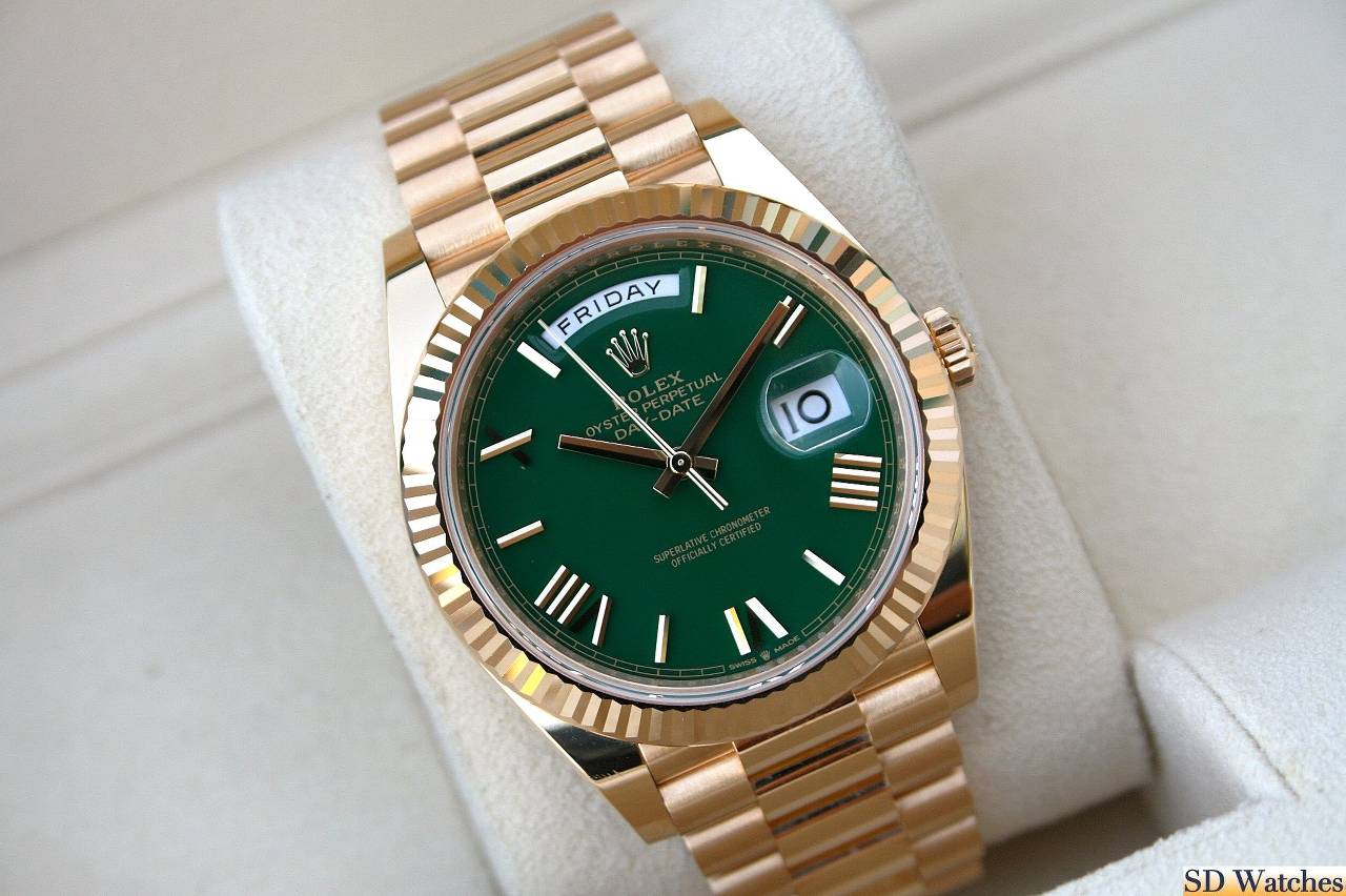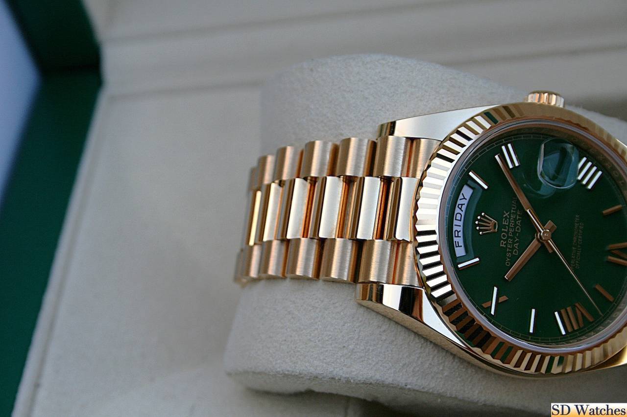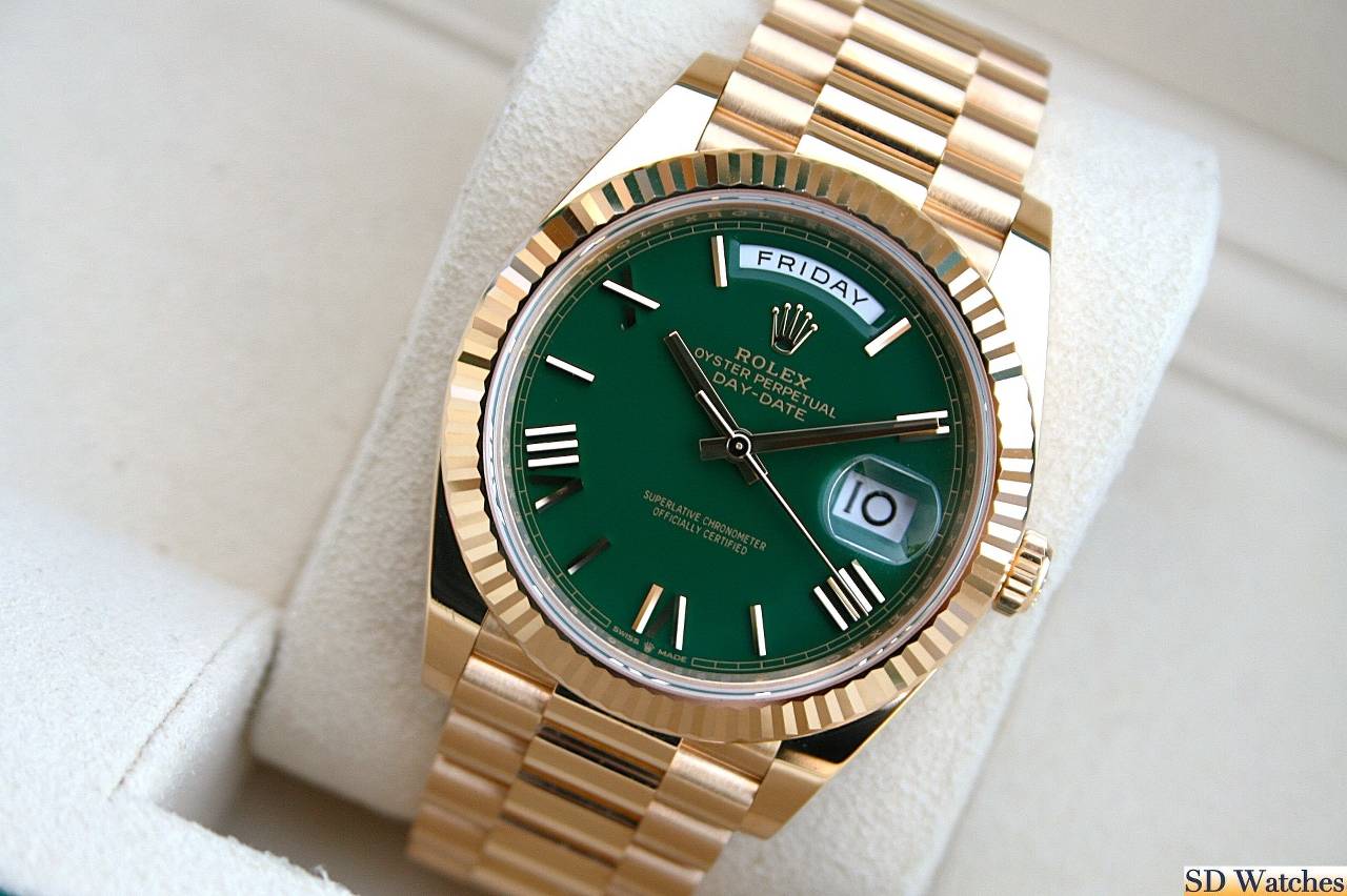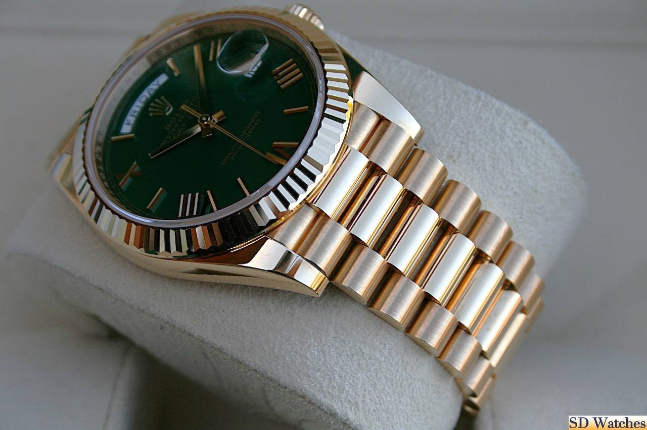 This watch comes in 18K Yellow gold, 40MM case with President band and Green Roman known as Green Money dial and a fluted bezel.